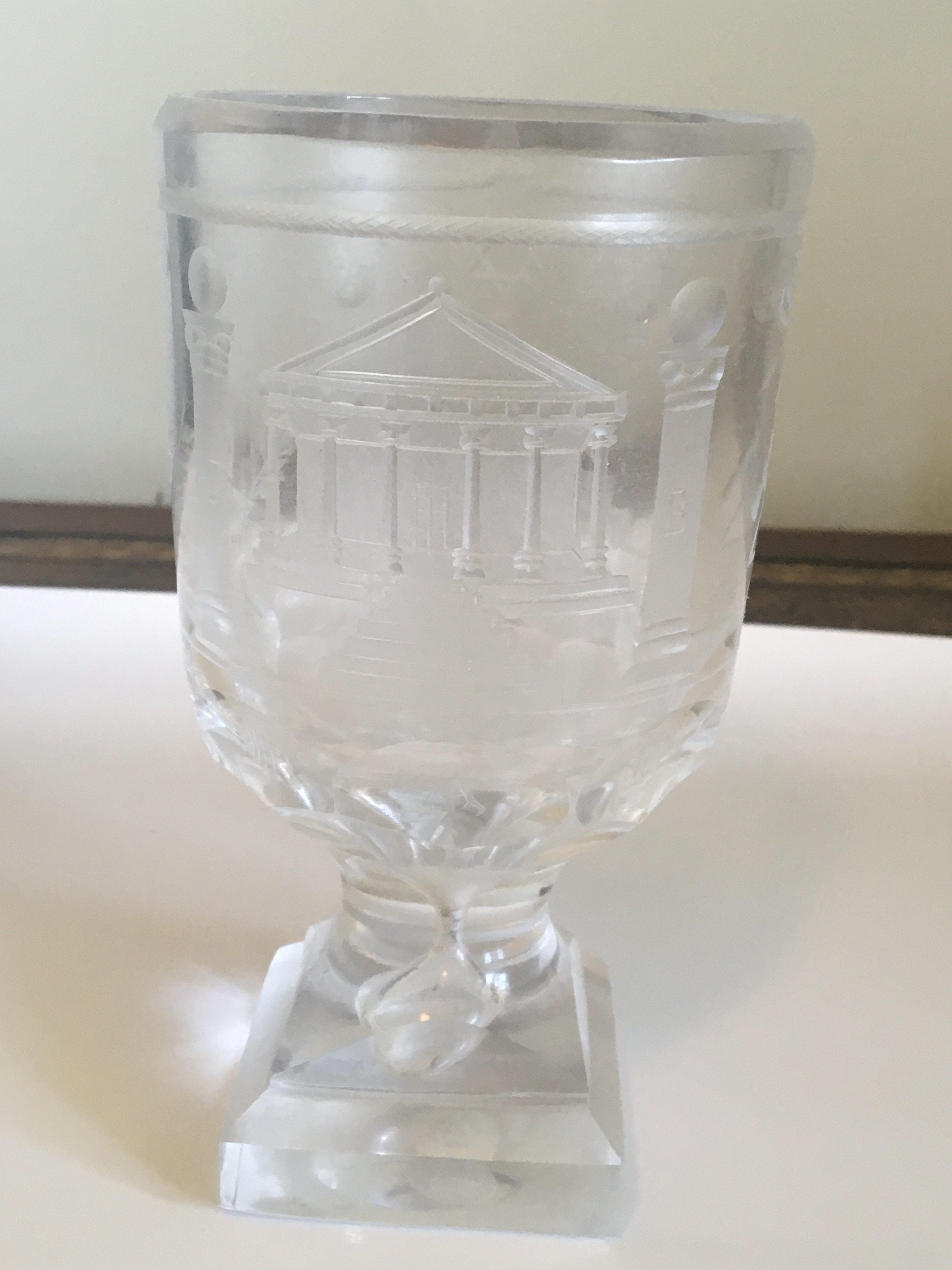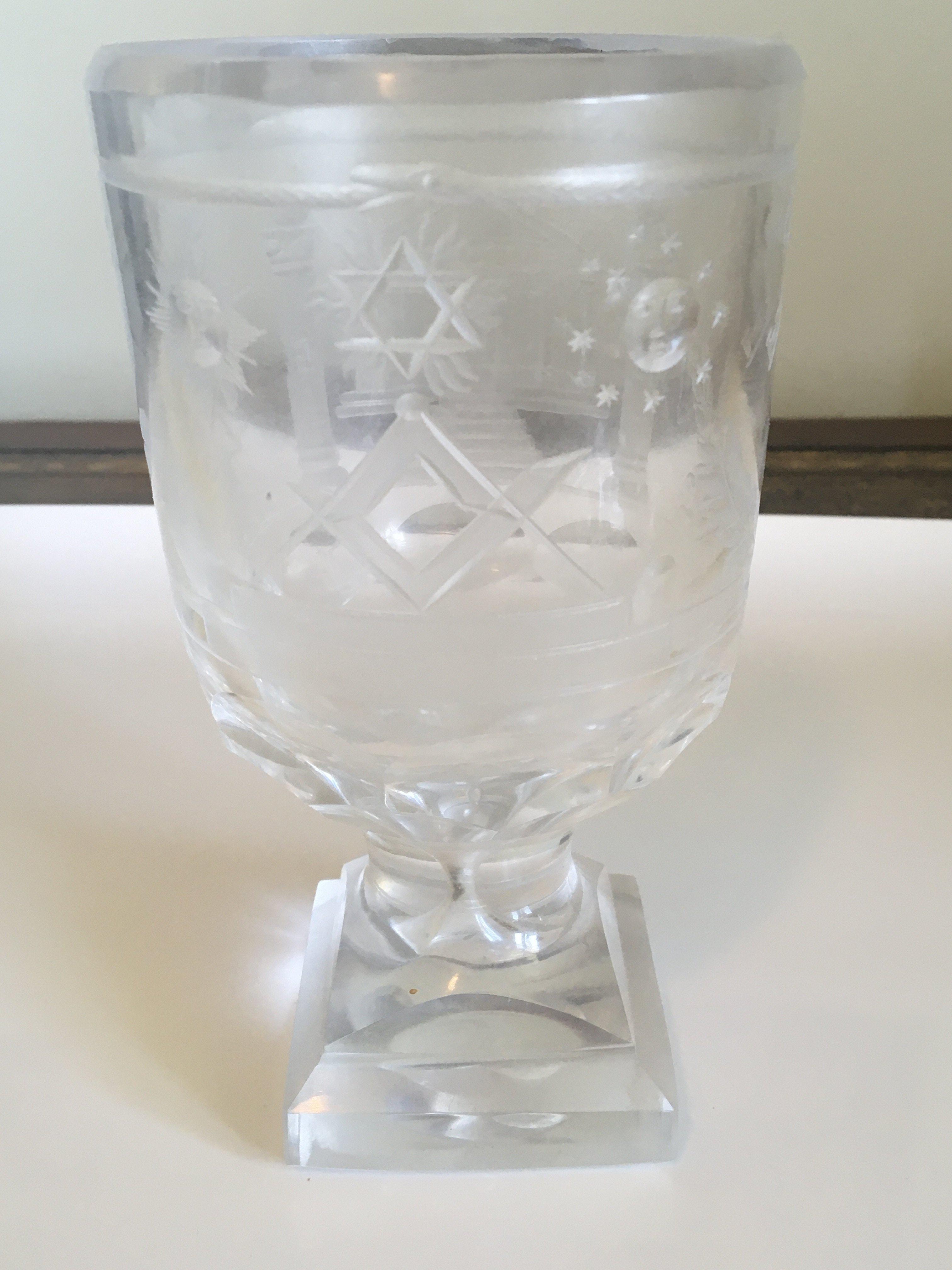 A 19th century Masonic firing glass or presentation glass with a stepped square base the sides wheel etched with a temple and other Masonic symbols.