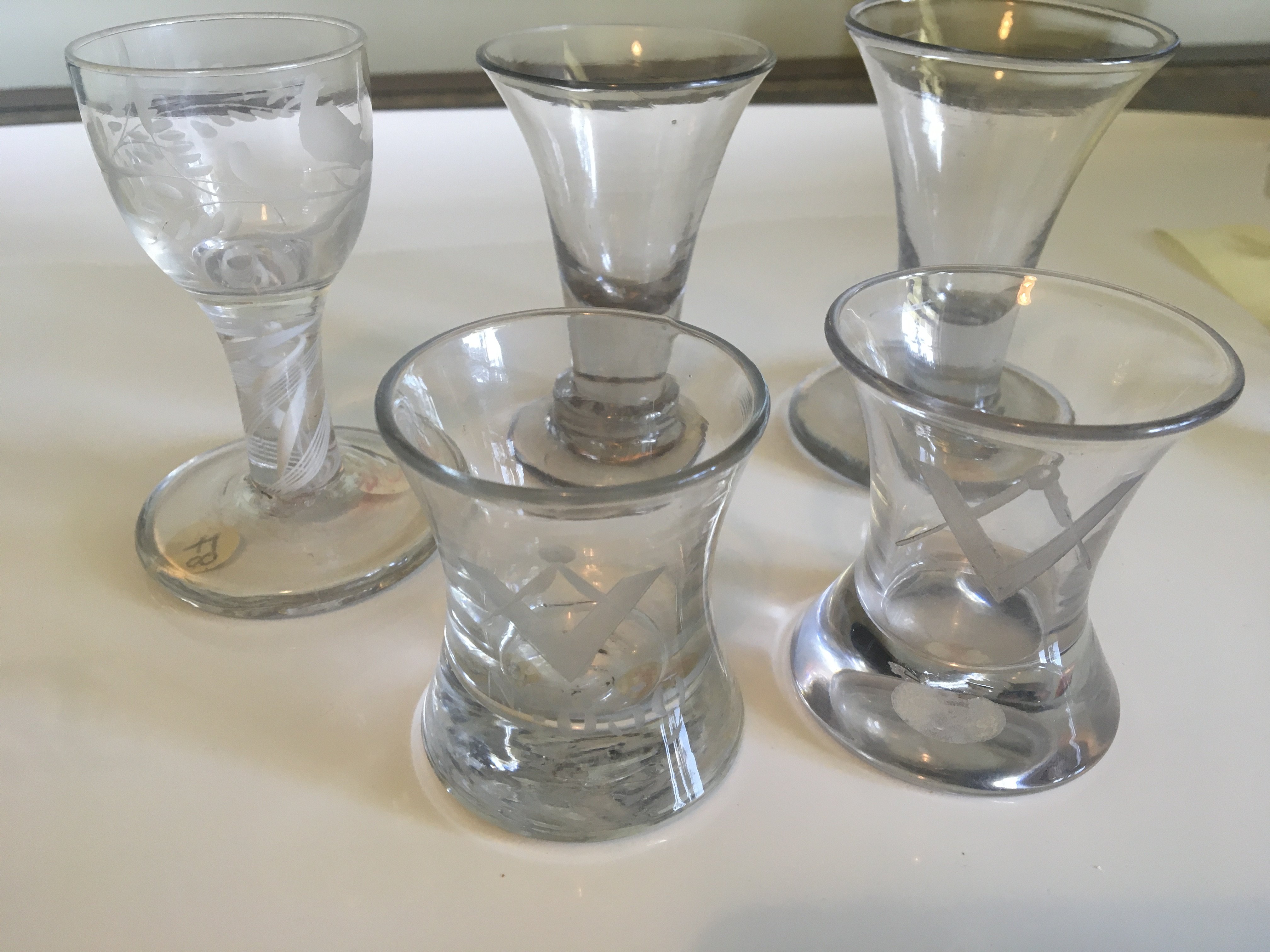 An 18th century glass with opaque air twist stem etched with exotic birds two Masonic shot firing glasses and two other conforming late 18th century glasses. (5)
