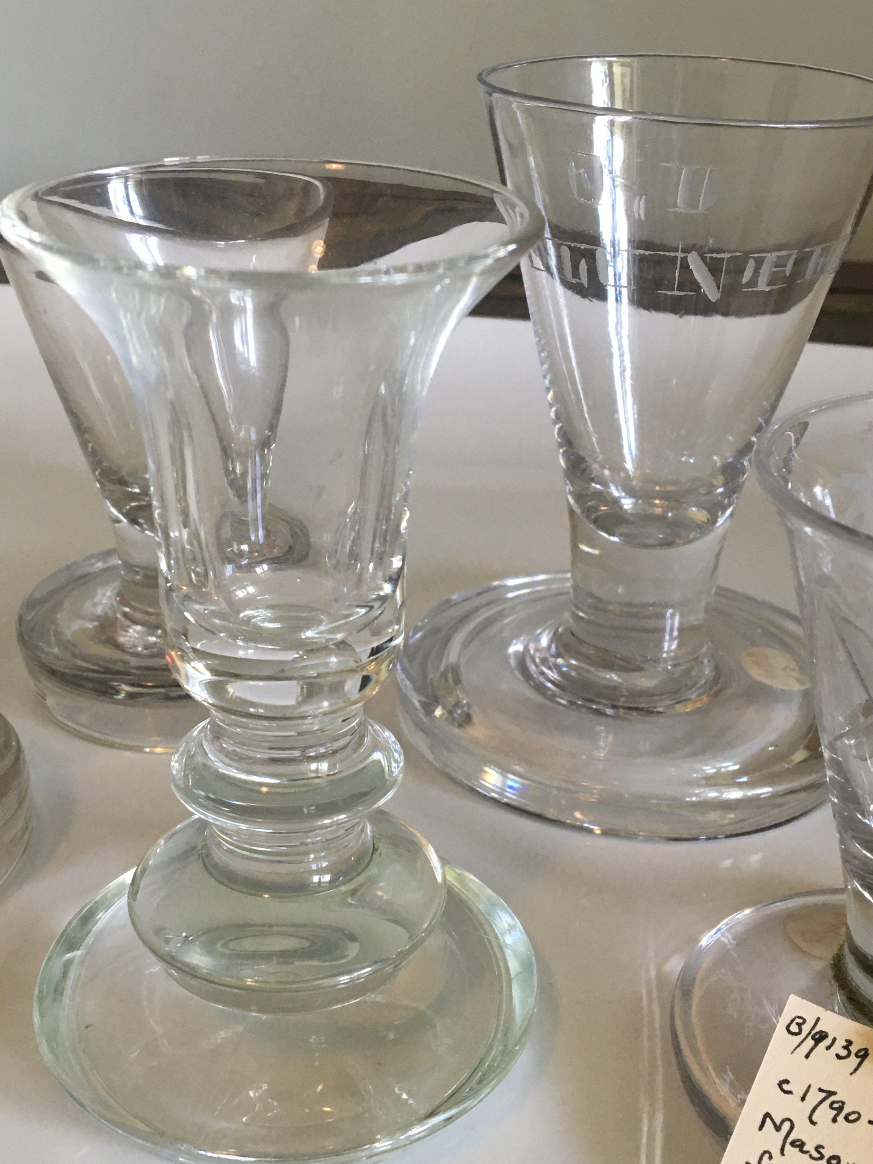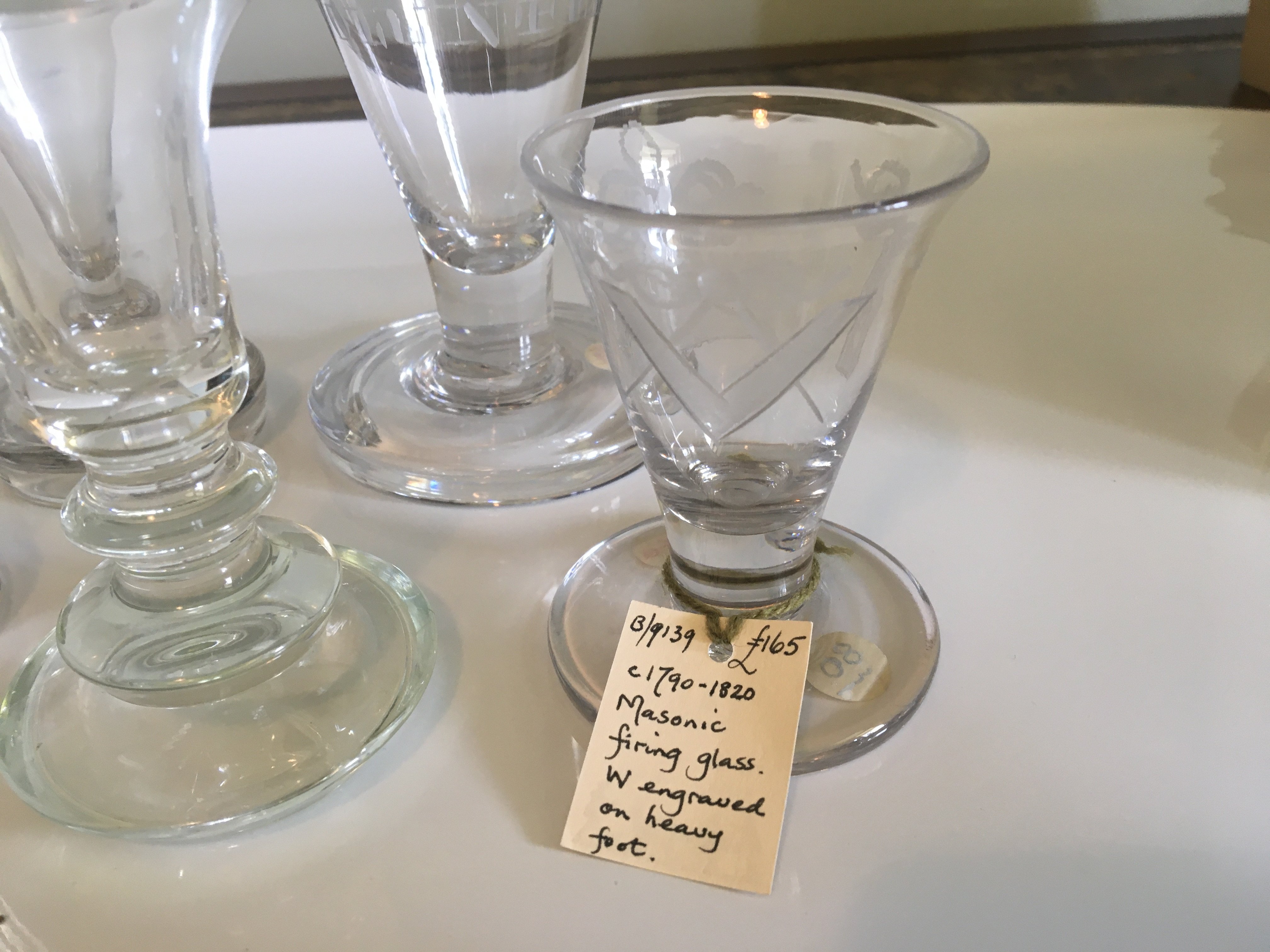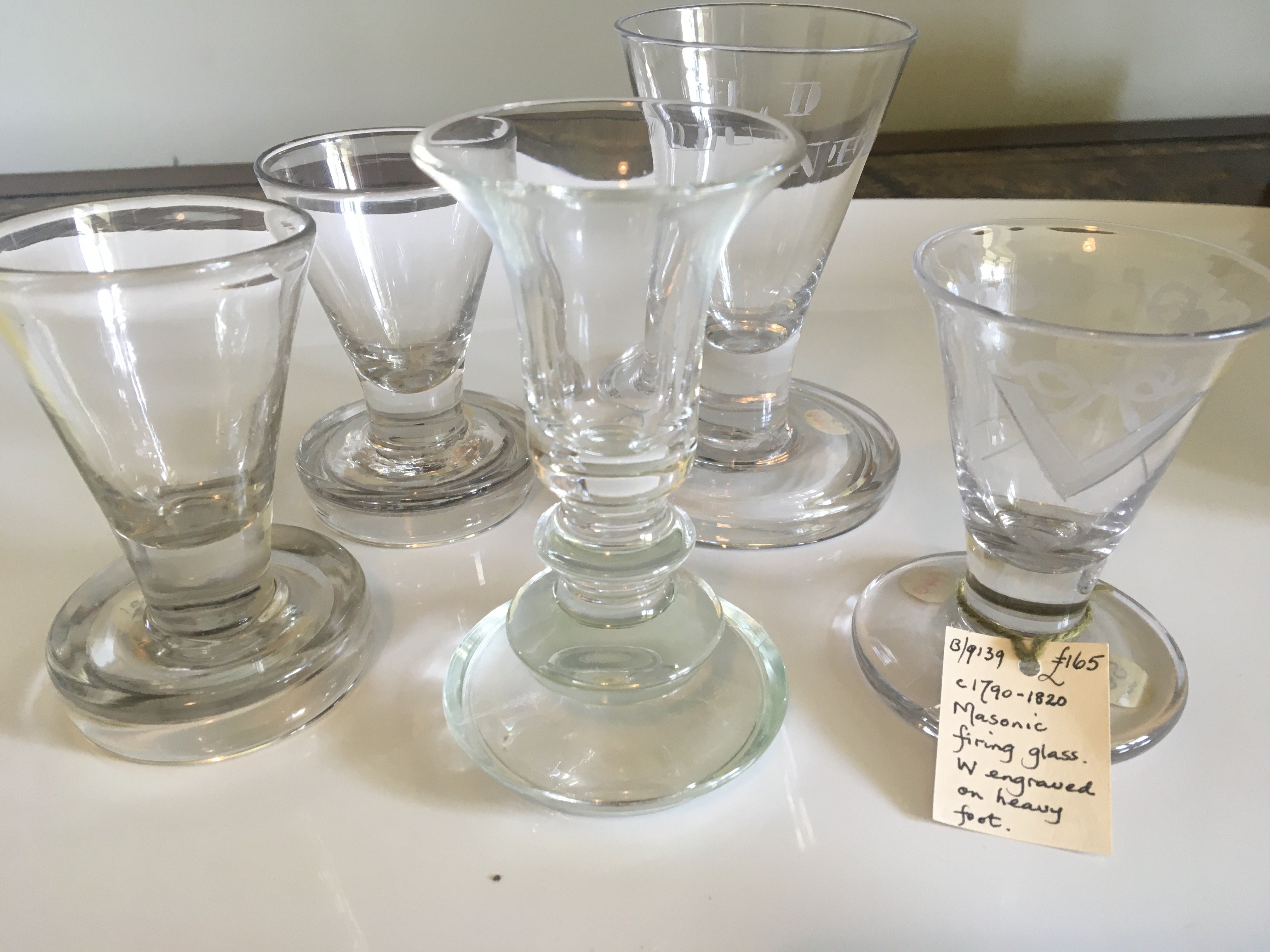 A collection of five Masonic and other firing glasses 18th century and later two with etched sides. One with a circular three tier base. (5)