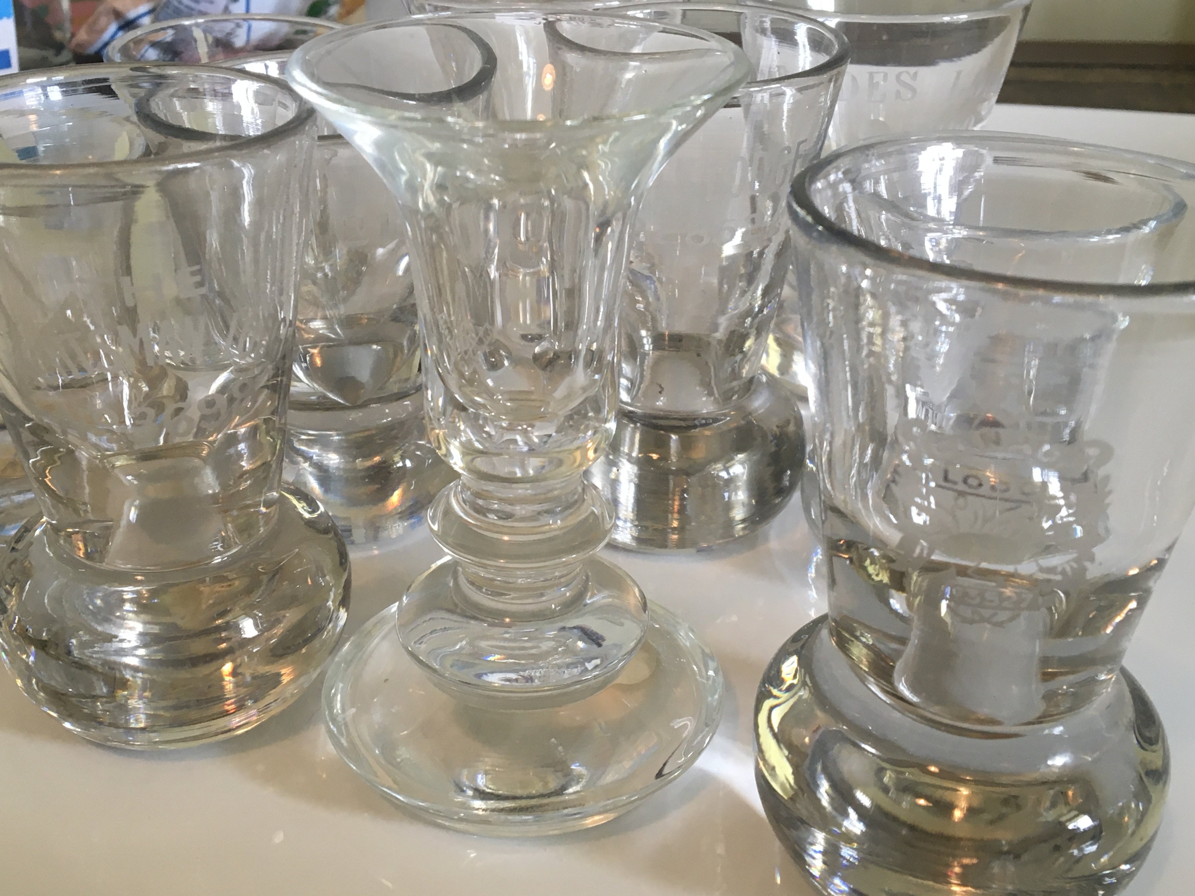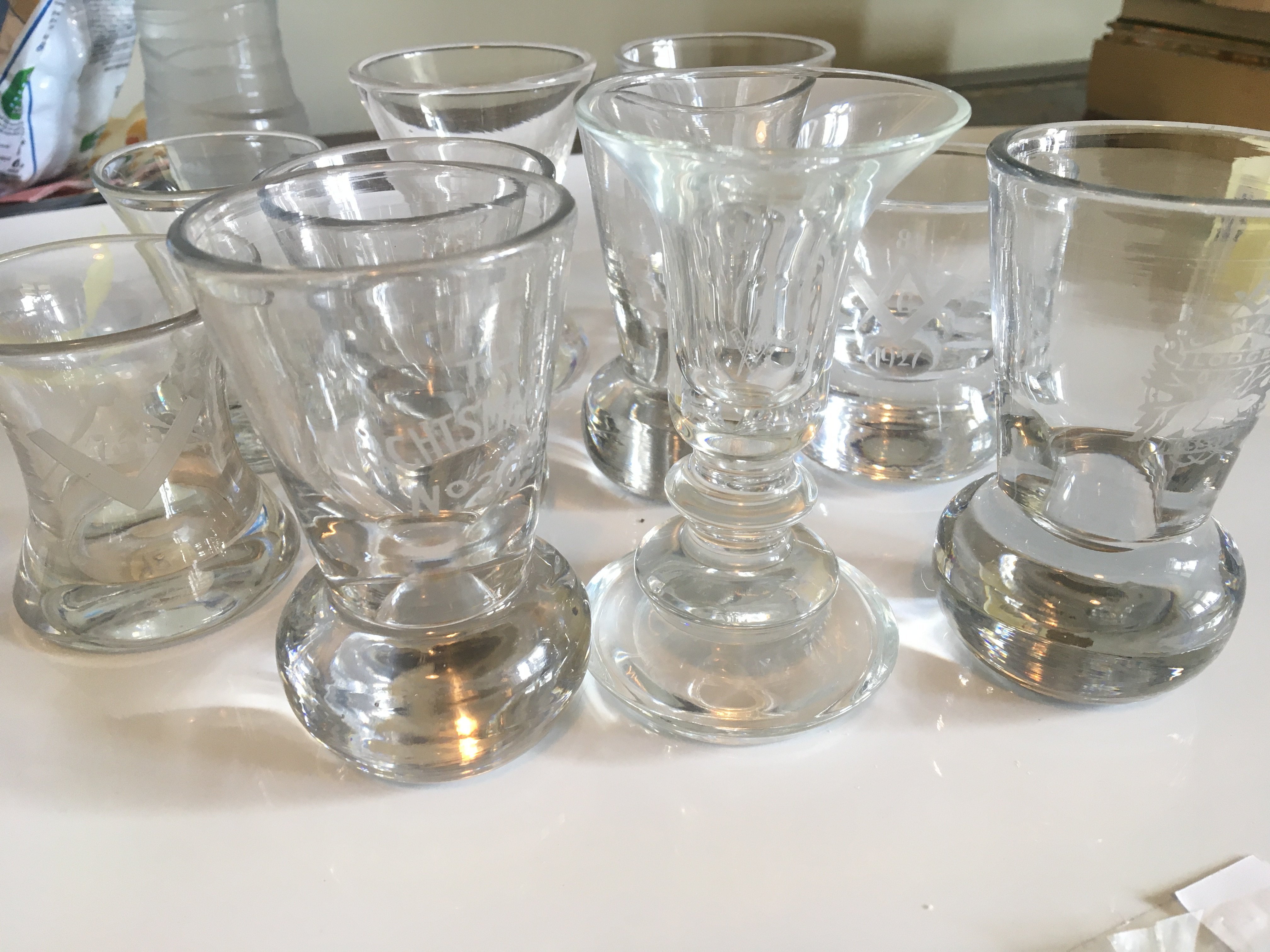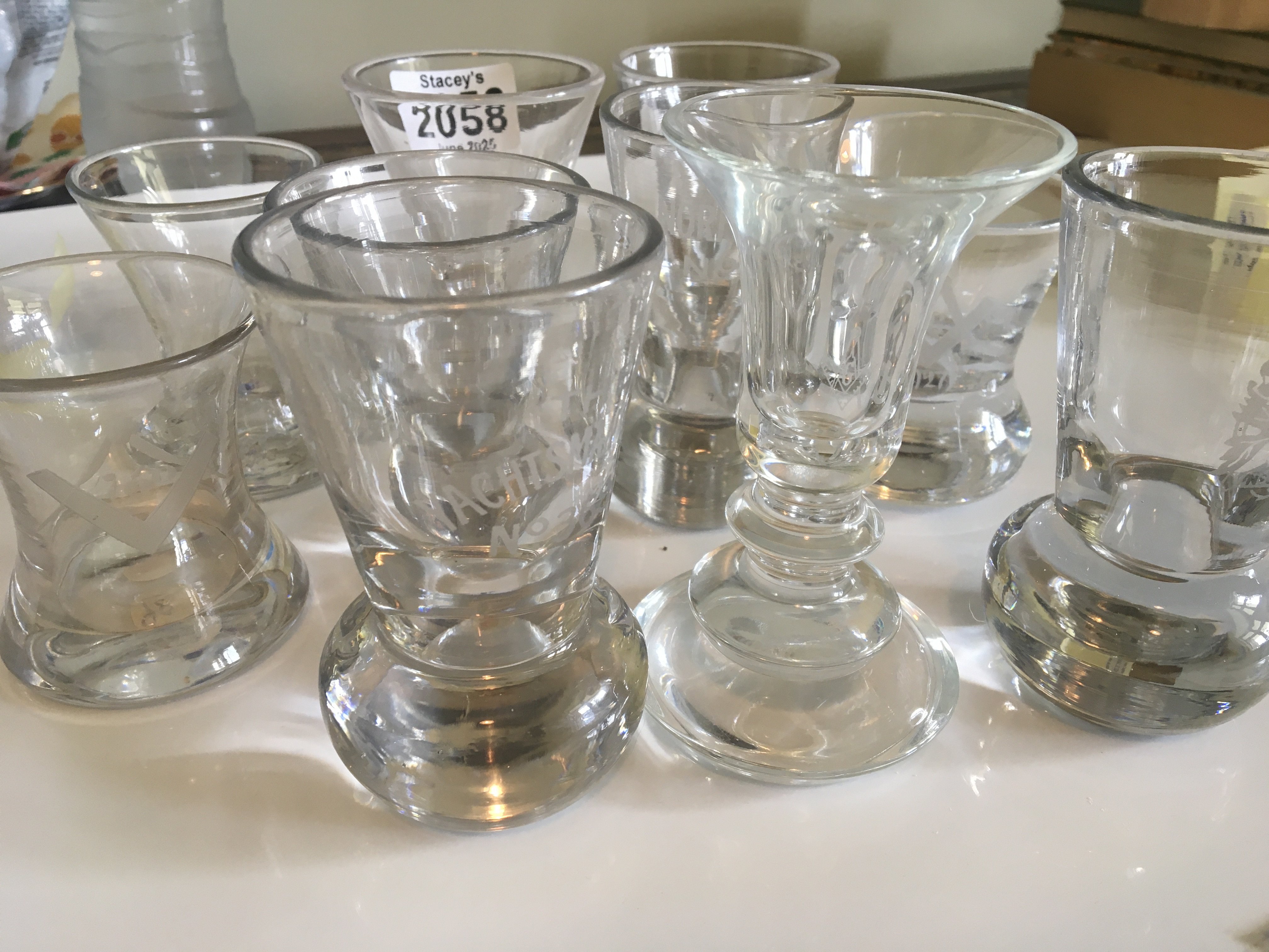A collection of Masonic shot firing glasses 19th and early 20th century Commanders Lodge Canada Lodge Norfolk lodge and others. (10)