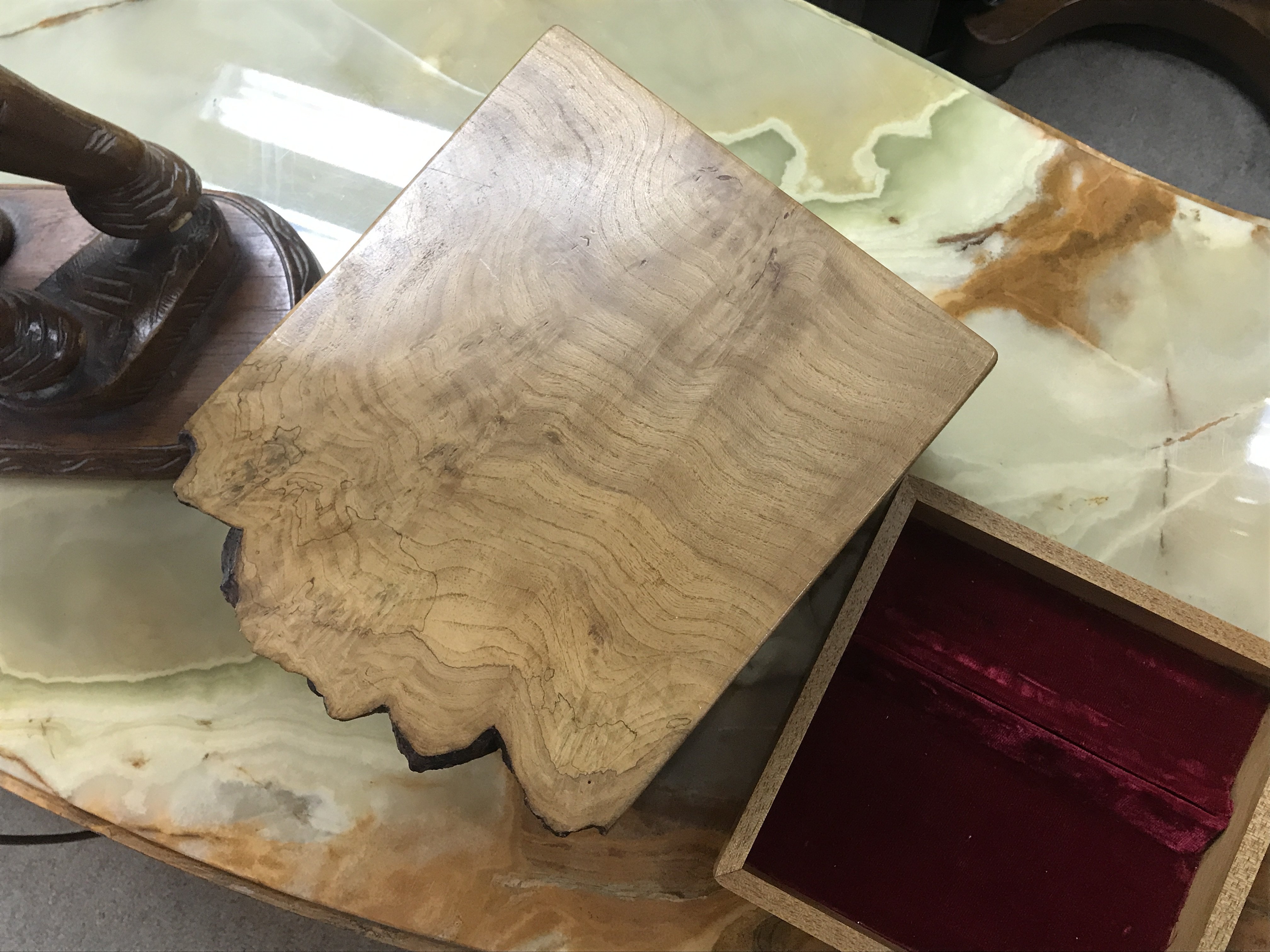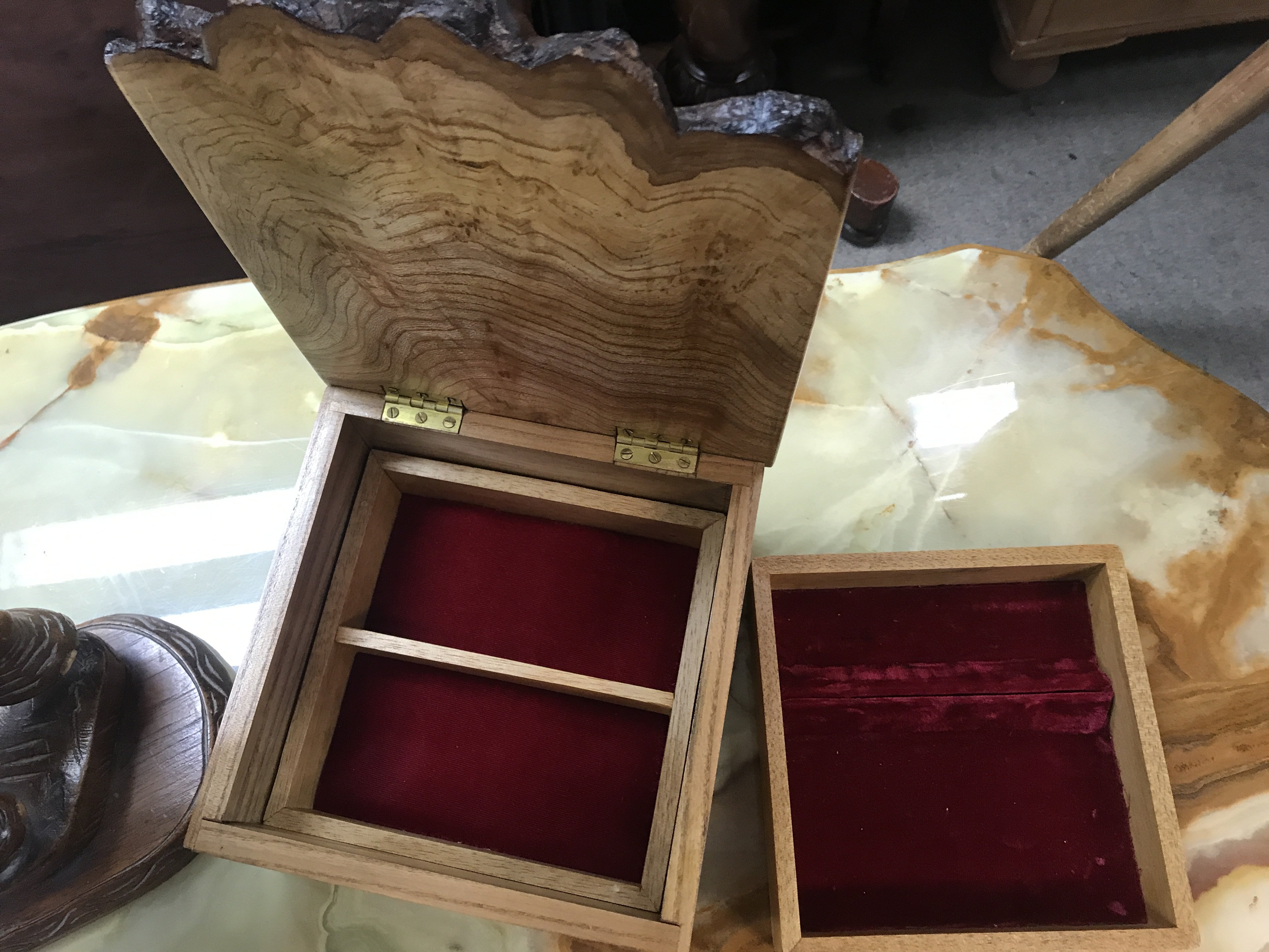 Modern walnut box with fitted interior and carved elephant lamp. This lot cannot be posted