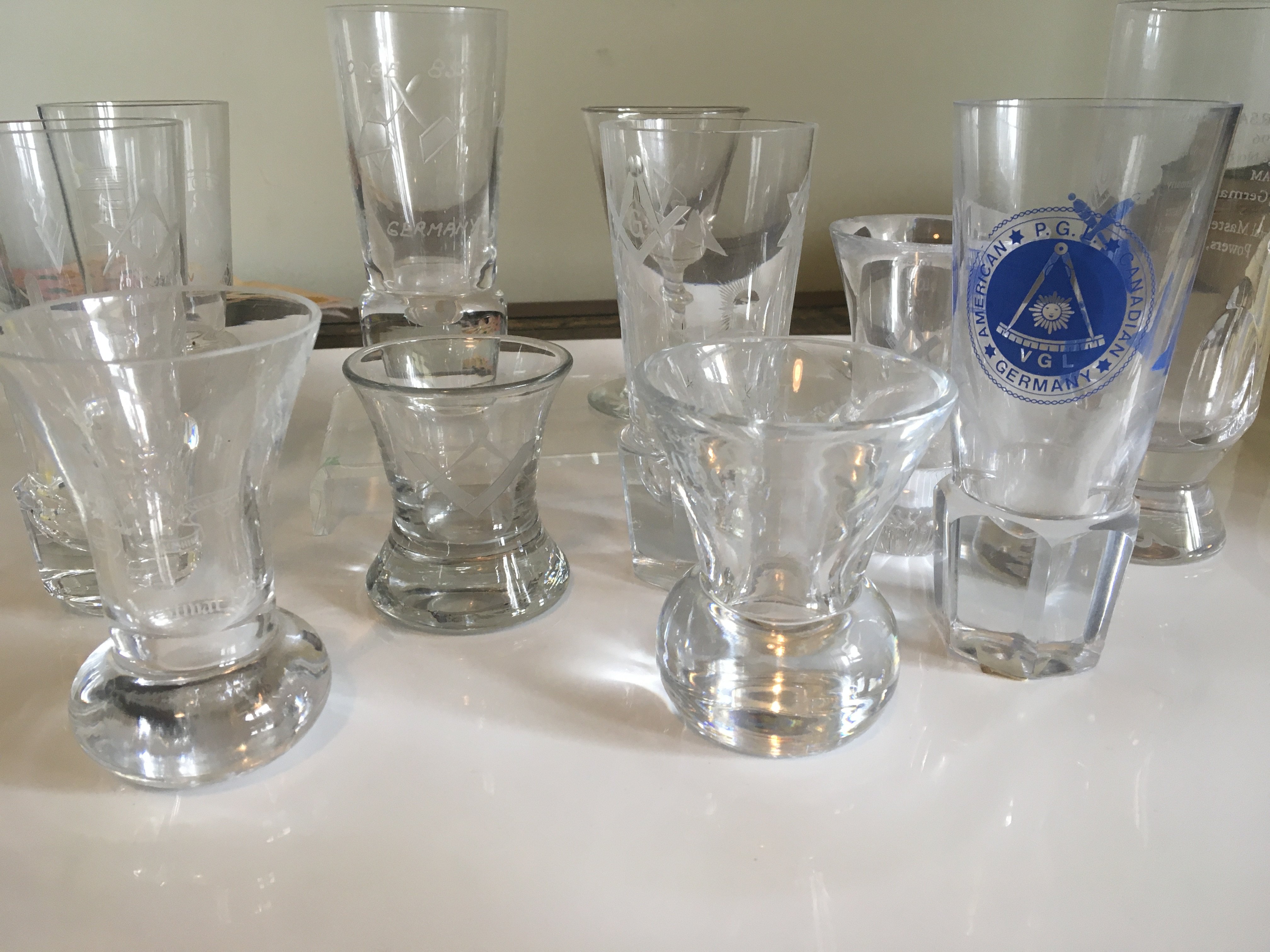 A collection of Masonic acid and wheel etched glasses and shot firing glasses. (12)