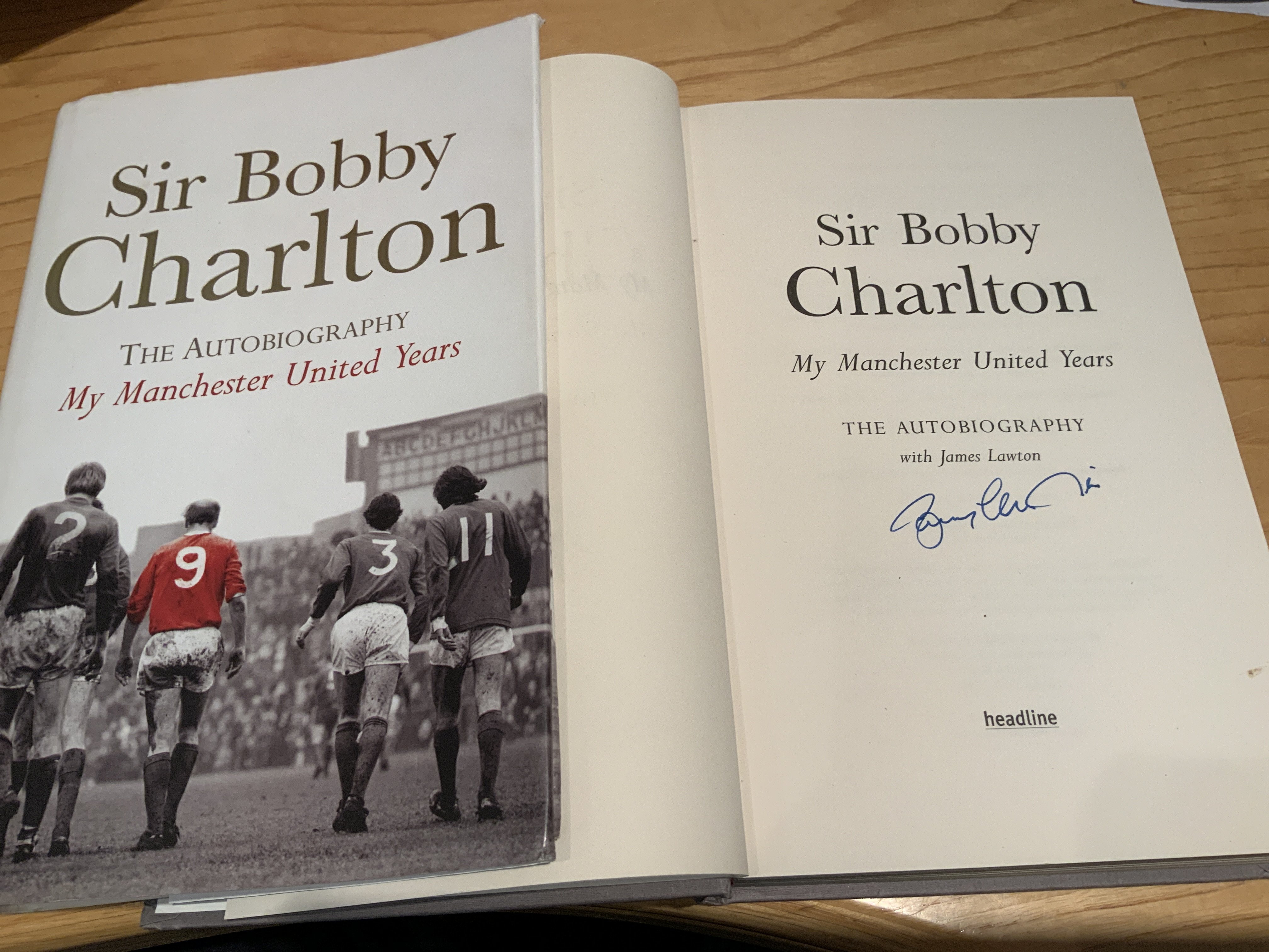 Bobby Charlton Multi Signed Manchester United Football Book: Sir Bobby Charlton Manchester United Years signed inside by himself. Also on first blank page it is signed by some of his Man Utd team mates to include Foulkes Crerand Stepney Aston Dunne Sadler Law and Stiles. All without dedication.