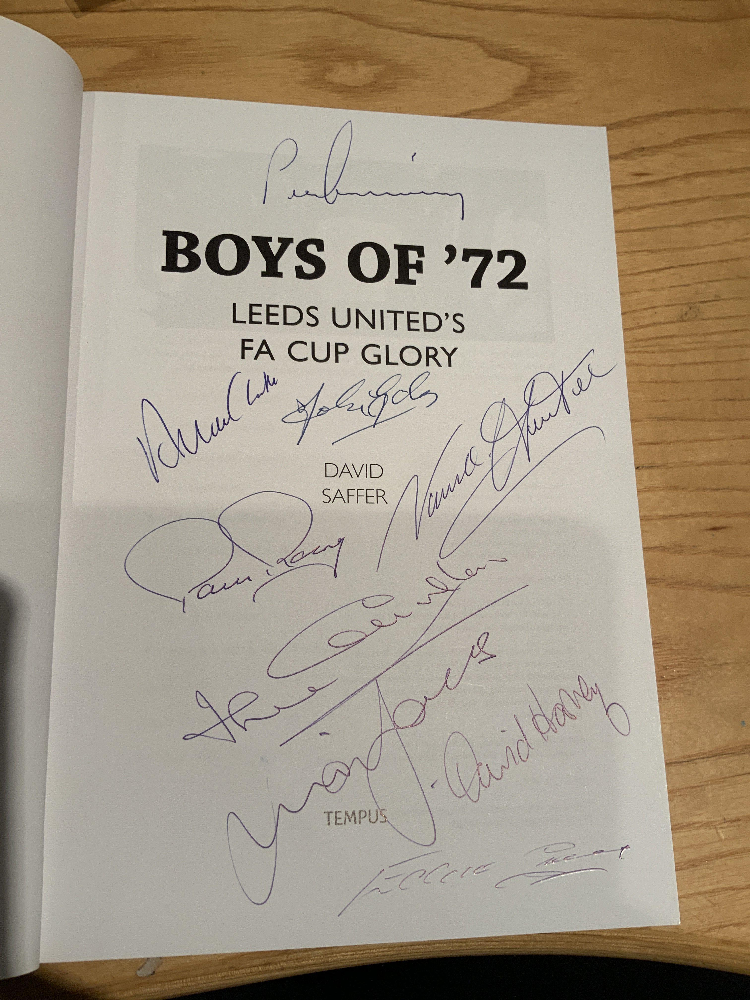 Boys Of 72 Leeds United Multi Signed Football Book: Excellent soft cover book signed on one page by 9 players including Hunter Gray Clarke Reaney Harvey Charlton and Jones. COA from reputable source.
