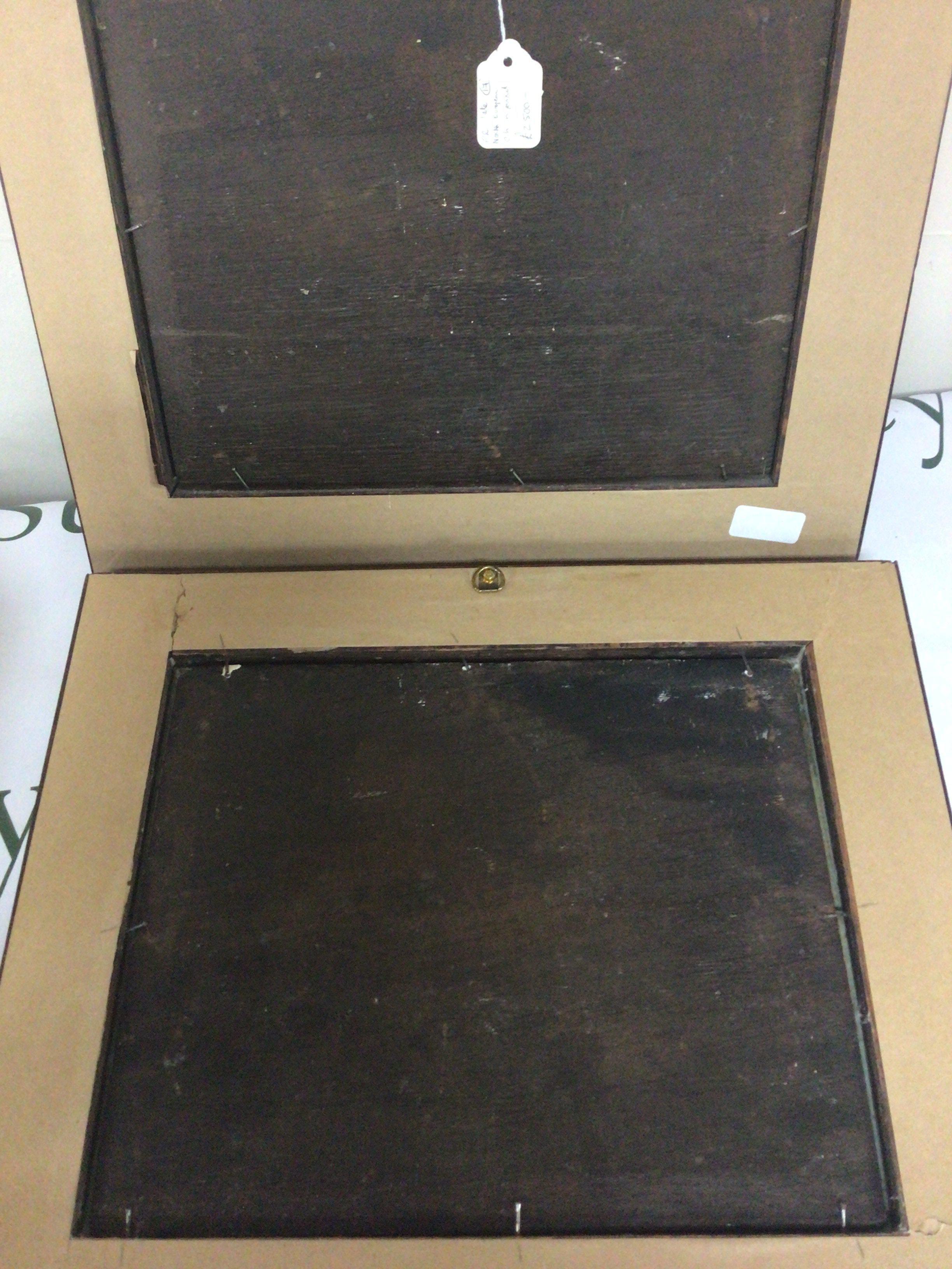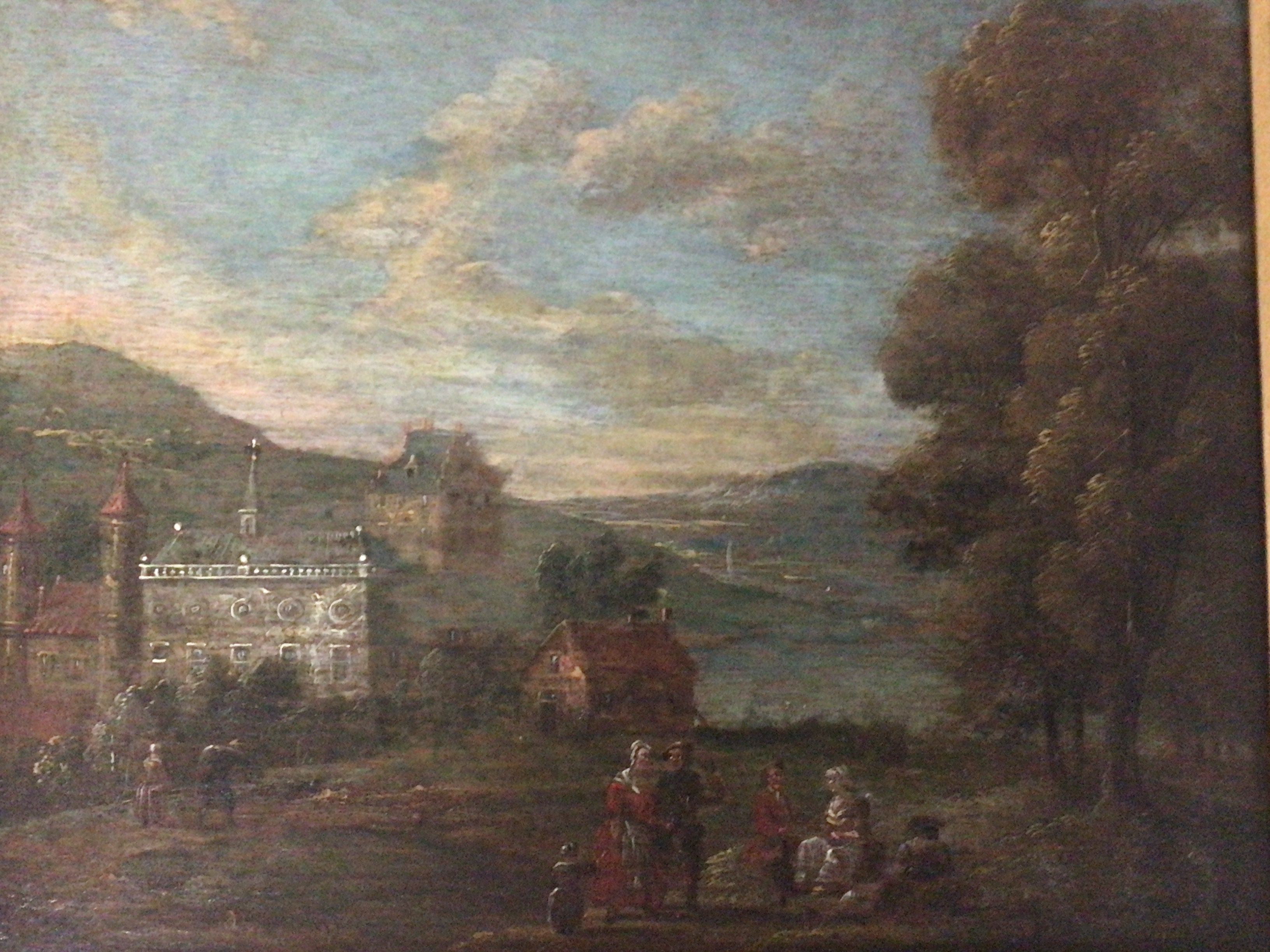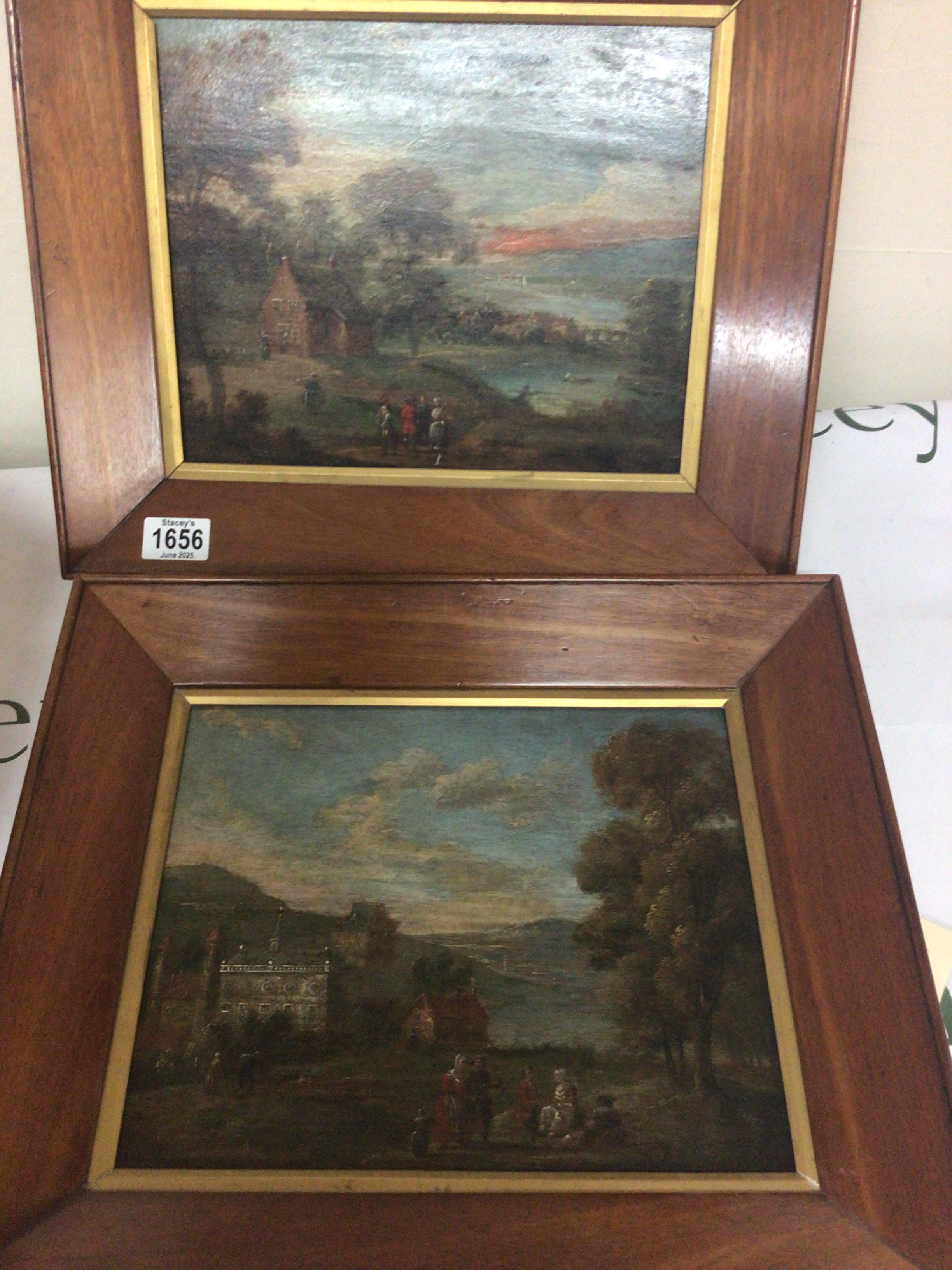 A pair of oil paintings on panel North European possibly late 17th century and of the period depicting landscapes with socialising figures and buildings unsigned and unattributed. Restored reframed. 43x37cm including frame size.