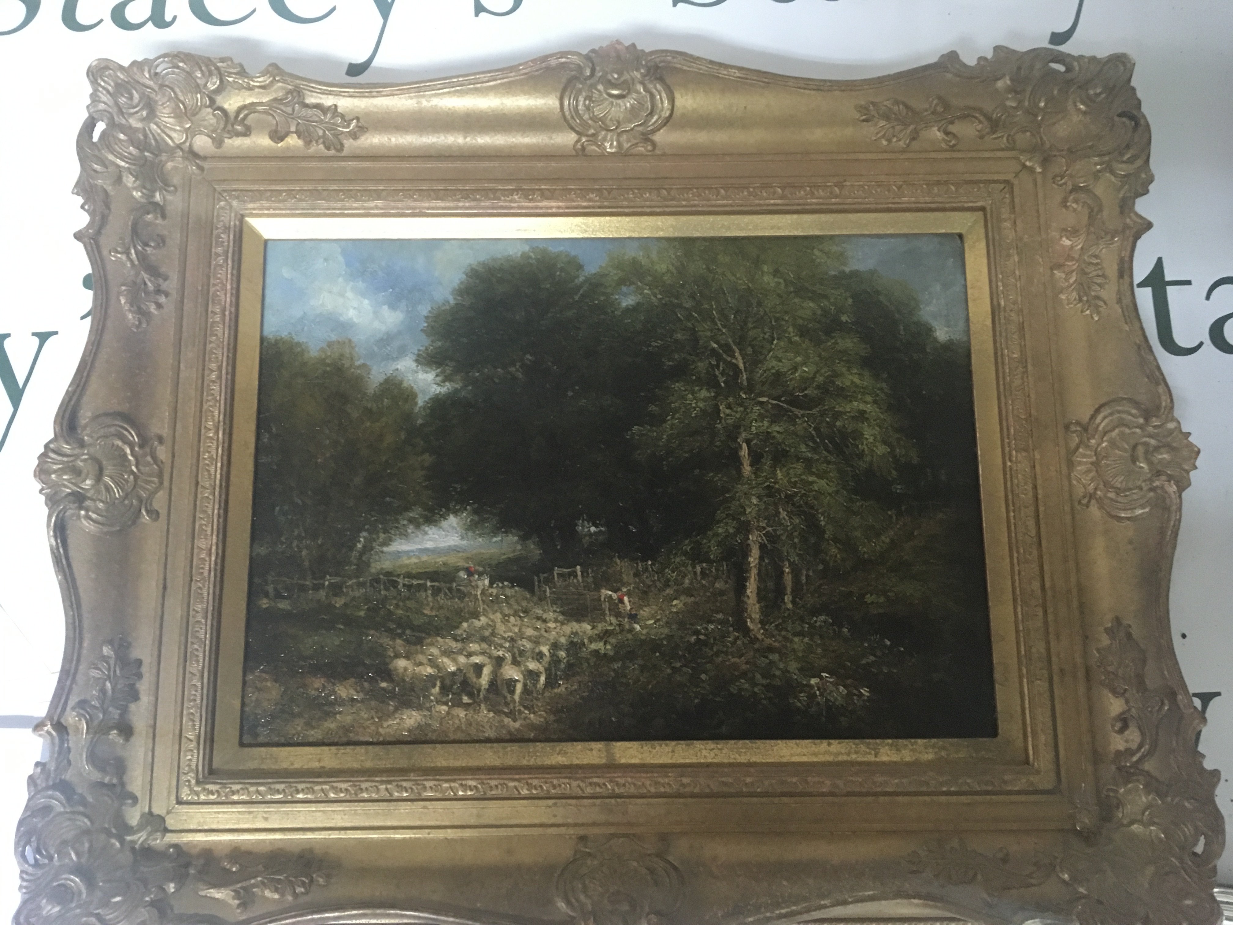 A 19th century oil painting on panel depicting a rural scene the gathering and hearing of a flock of sheep with figures unsigned attributed to John Linnell (1792-1882) the reverse with inscription restored and reframed. 52x41cm