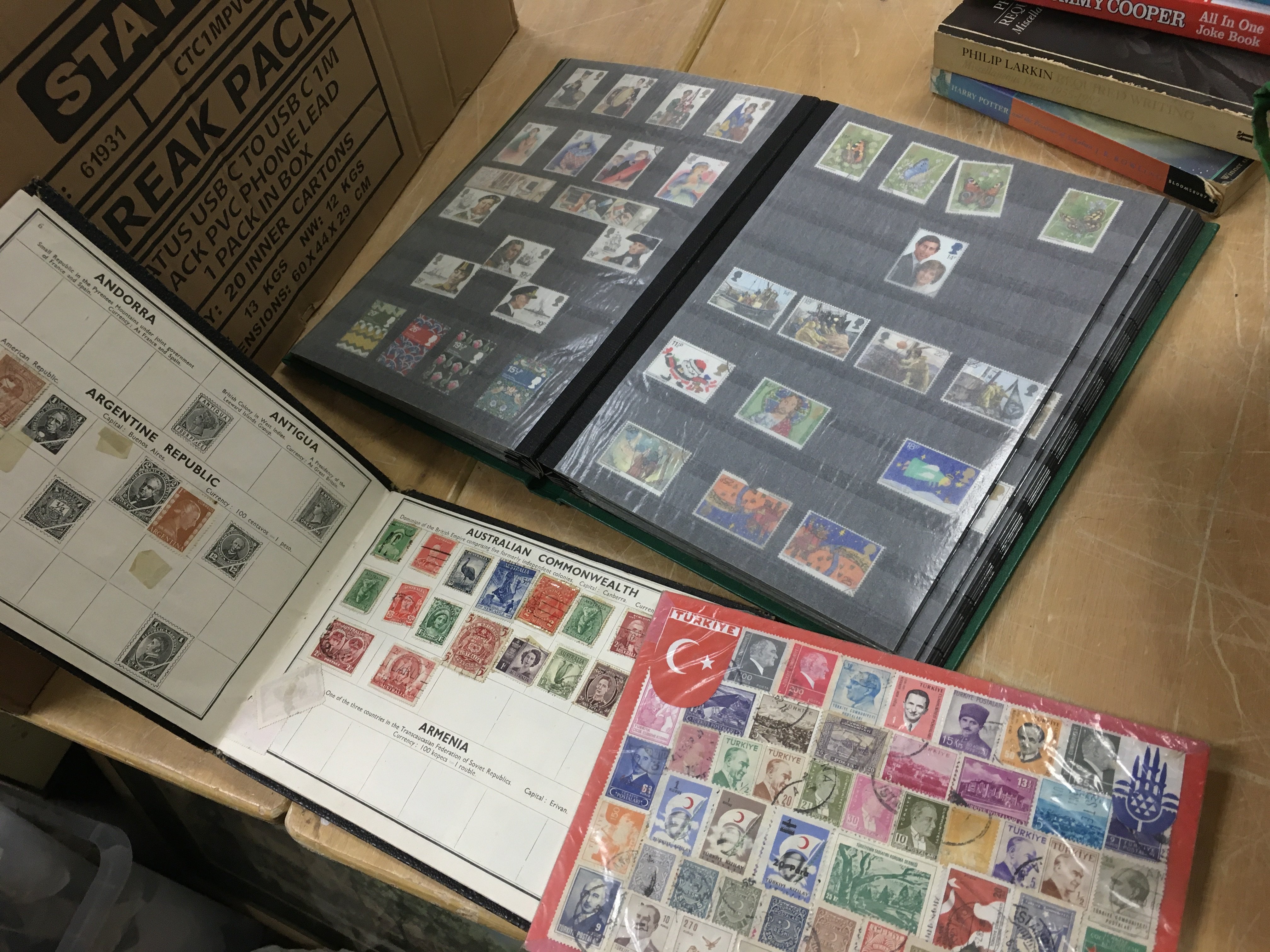 A collection of various 20th century used and unused world stamps , first day covers and books including Harry Potter . This lot cannot be posted