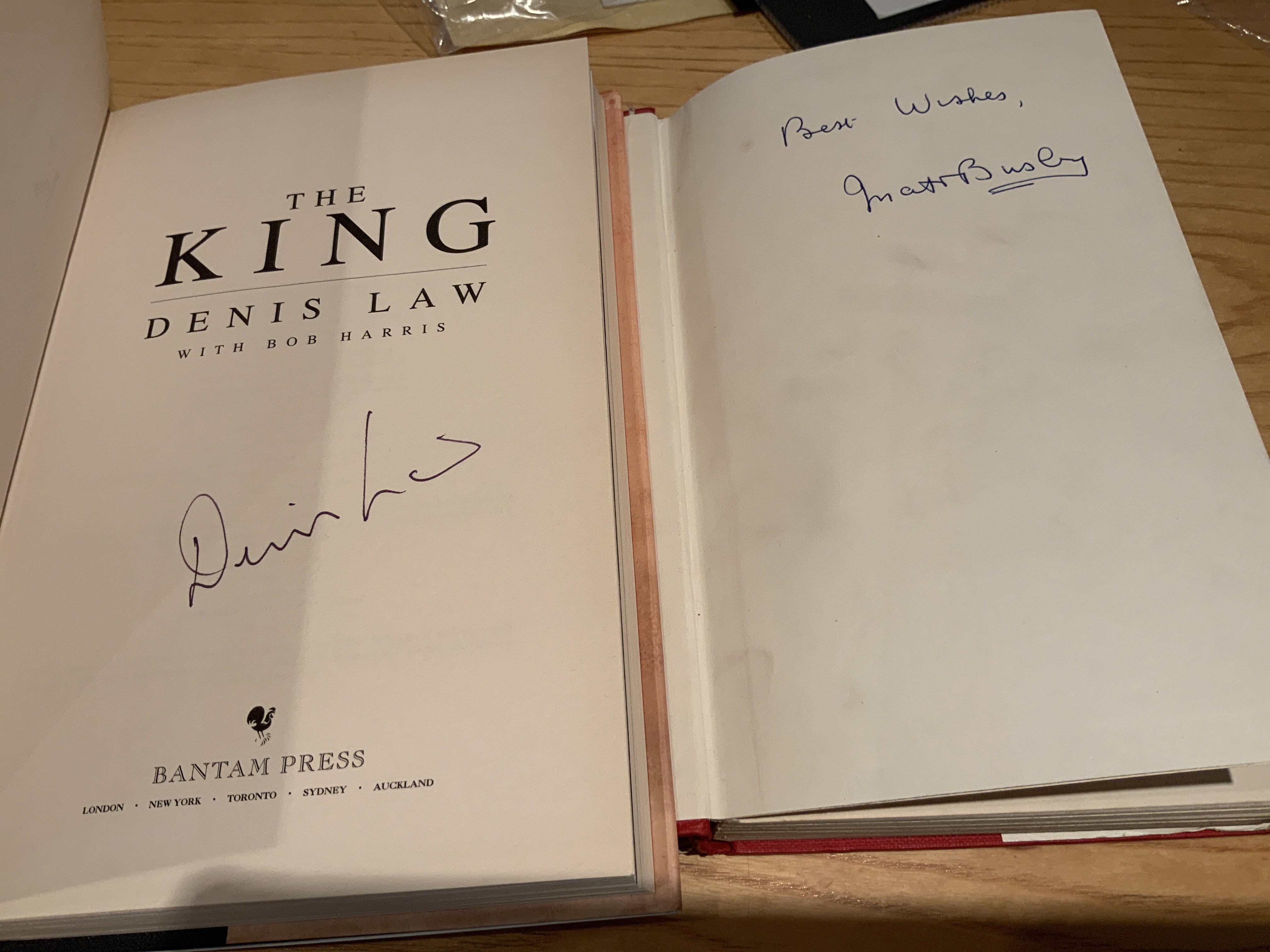 Matt Busby + Denis Law Signed Manchester United Football Books: Both books hand signed without dedication. Busby book has fading to spines dust jacket. (2)