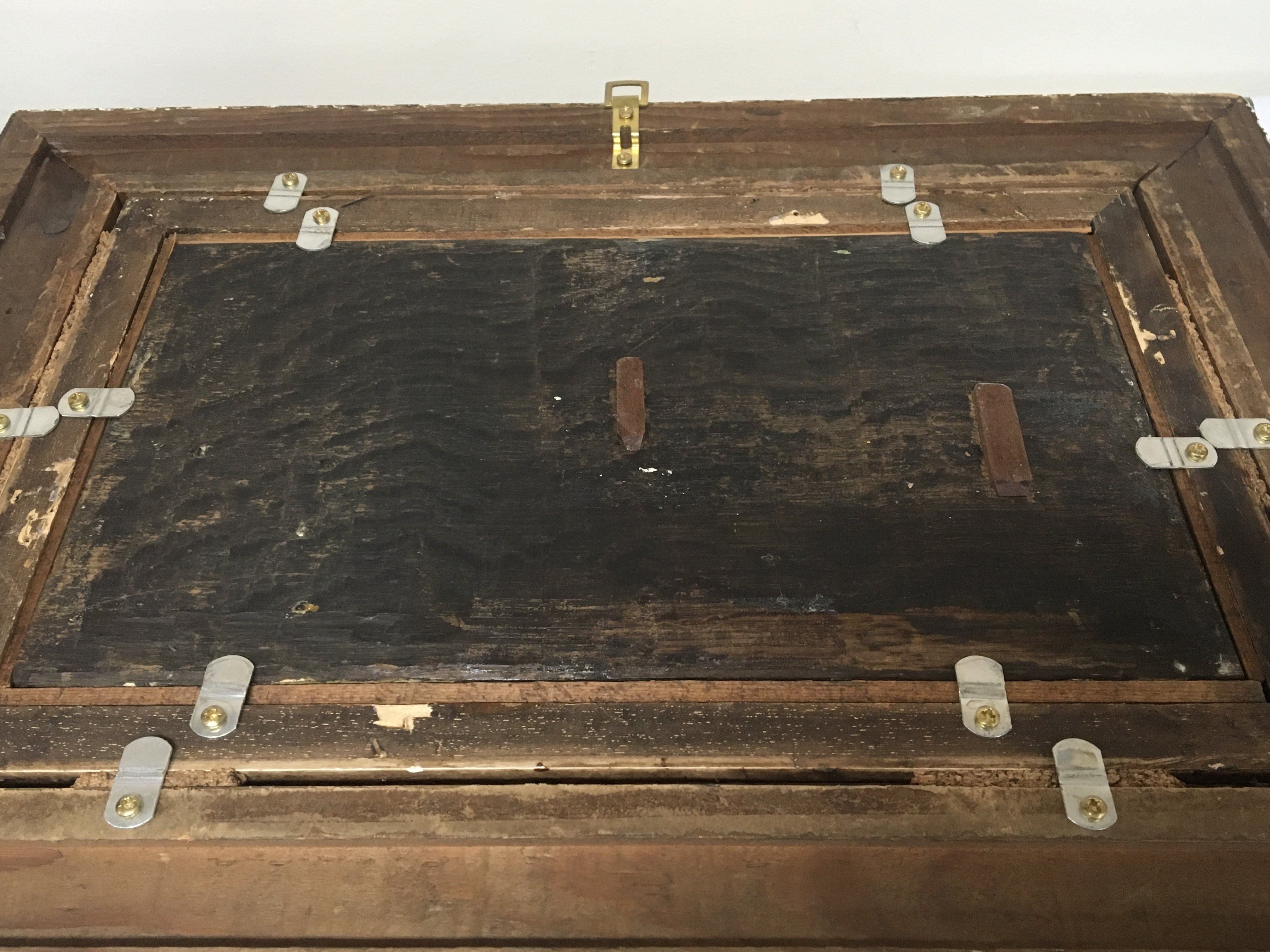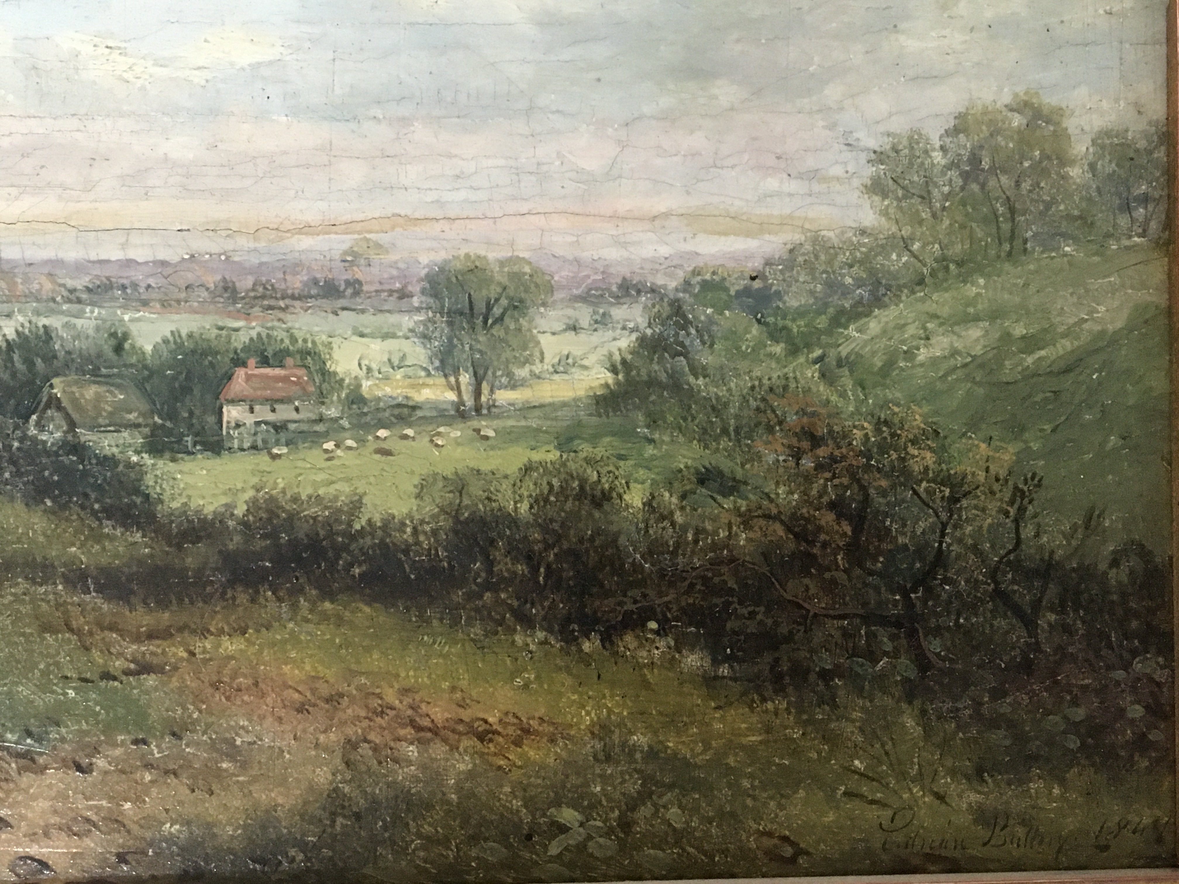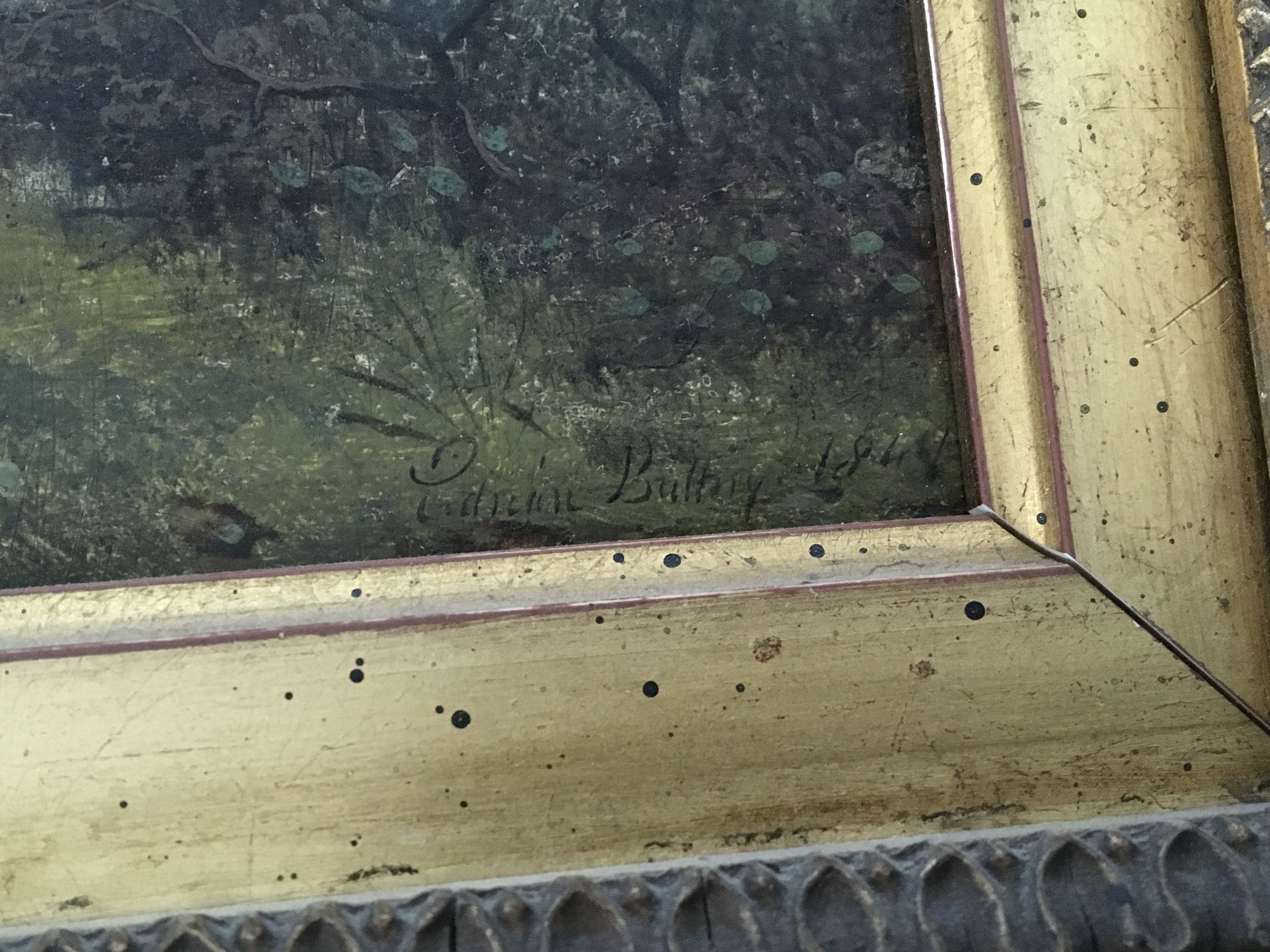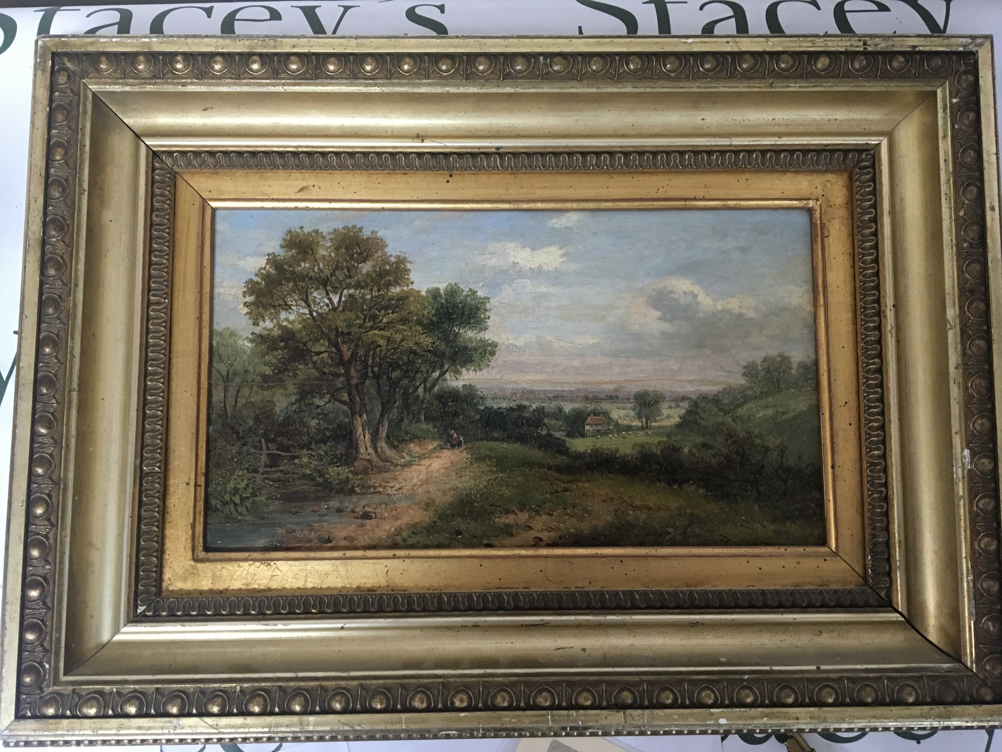 A mid 19th century oil painting on panel a British rural landscape with figures on a path and building beyond. Signed lower left Indistinctly and dated 1848. See image. 54x38cm