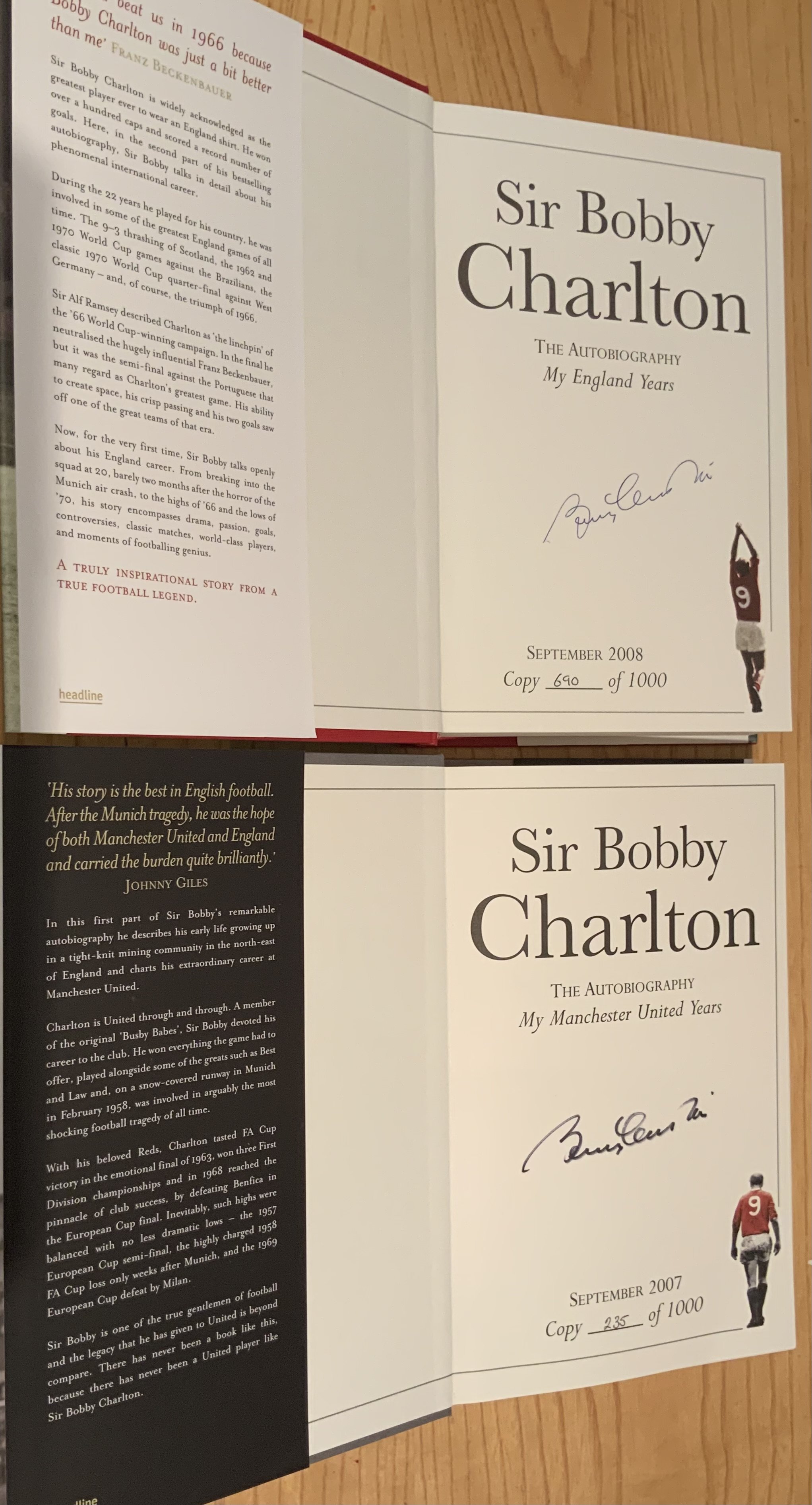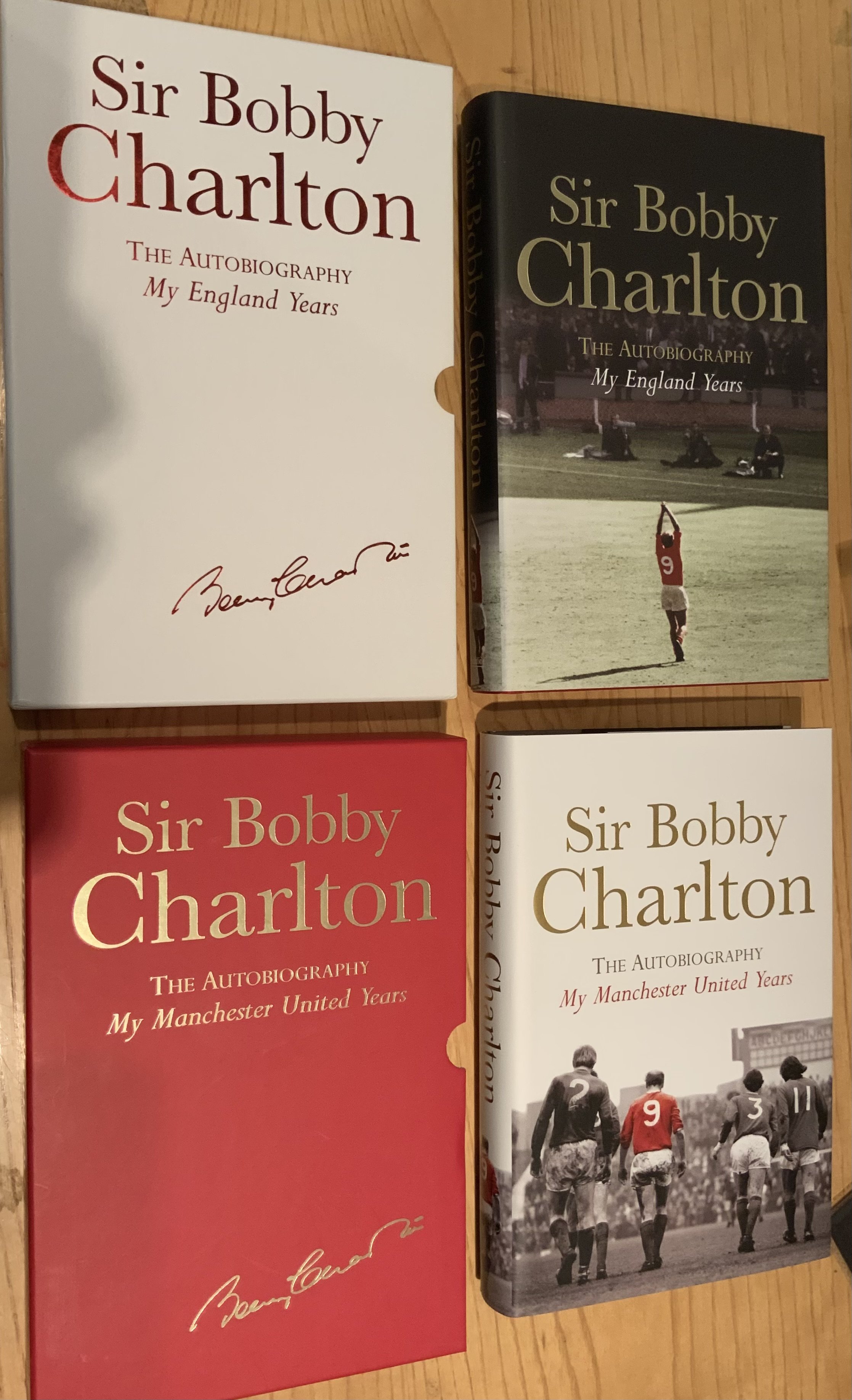Bobby Charlton Signed Manchester United + England Football Books: My England Years and My Manchester United Years hardback Ltd edition books with dust jackets and slip cases. Excellent condition both signed without dedication. (2)