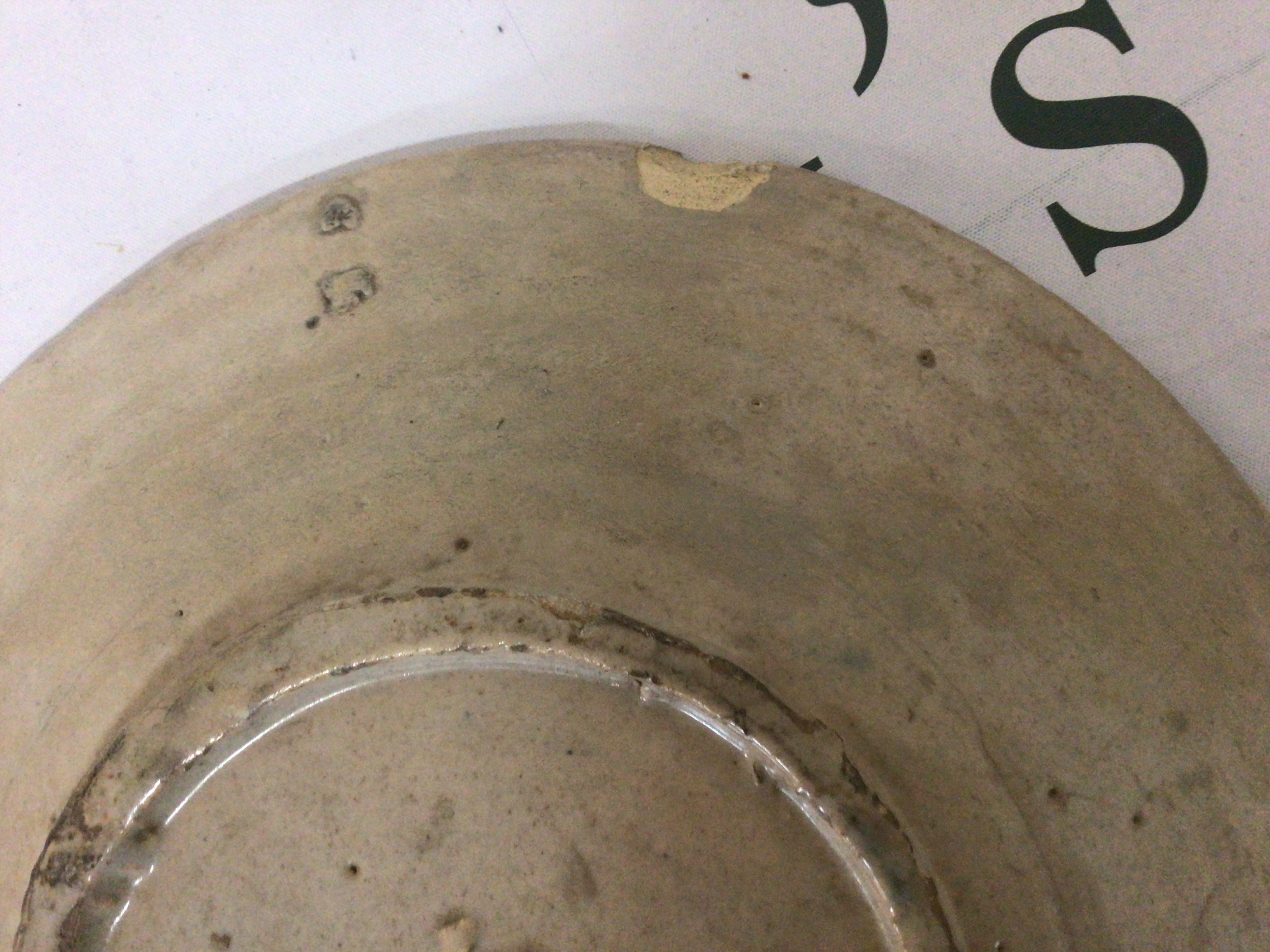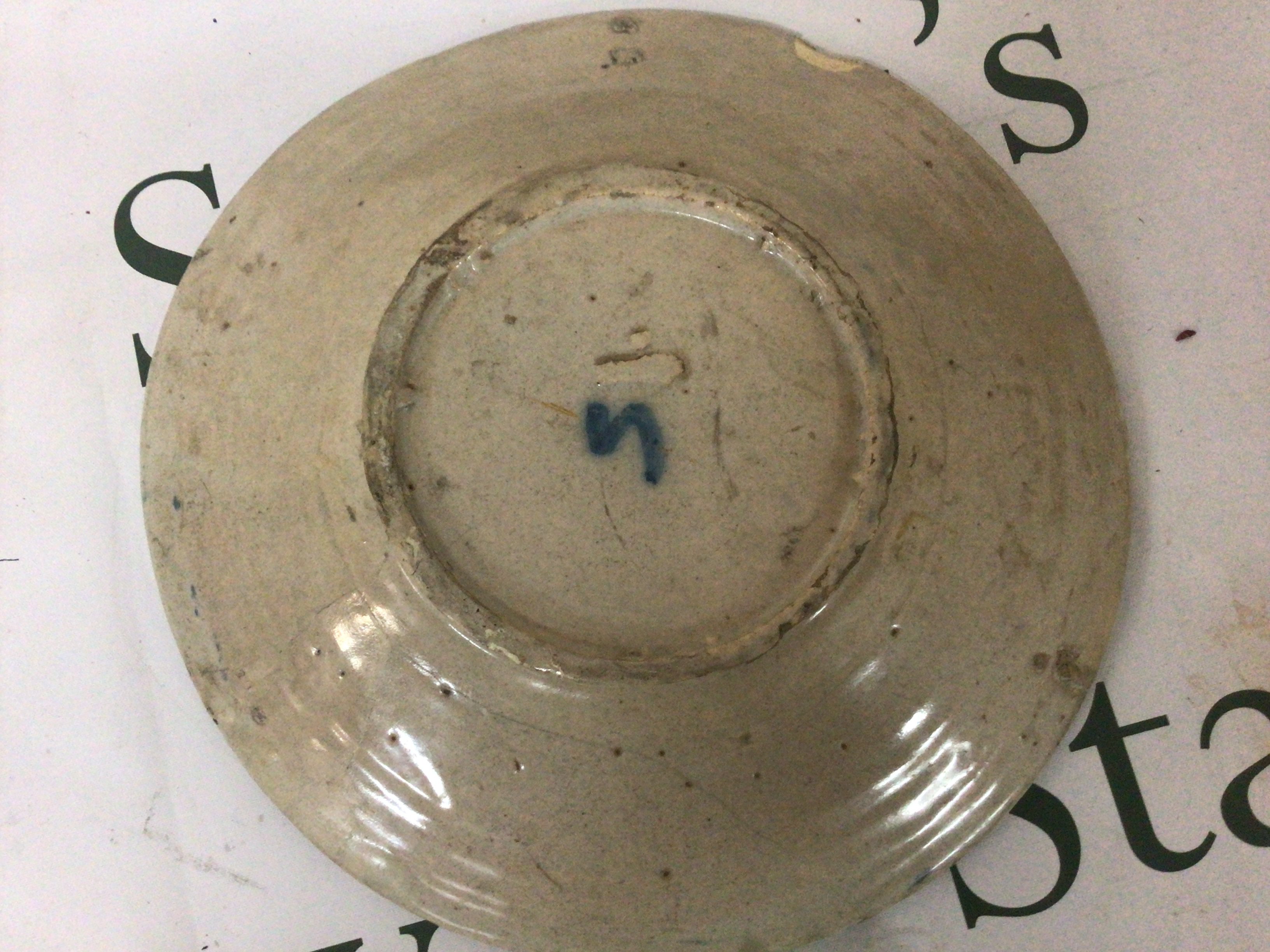 An Antique Continental 18th or early 19th century slip decorated ceramic dish the centre with a nave bird amongst foliage. Some minor damage in keeping with age