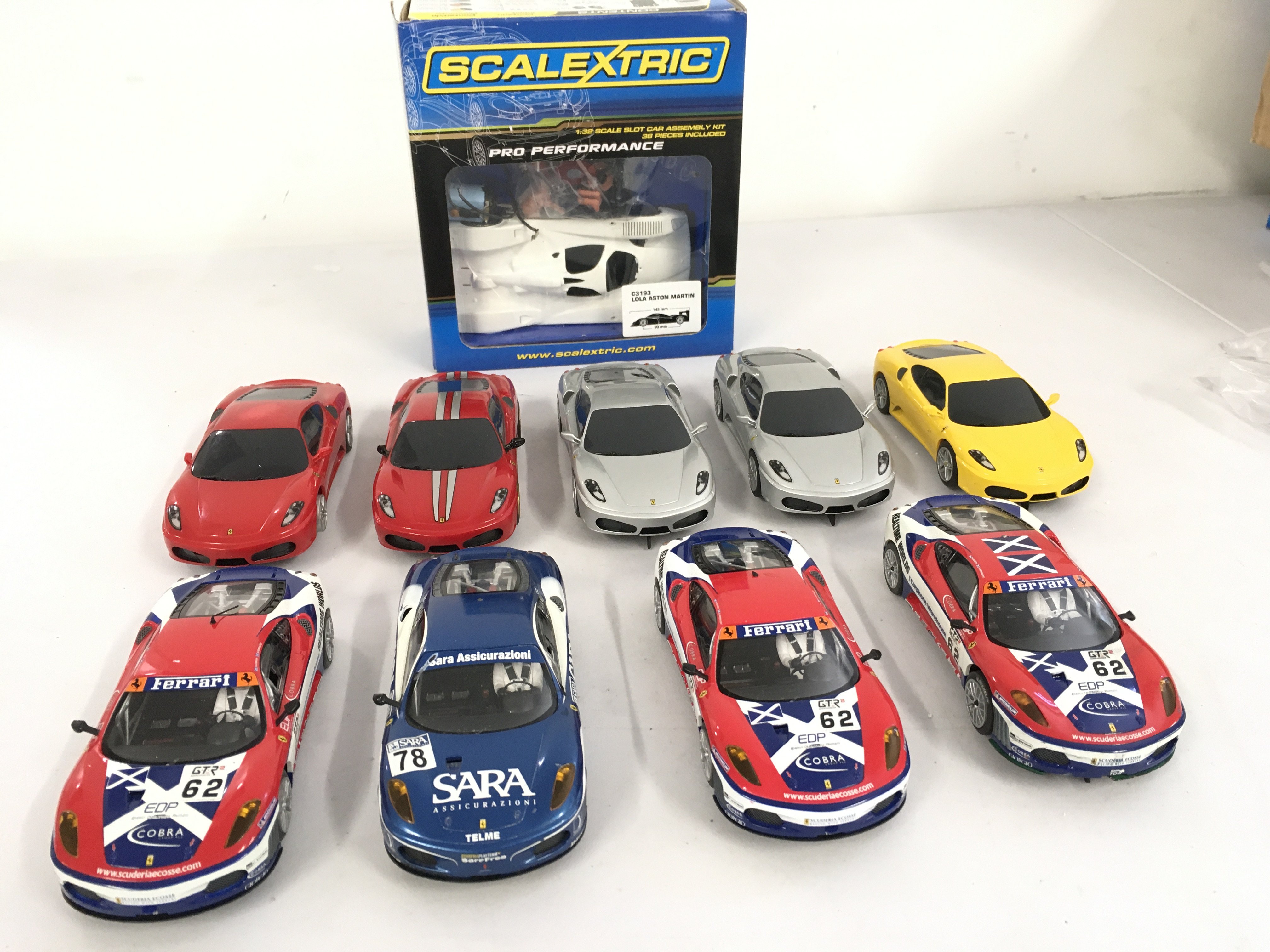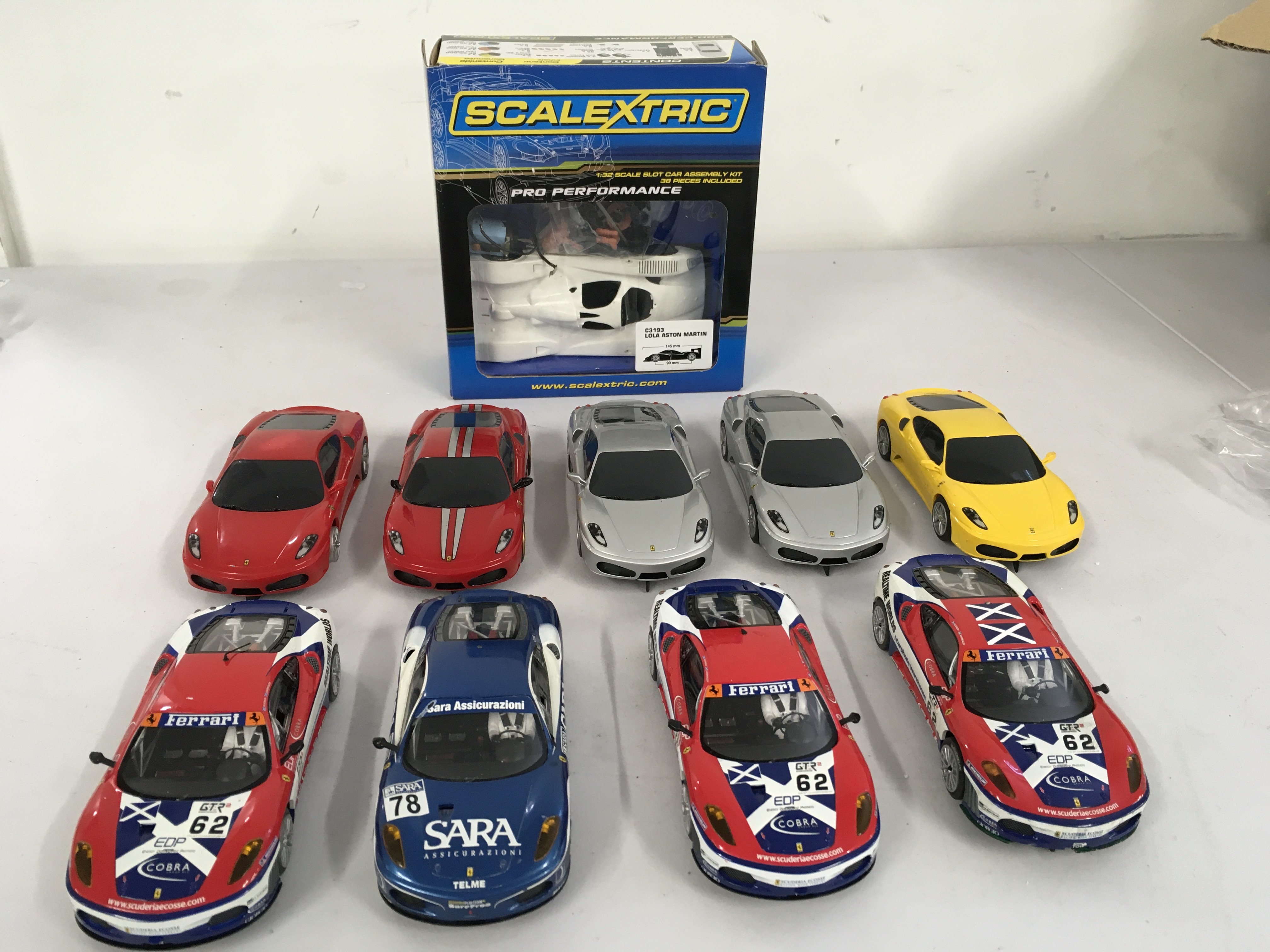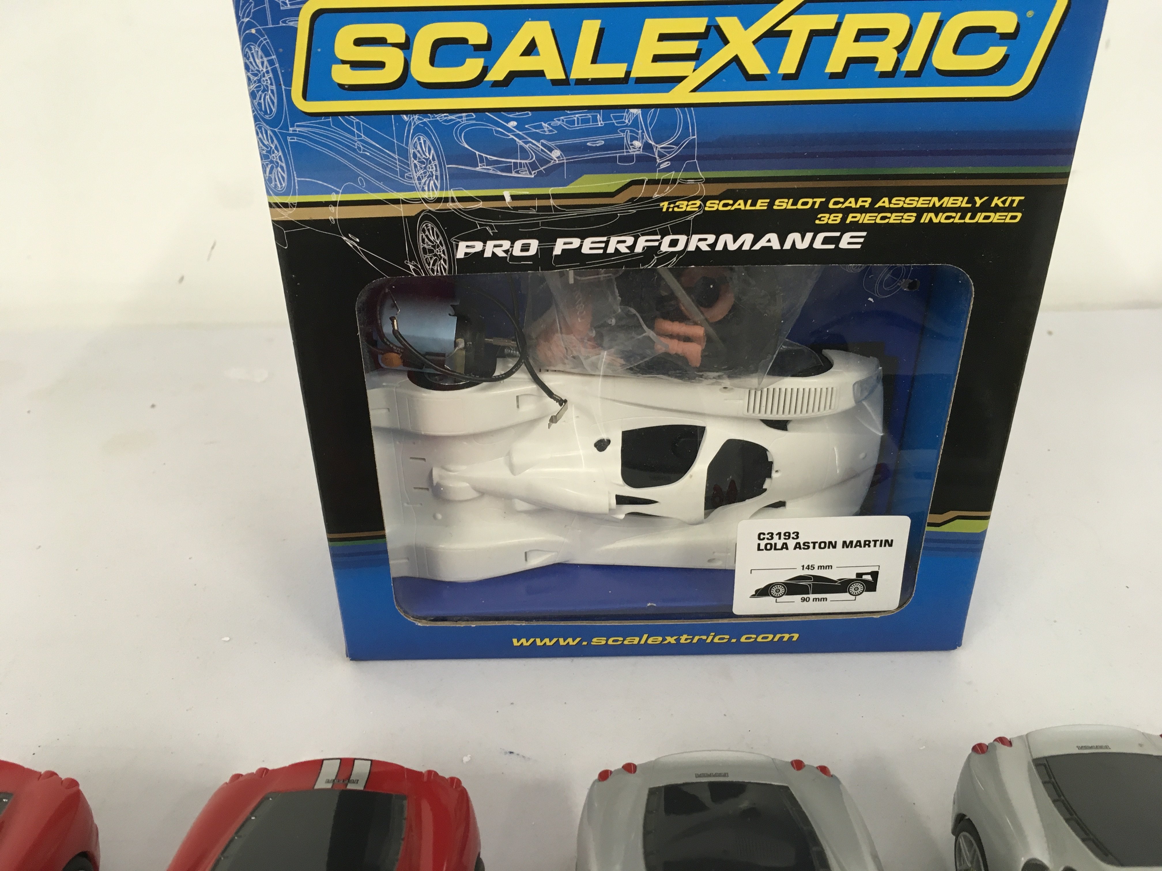 A collection of 10 Scalextric Hornby racing slot cars including a boxed self assembly Lola Aston Martin. No reserve