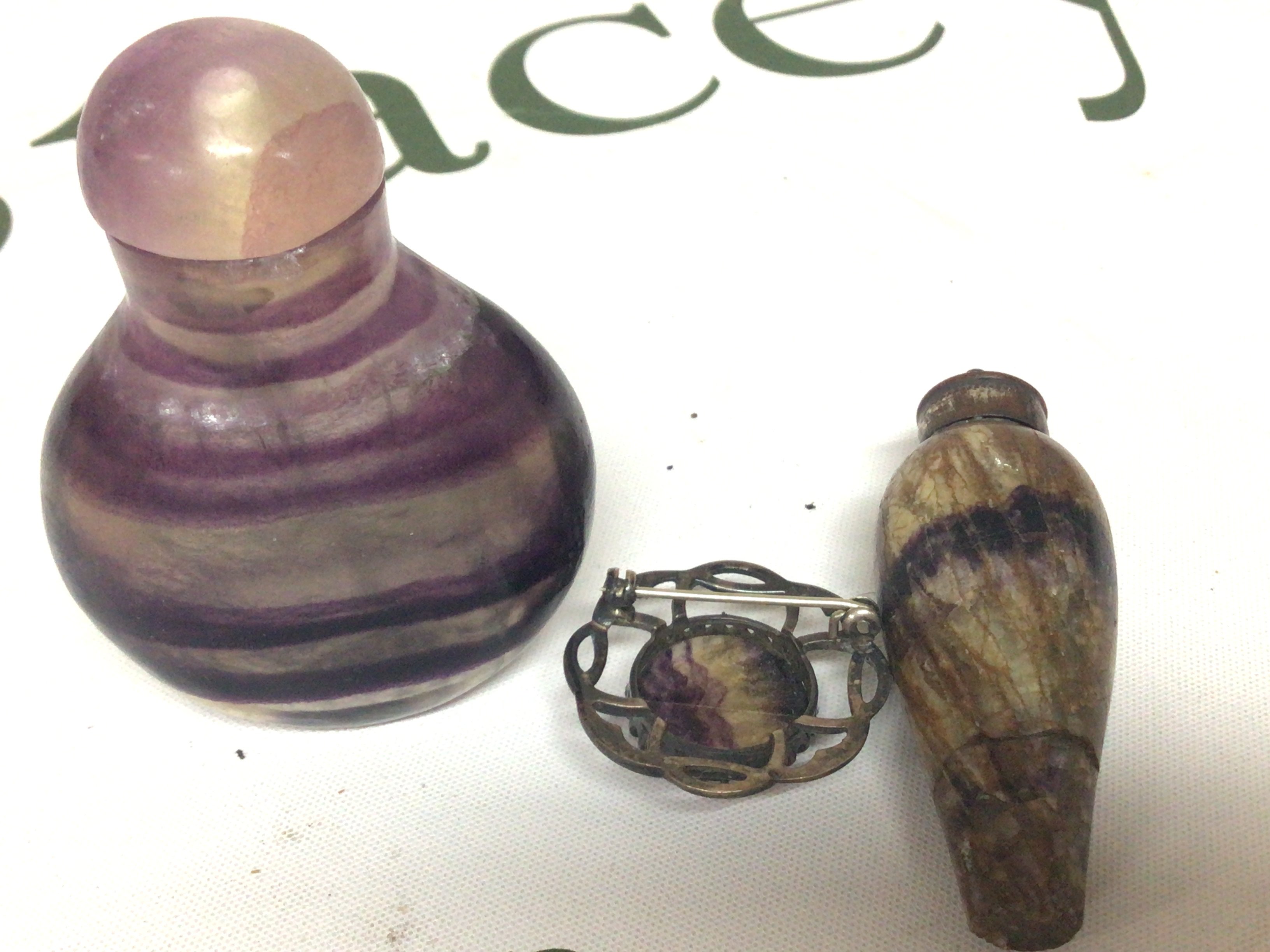 An intresting scent bottle most likely Blue John stone a conforming brooch and one other scent bottle possibly polished Amethyst. (3)