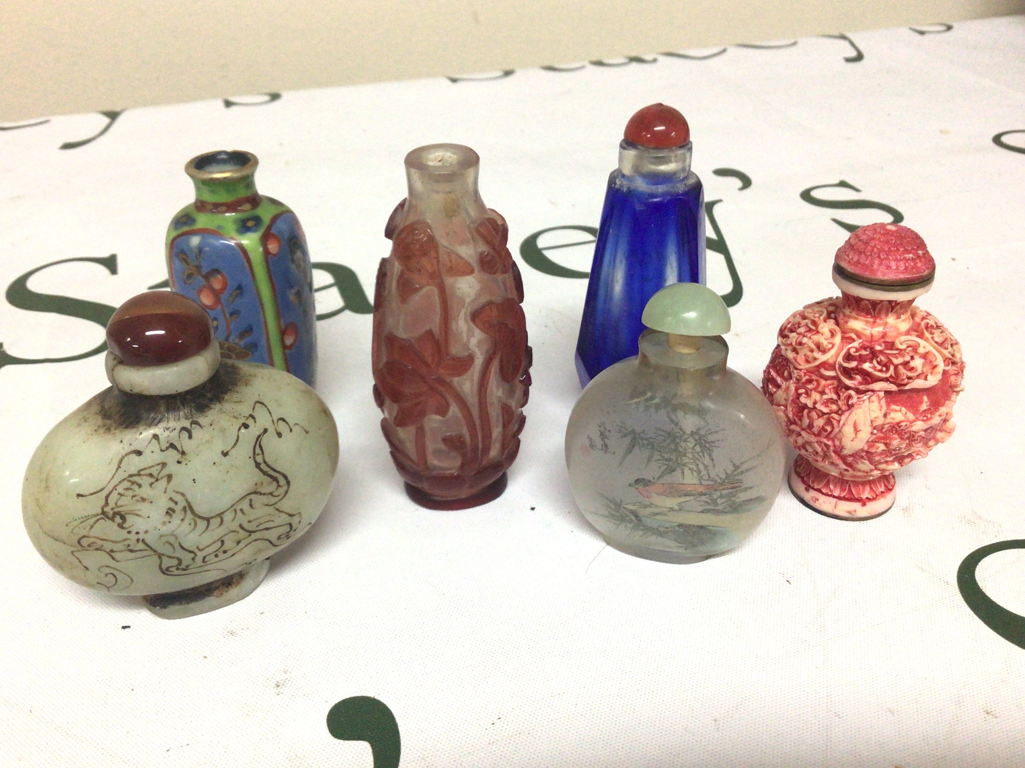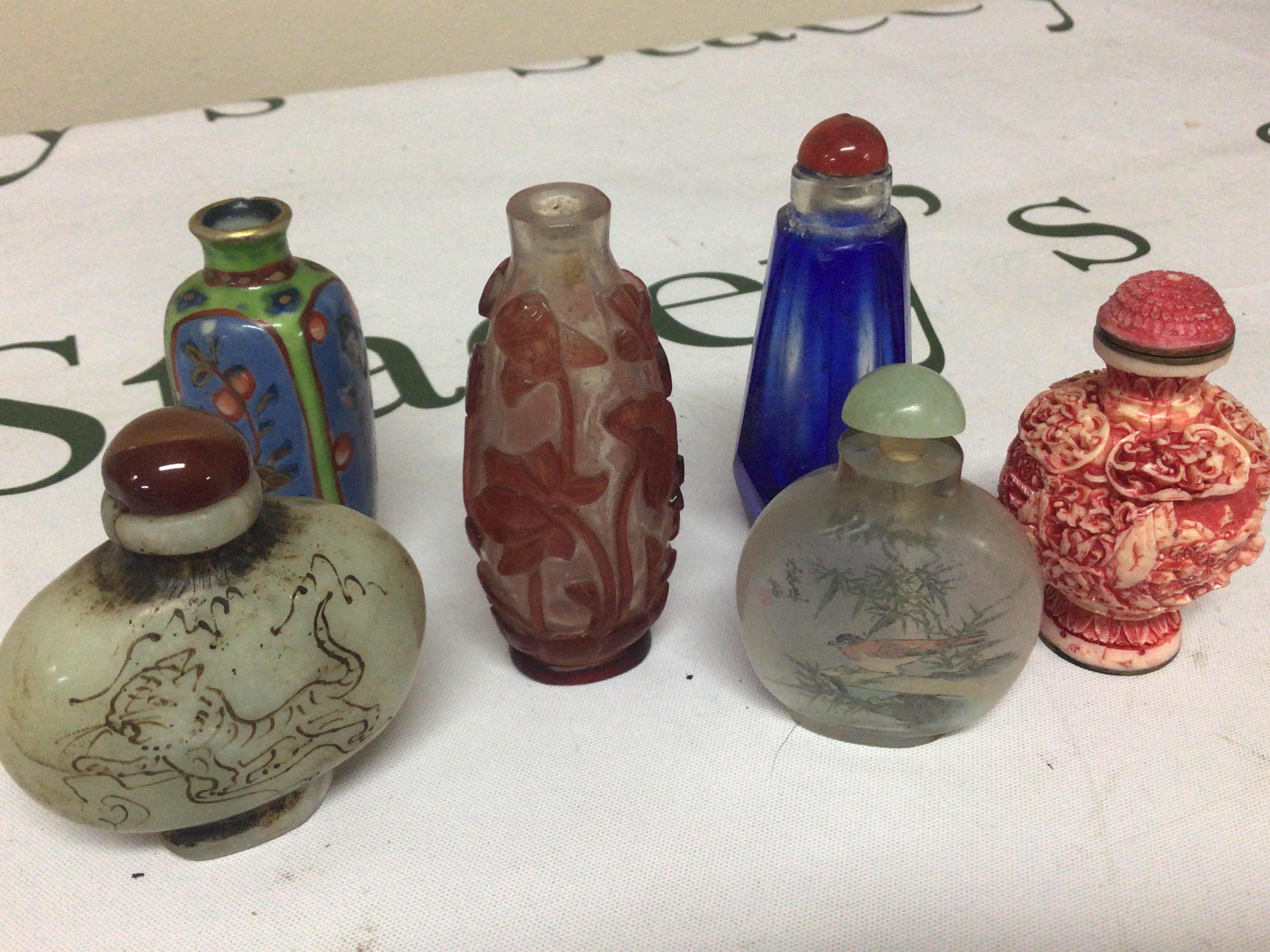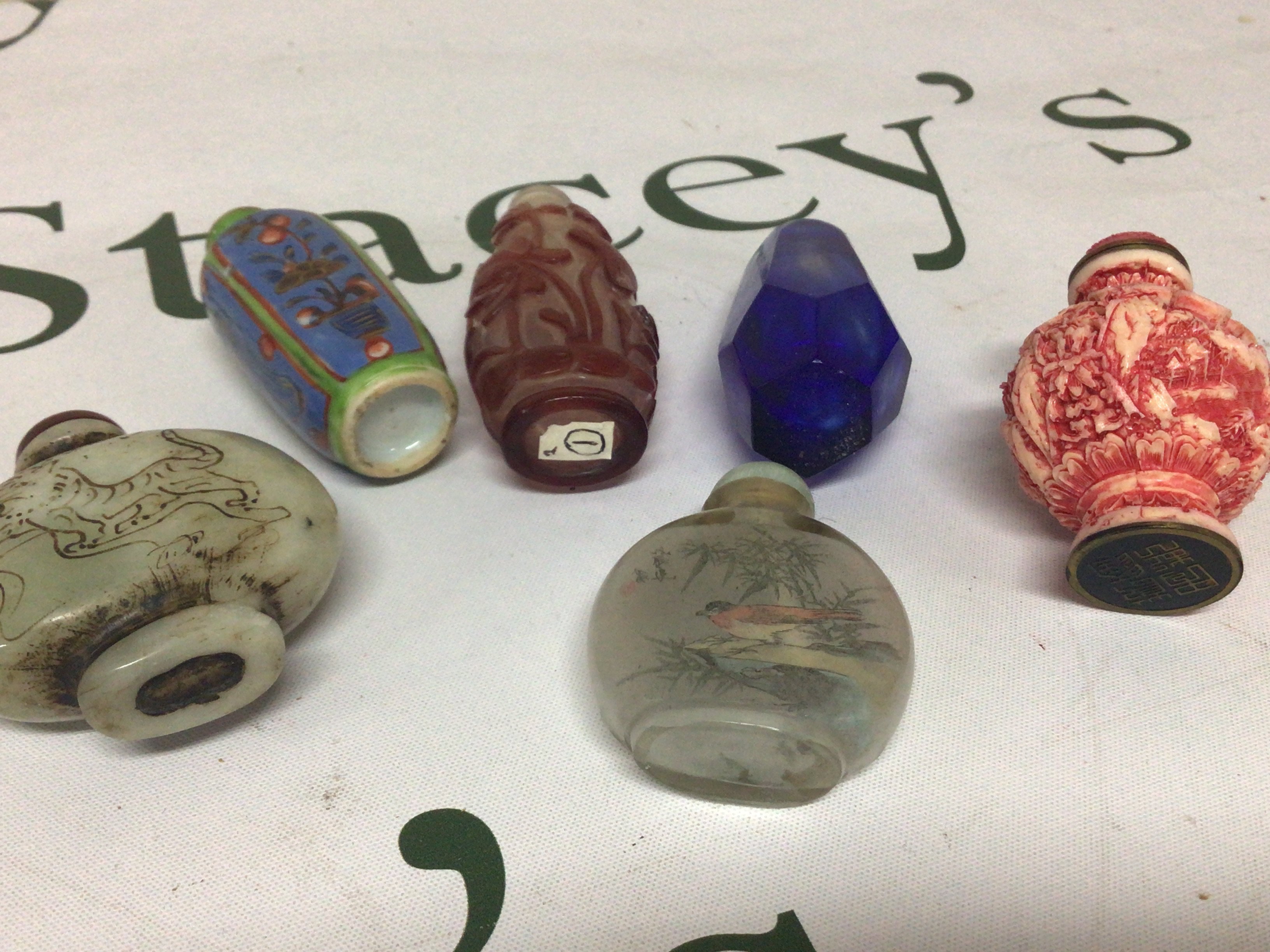 A collection of Chinese scent bottles including carved rock crystal polished stone and other scent bottles.