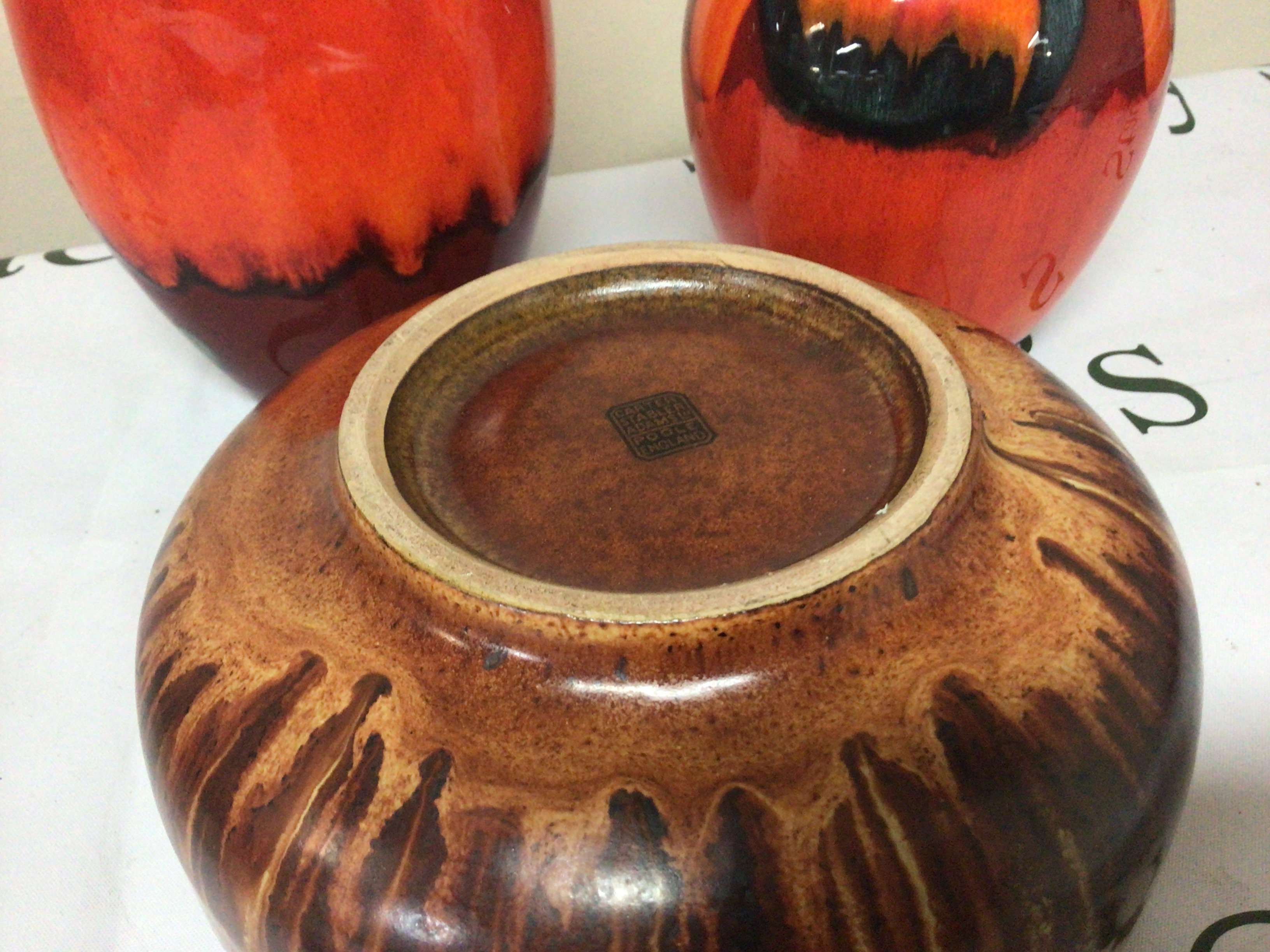 An unusual Carter Stabler Adams Poole pottery bowl and two brightly coloured Poole Pottery Vases. Hight 26cm no obvious damage.