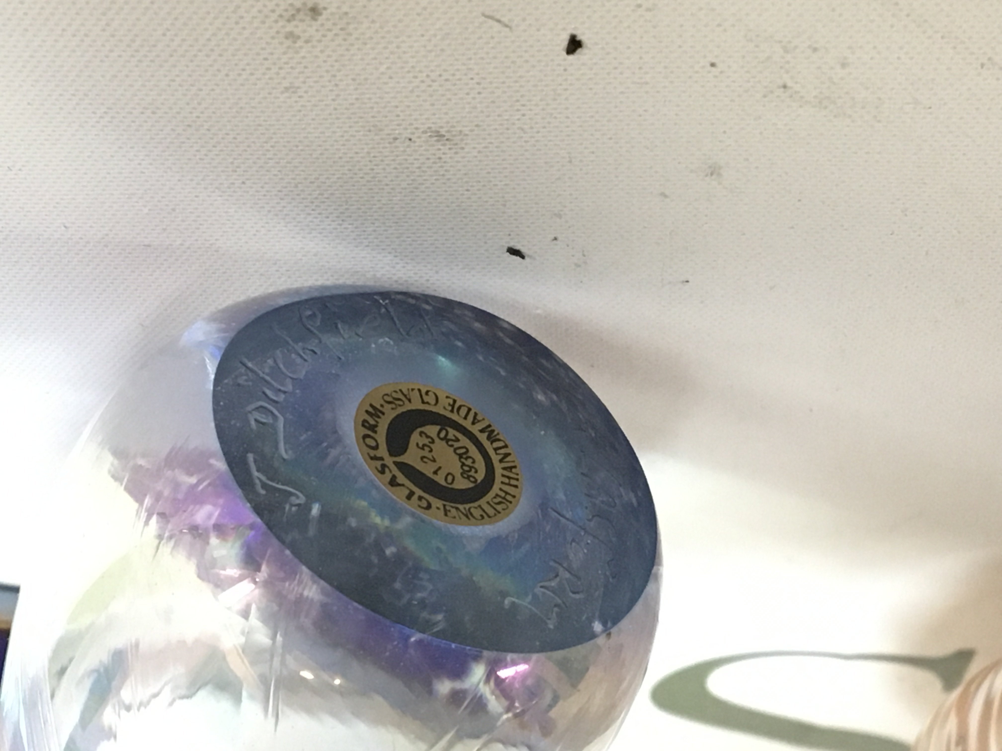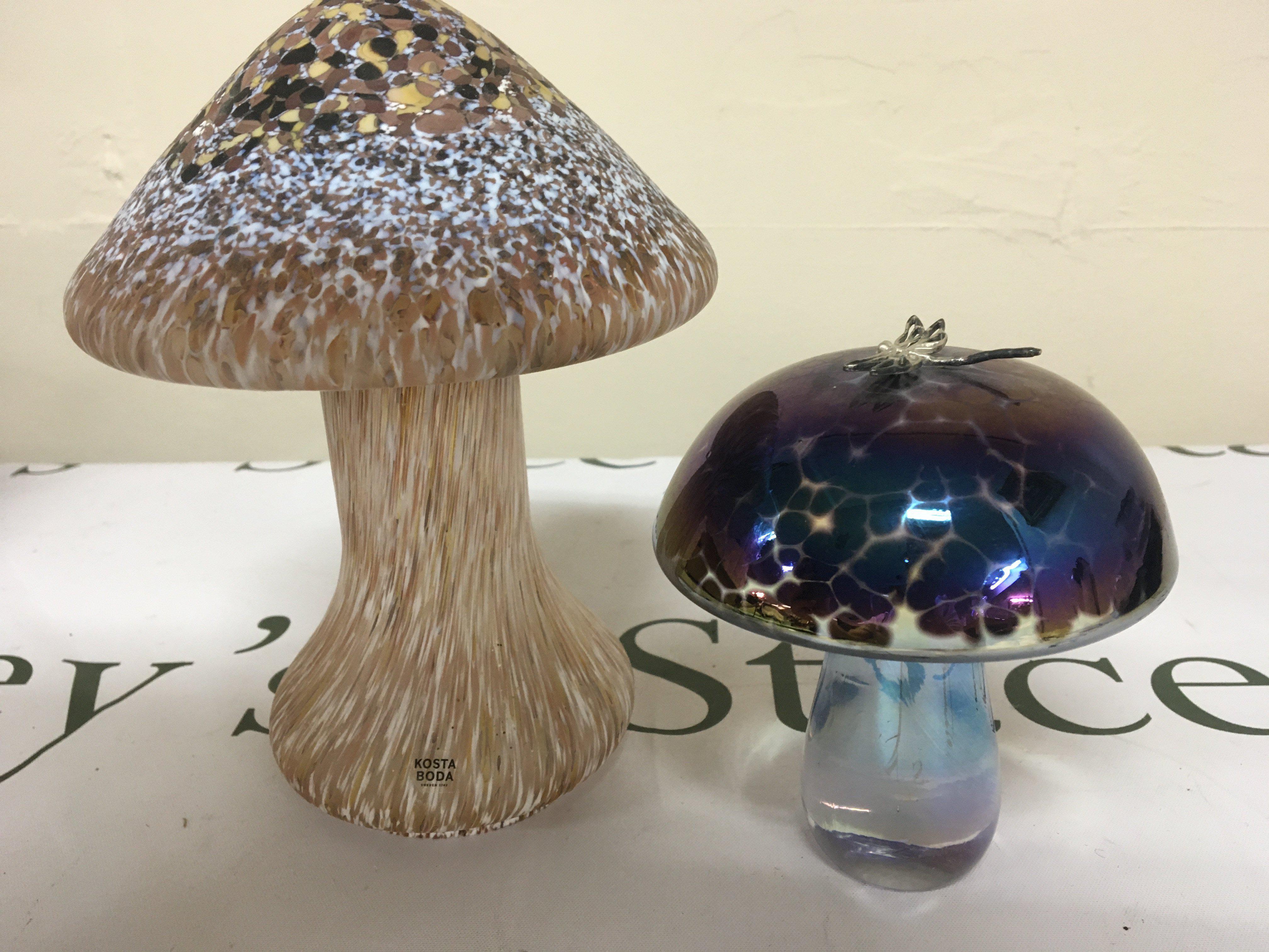 A Kosta Boda art glass mushroom ornament and signed Ditchfield Glassform glass mushroom. With applied dragon fly Hight 20cm no obvious damage.