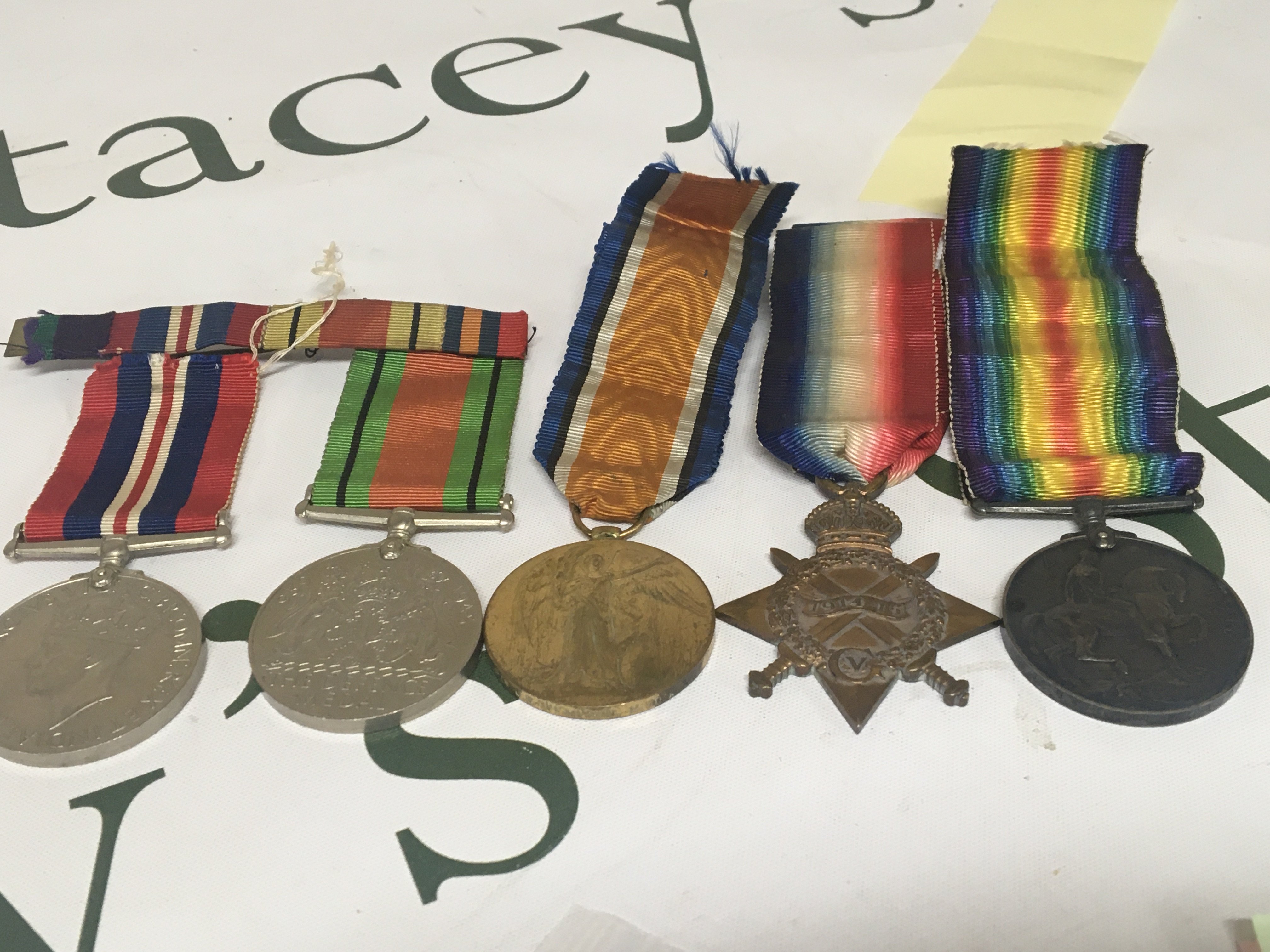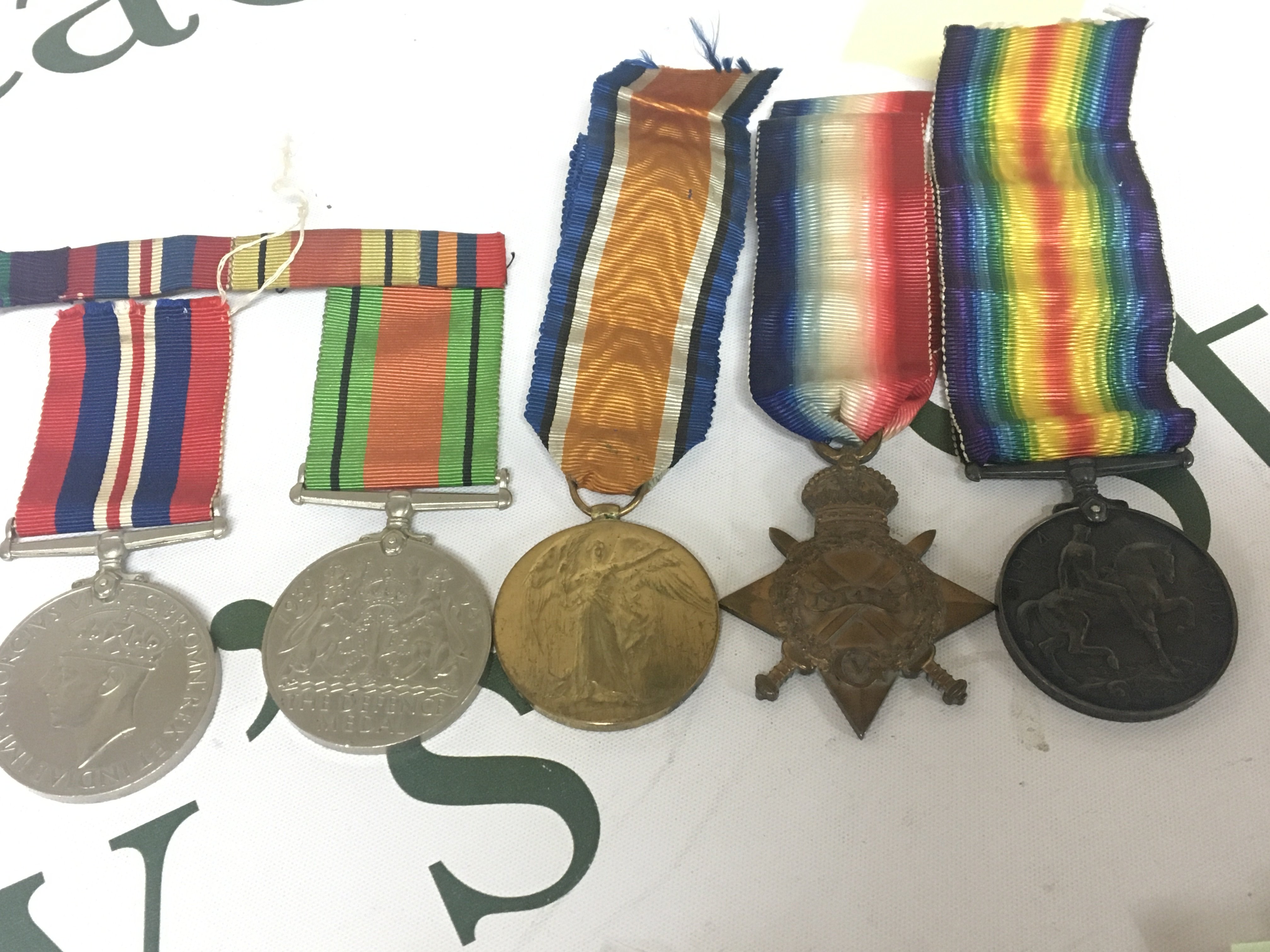 A group of three I world war medals including 1914/15 star awarded to 5446 Pte JG Thompson Midd XR. and two Second World War medals (5)
