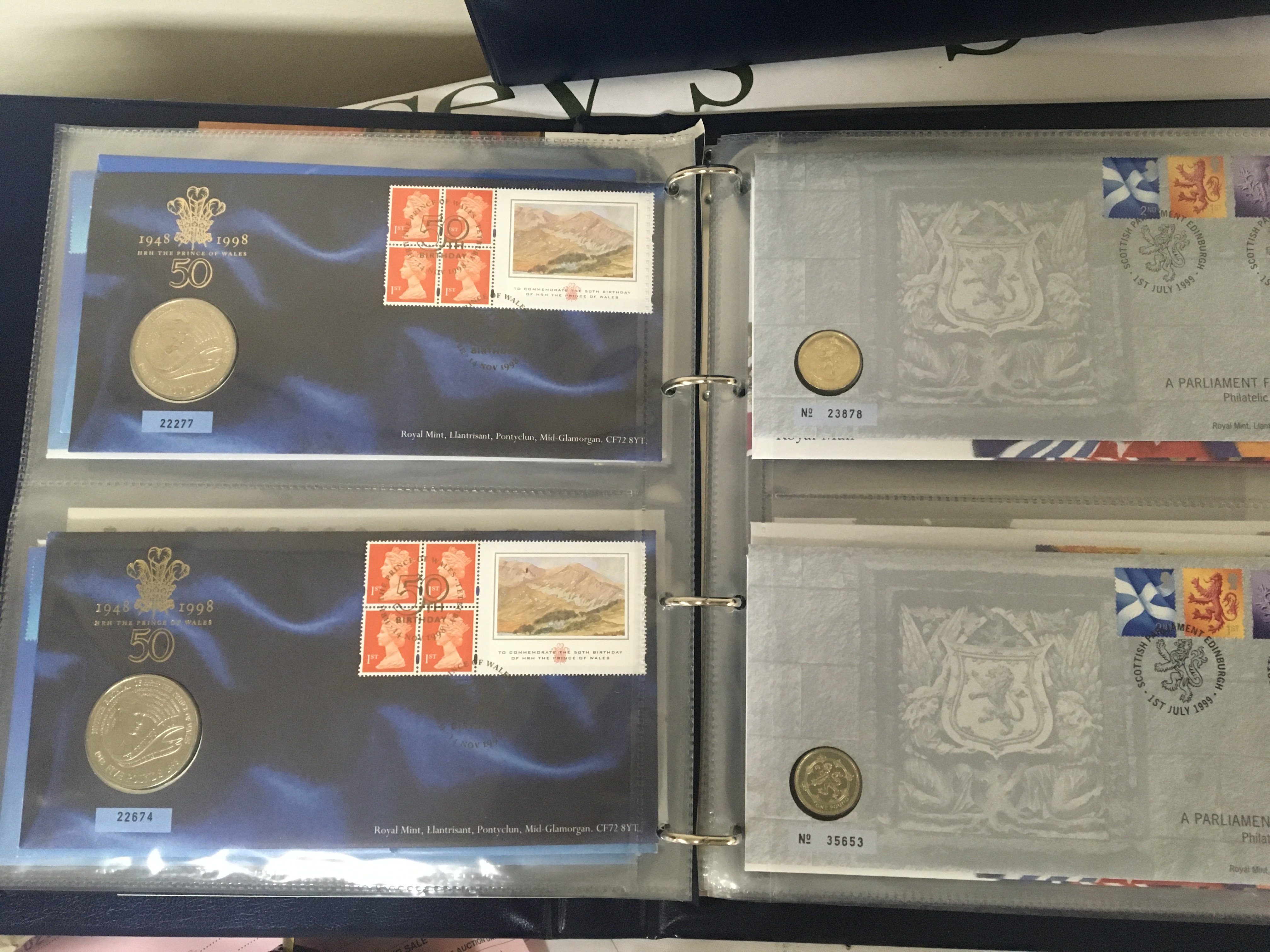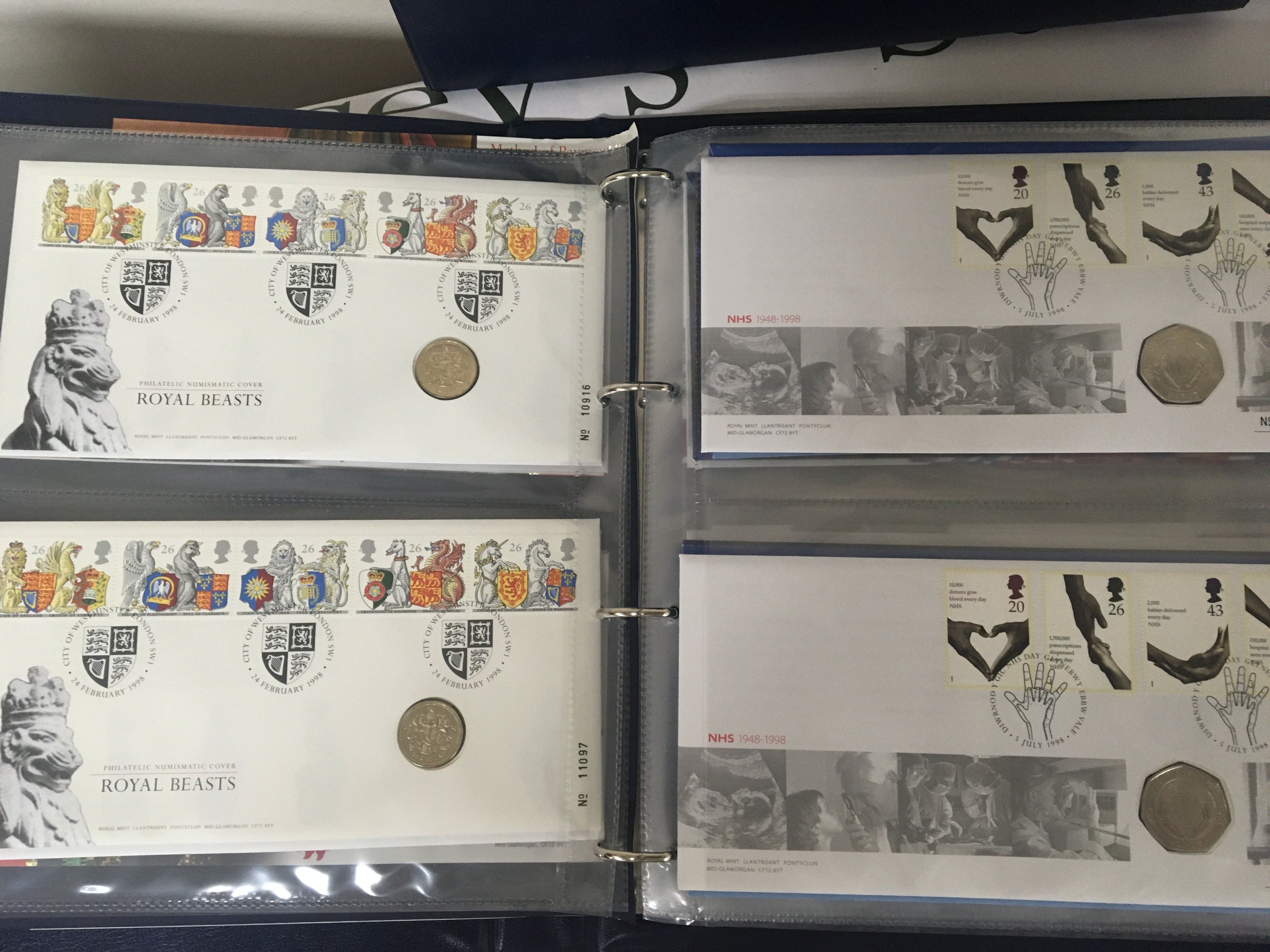 An Album containing a collection of Royal Mail Royal Mint Philatelic Numismatic Covers. in a blue album.