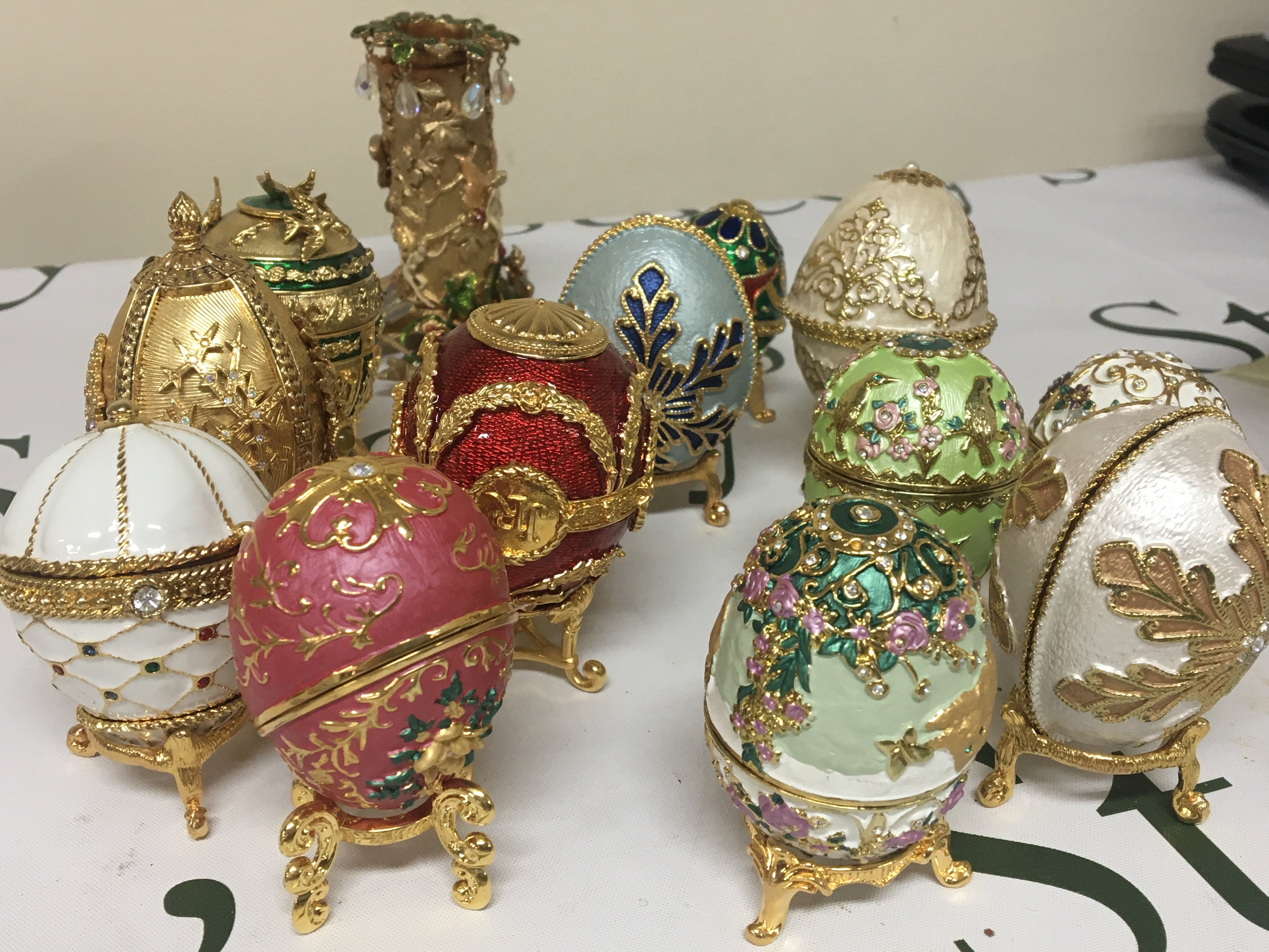 A collection of enamel and gilt metal elaborate egg caskets on small stands set with simulated Jewels and a conforming candle holder.