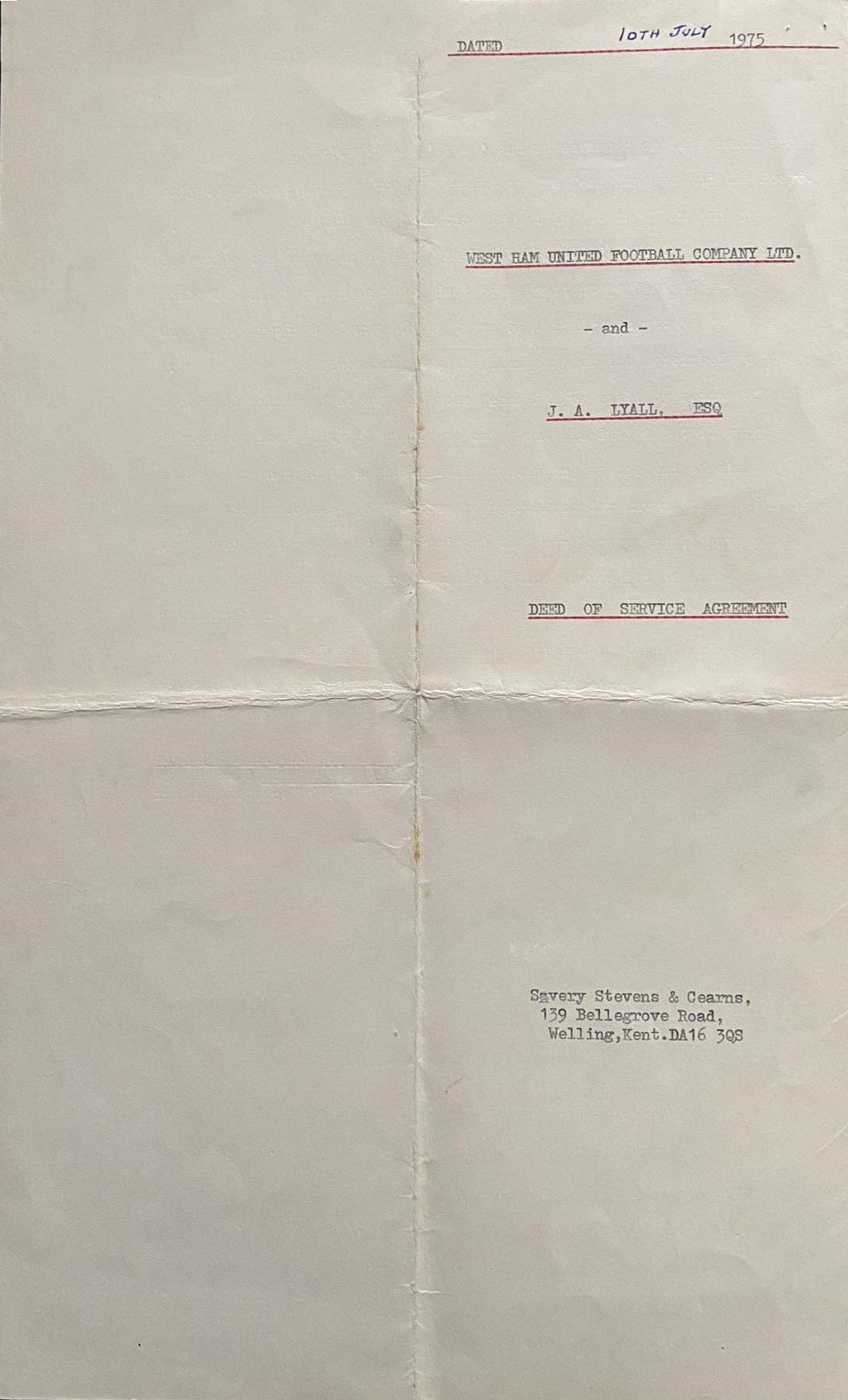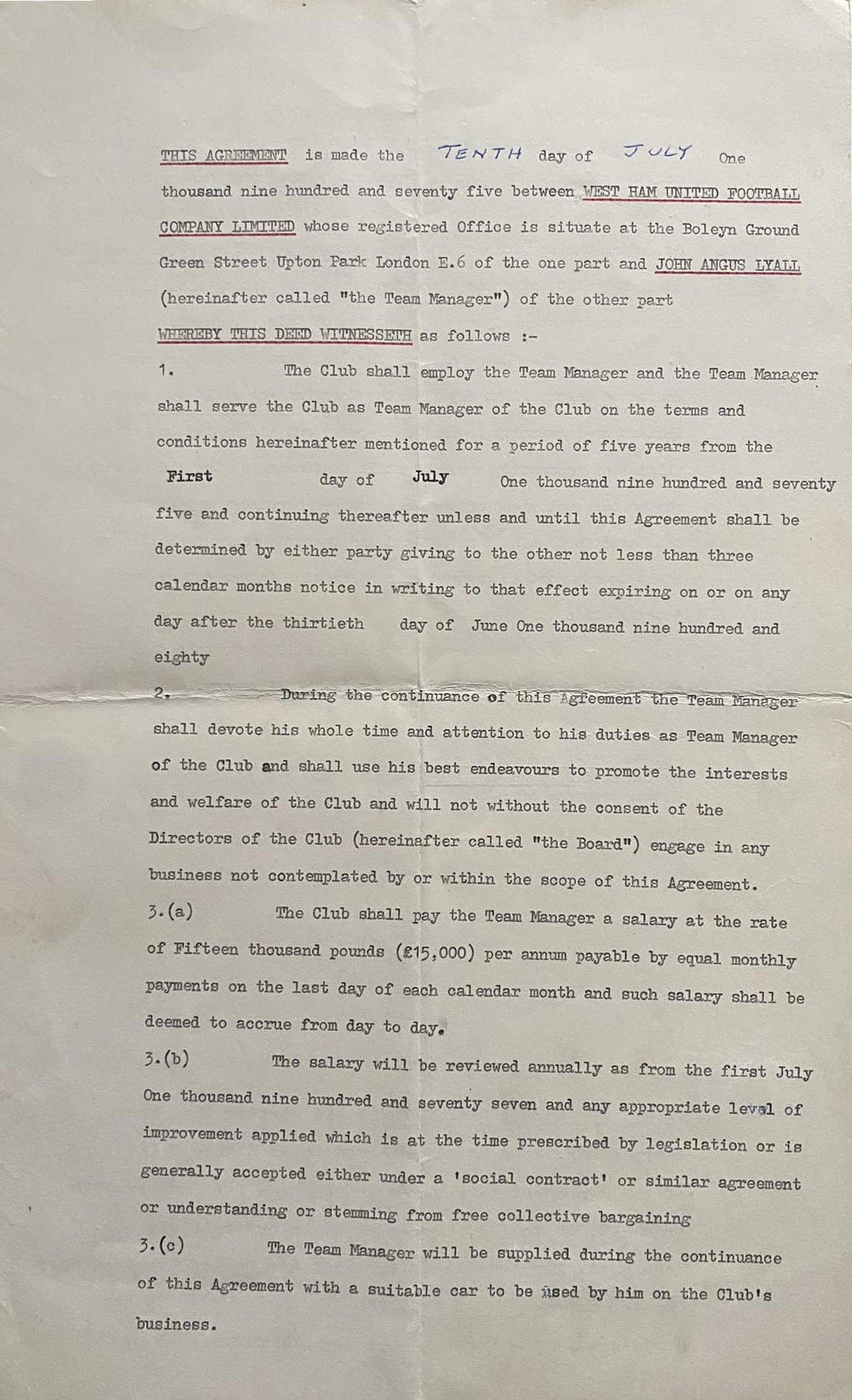 John Lyalls 1975 West Ham Football Managers Contract: Lyalls first ever full managers contract awarded in July 1975 after winning the FA Cup in his first part season where he was on trial.