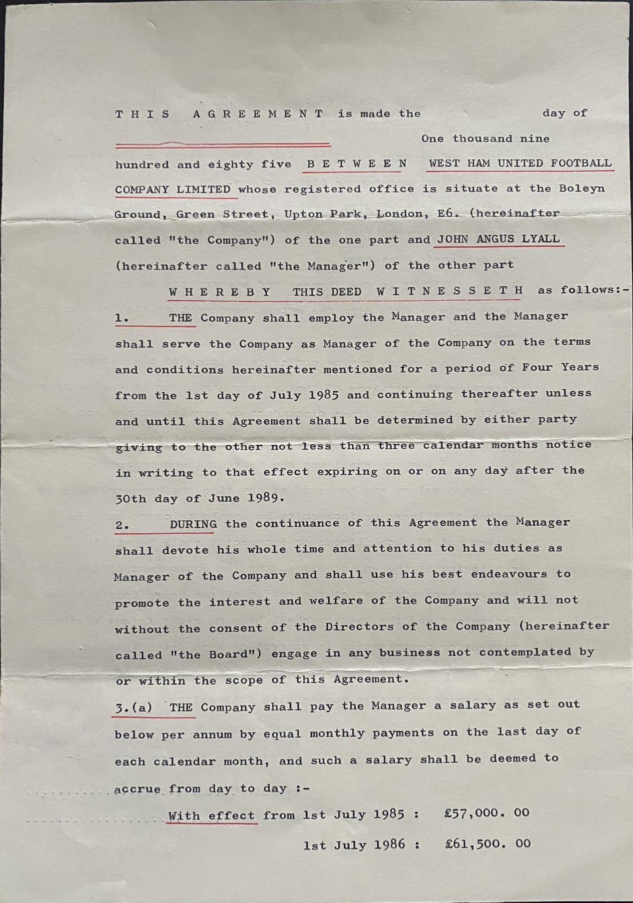 John Lyalls 1985 West Ham Football Managers Contract: In the season where West Ham achieved their highest place in division one. Includes some personal wranglings with the board after they blocked his lucrative move to QPR. The family do not wish to publish these but are willing to pass onto the buyer and would like them to remain in confidence. Details annual salary etc.