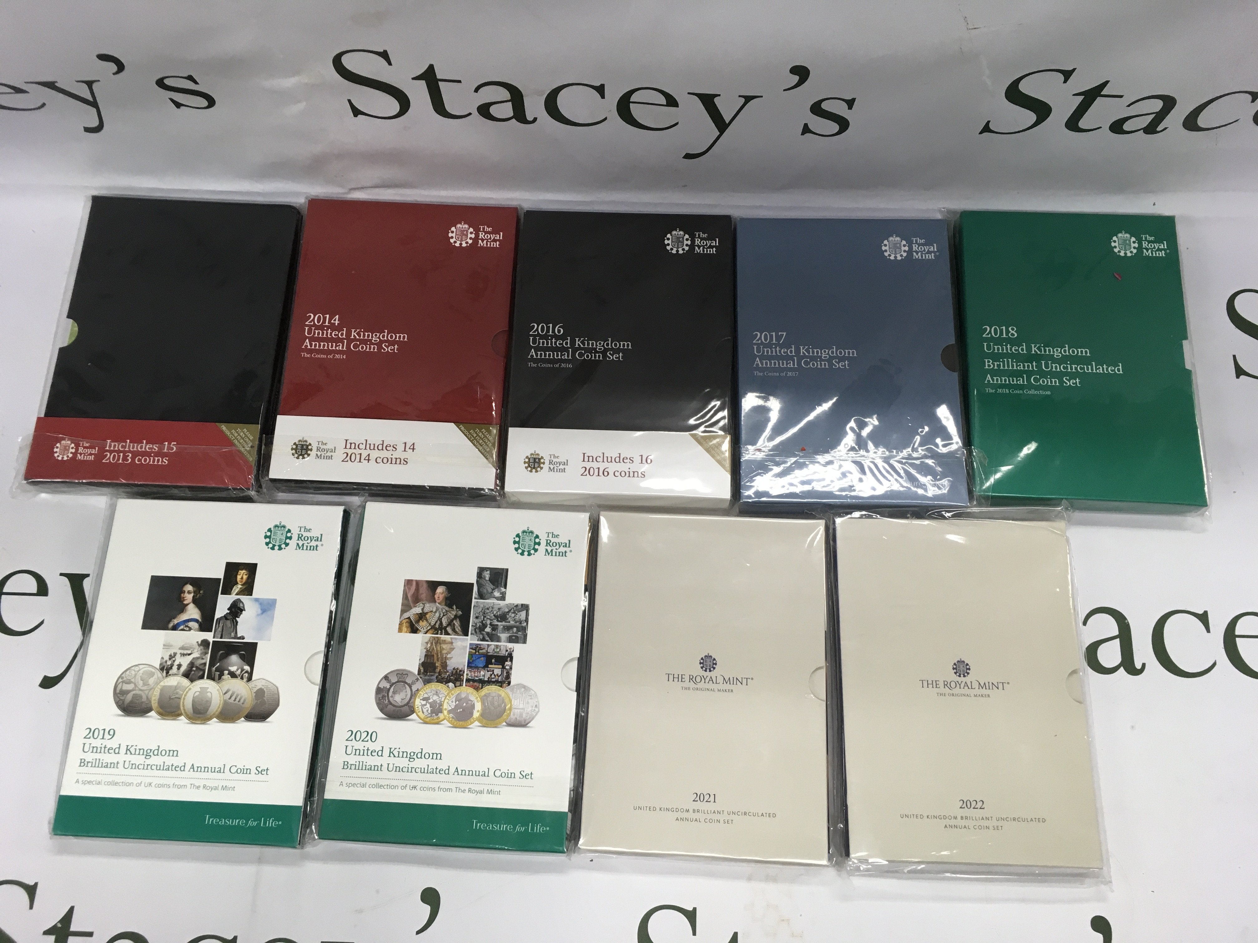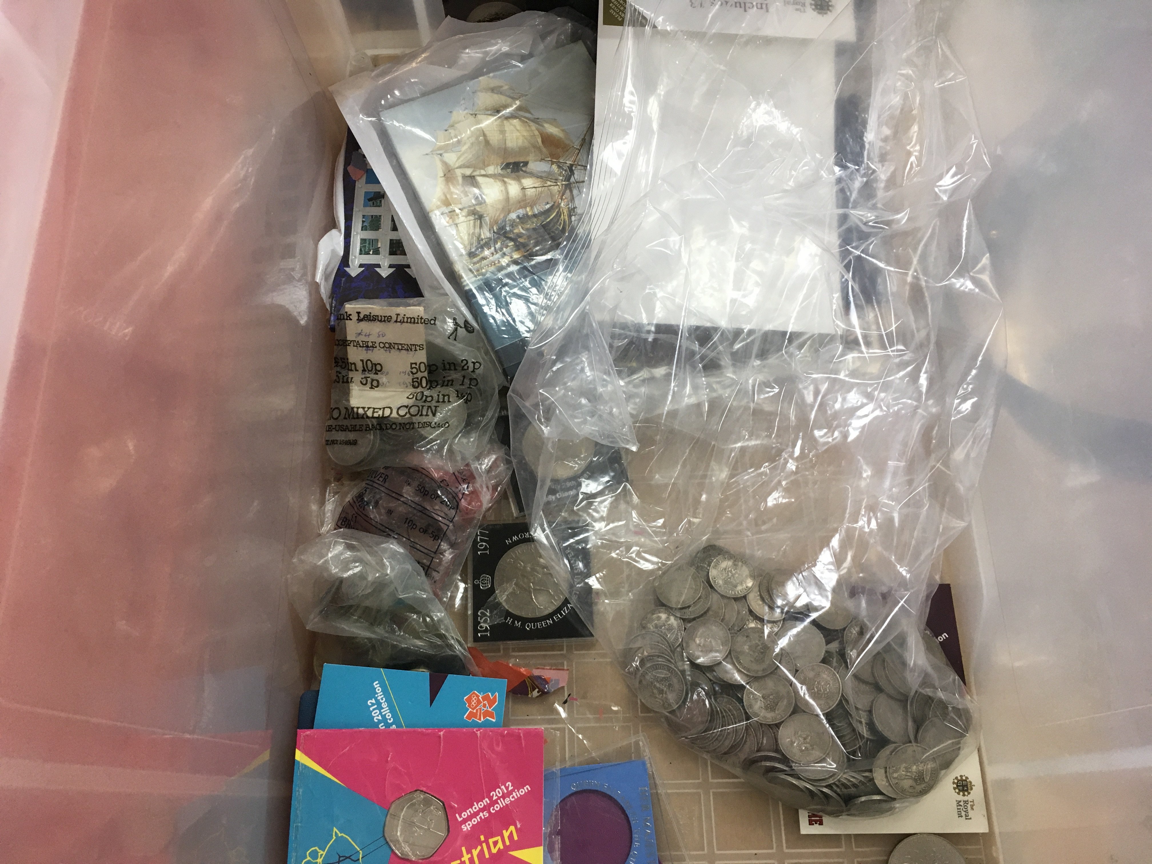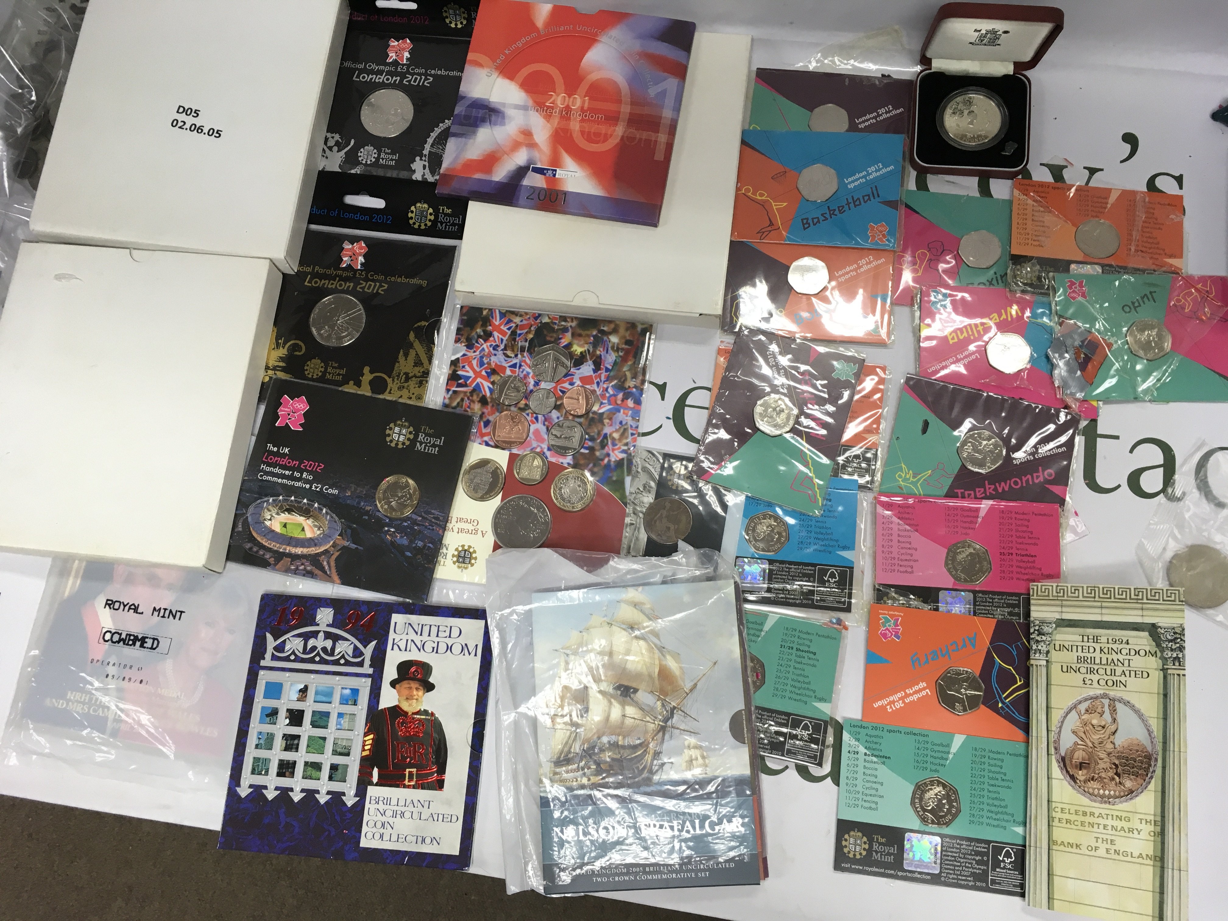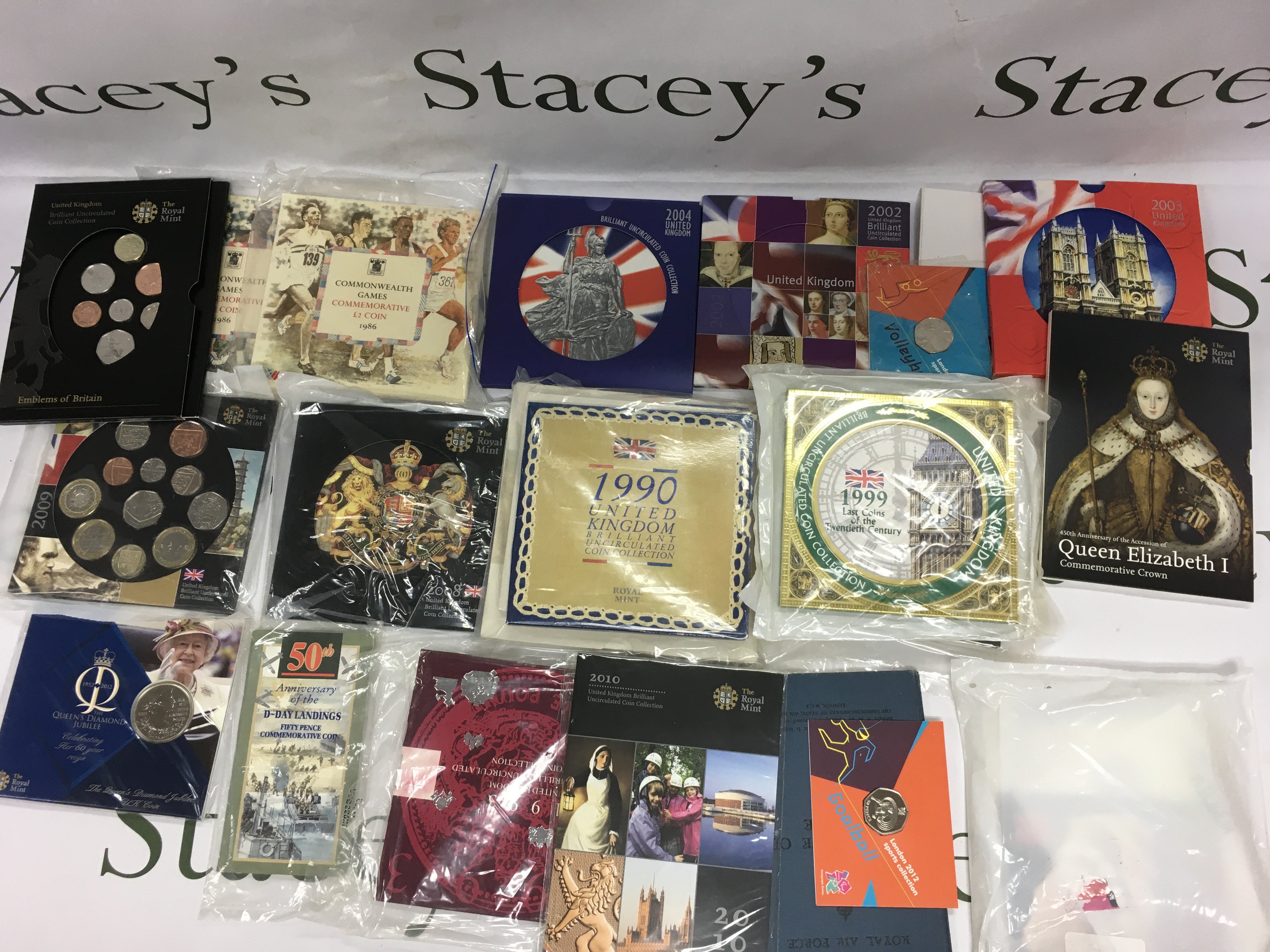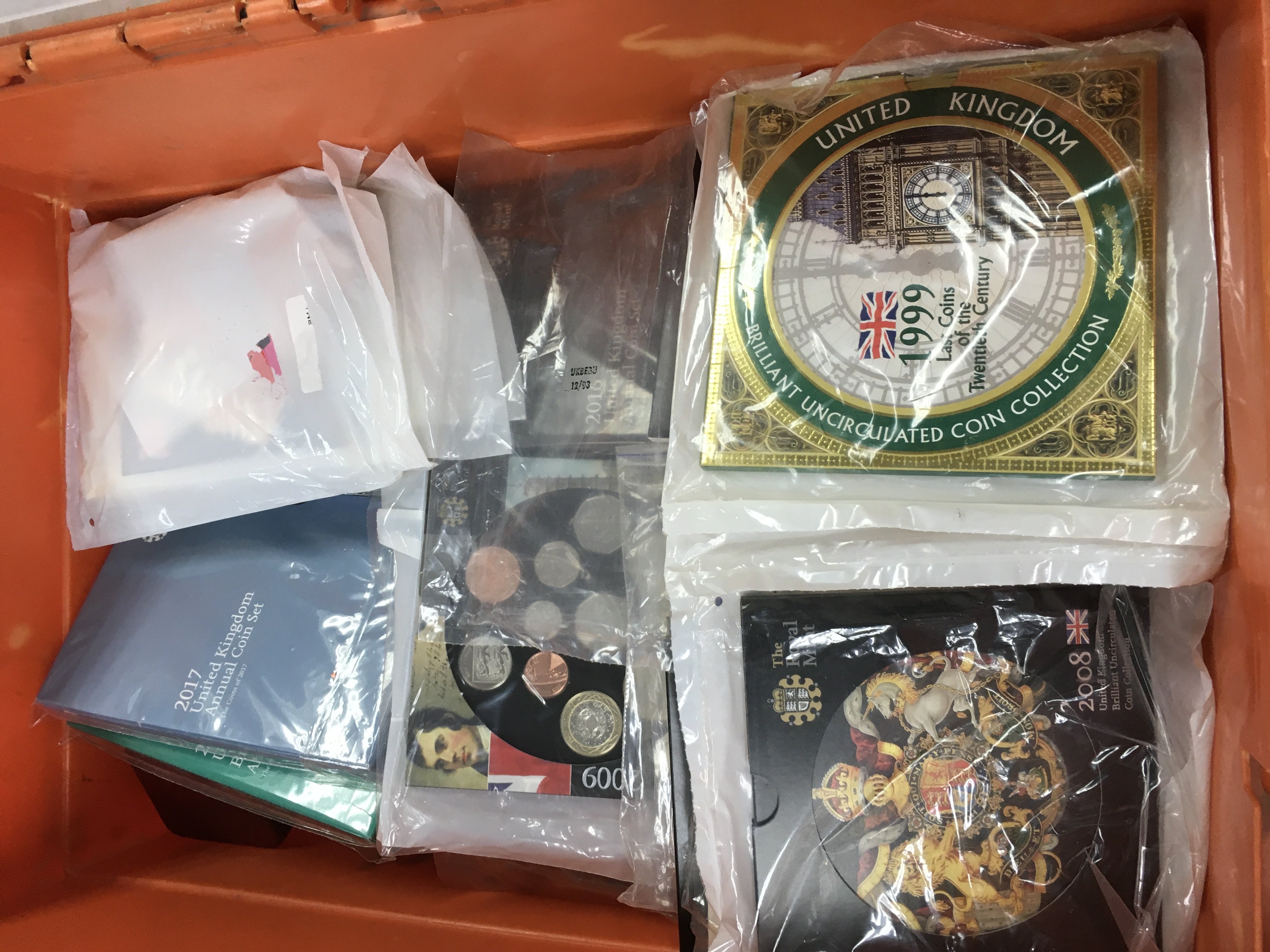 Two boxes containing Royal mint coins commemorative and uncirculated including nine Annual coin Sets London 50p and loose coinage various.