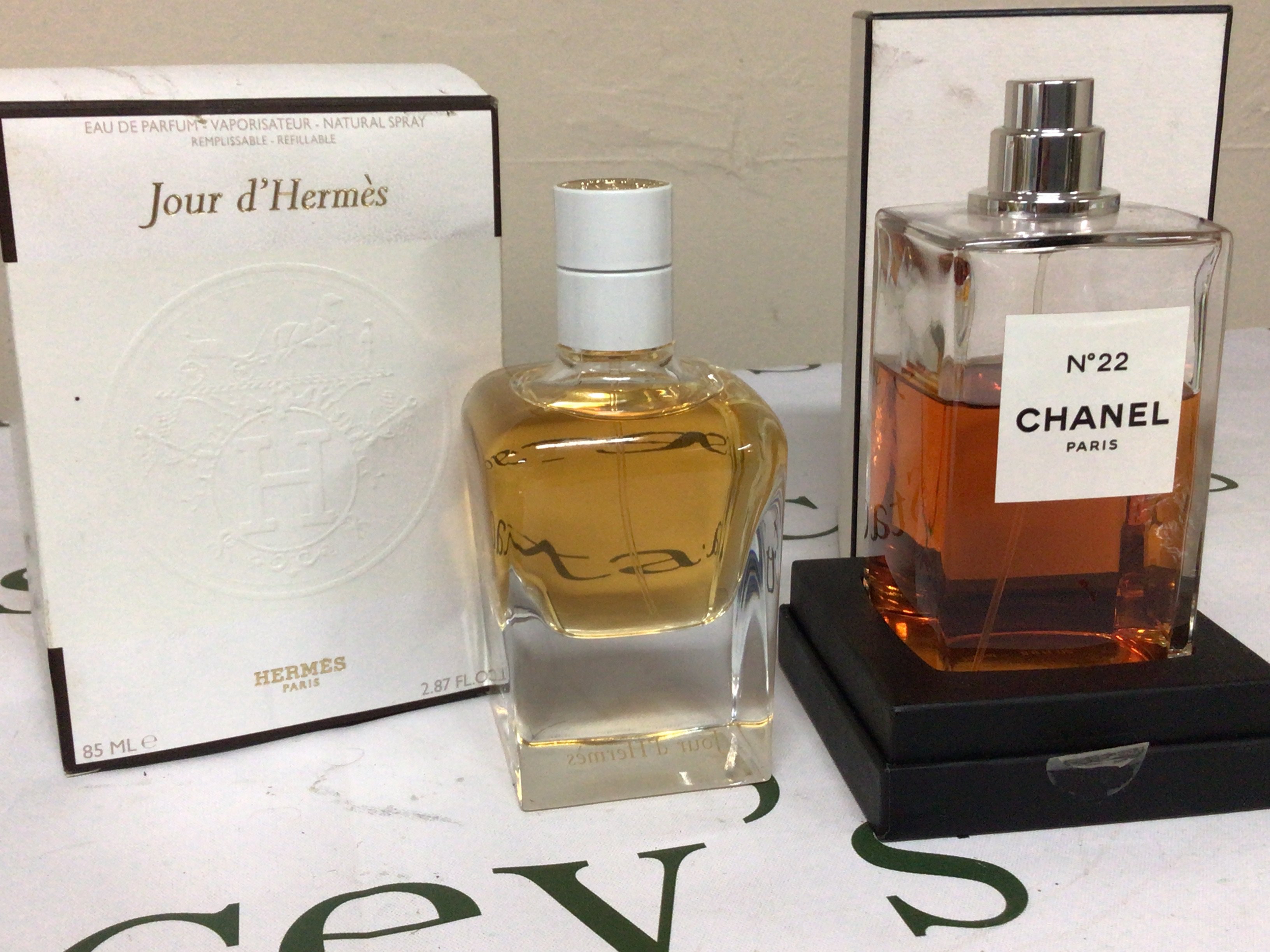 A Vintage bottle of 200ml Chanel No 22 perfume in a fitted box partly used and a bottle of Hermes Paris Perfume 85ml (2)
