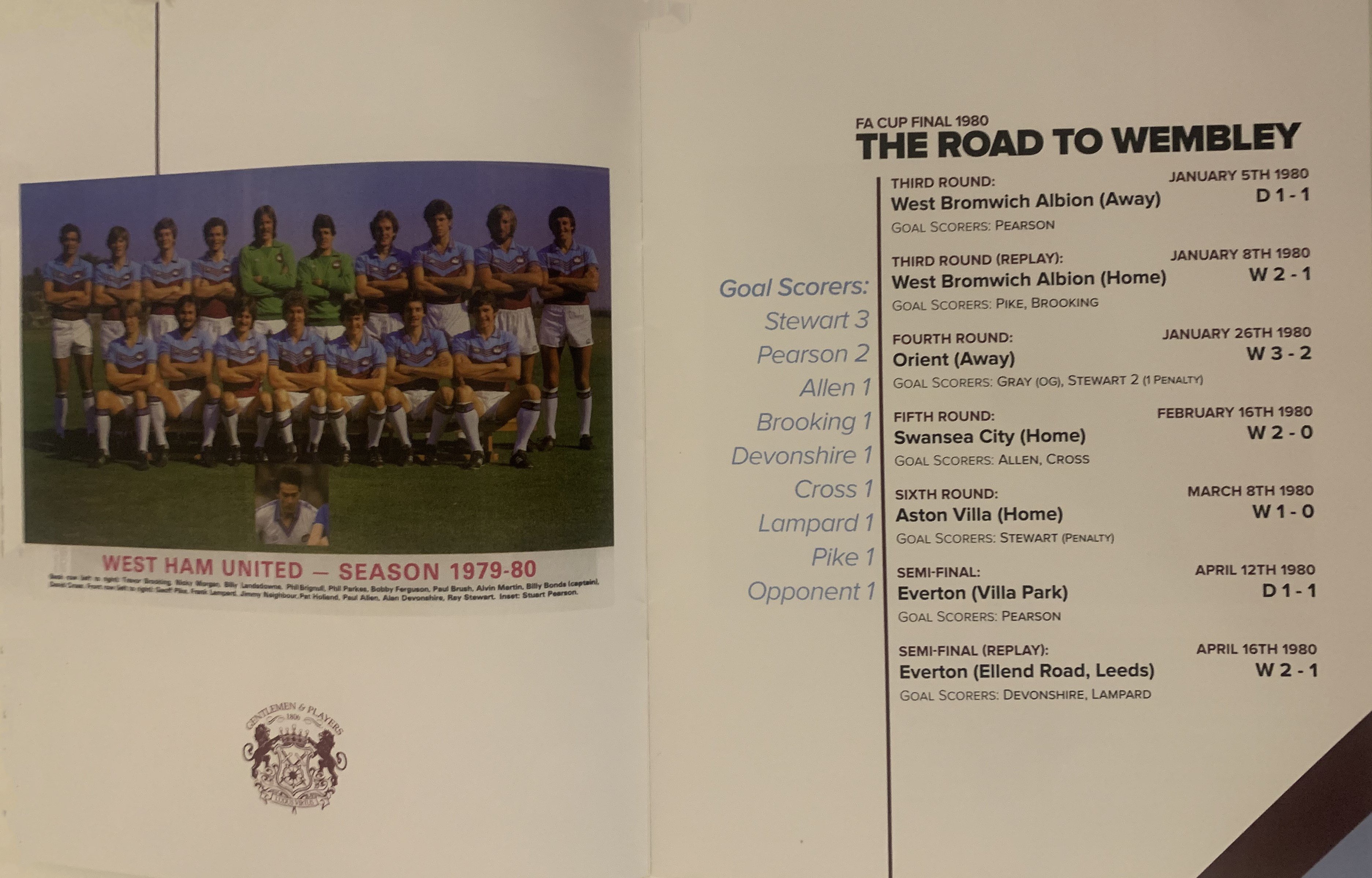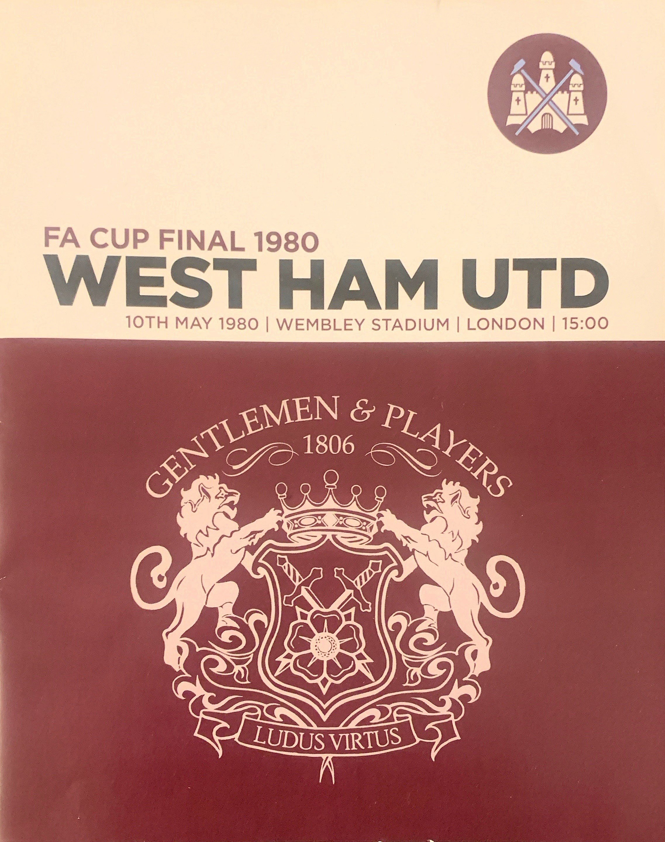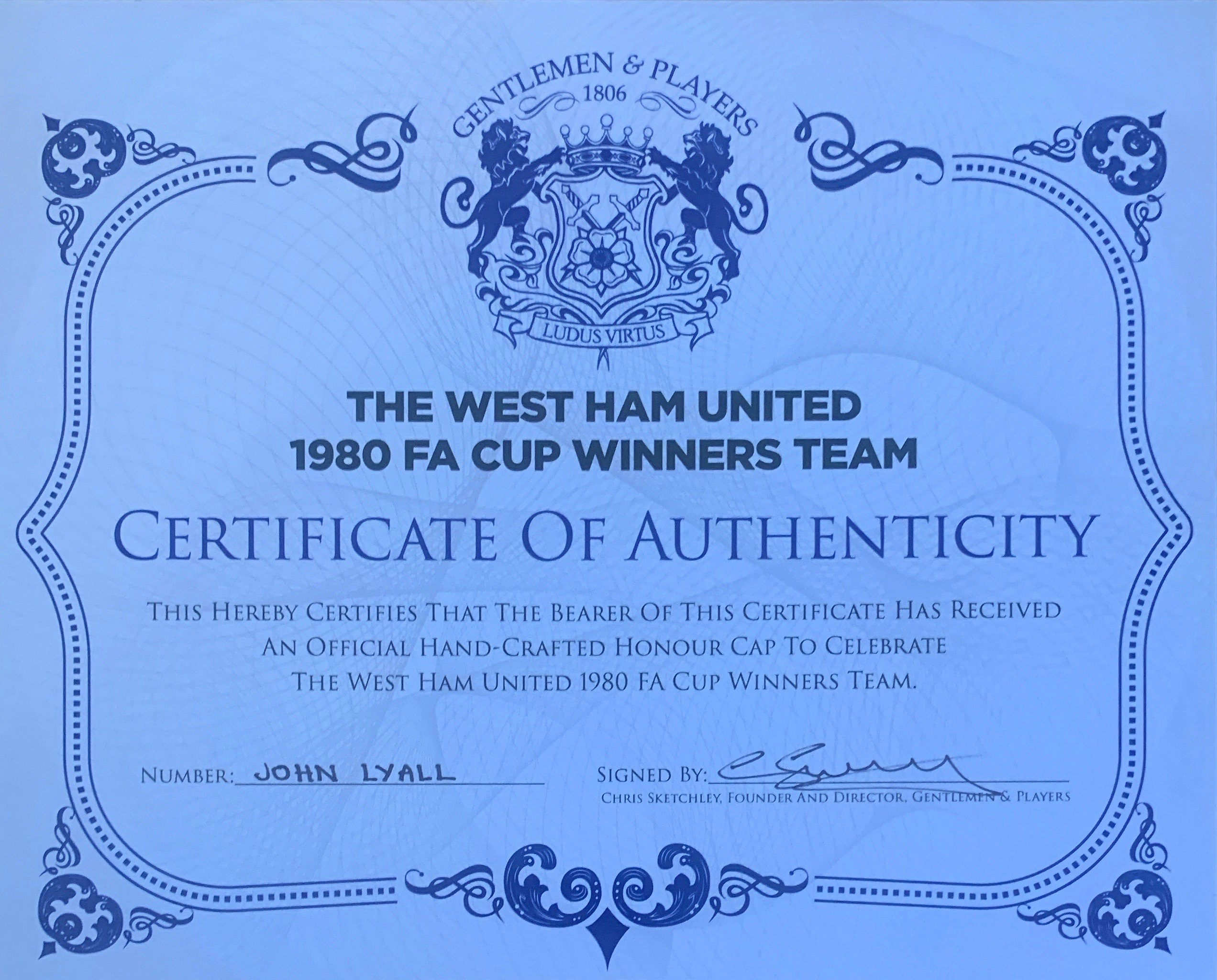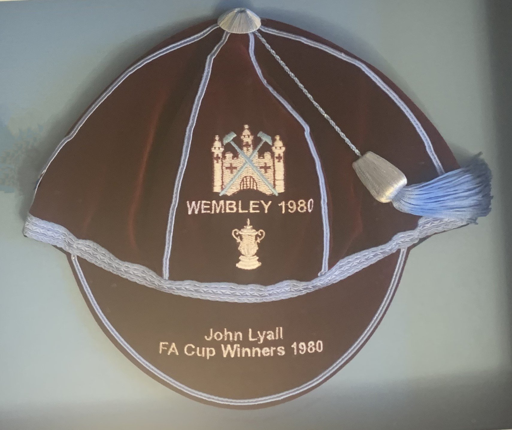 West Ham 1980 FA Cup Winners Football Cap: Stunning framed cap in a quality 800 x 550mm frame which includes photos of the team plus Lyall with trophy and leading the team out. COA from Gentlemen and Players caps who along with Tony Gale presented the cap on 11 10 2018 to the family of John Lyall.