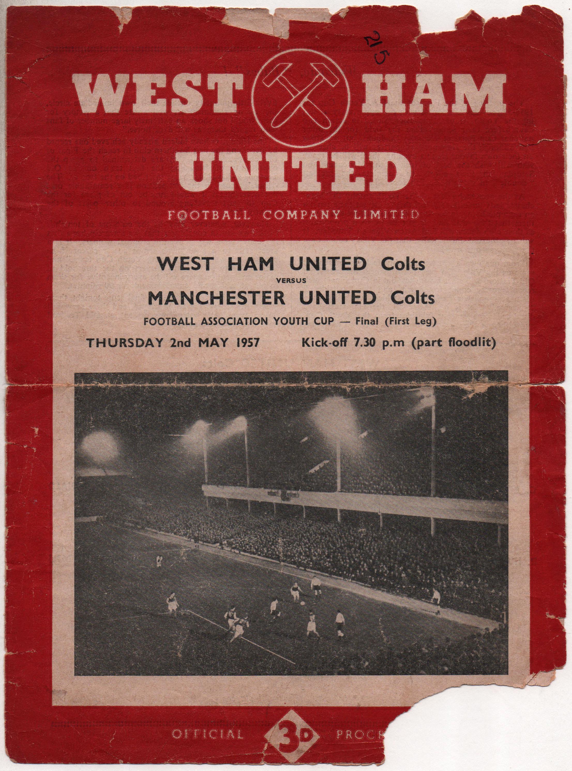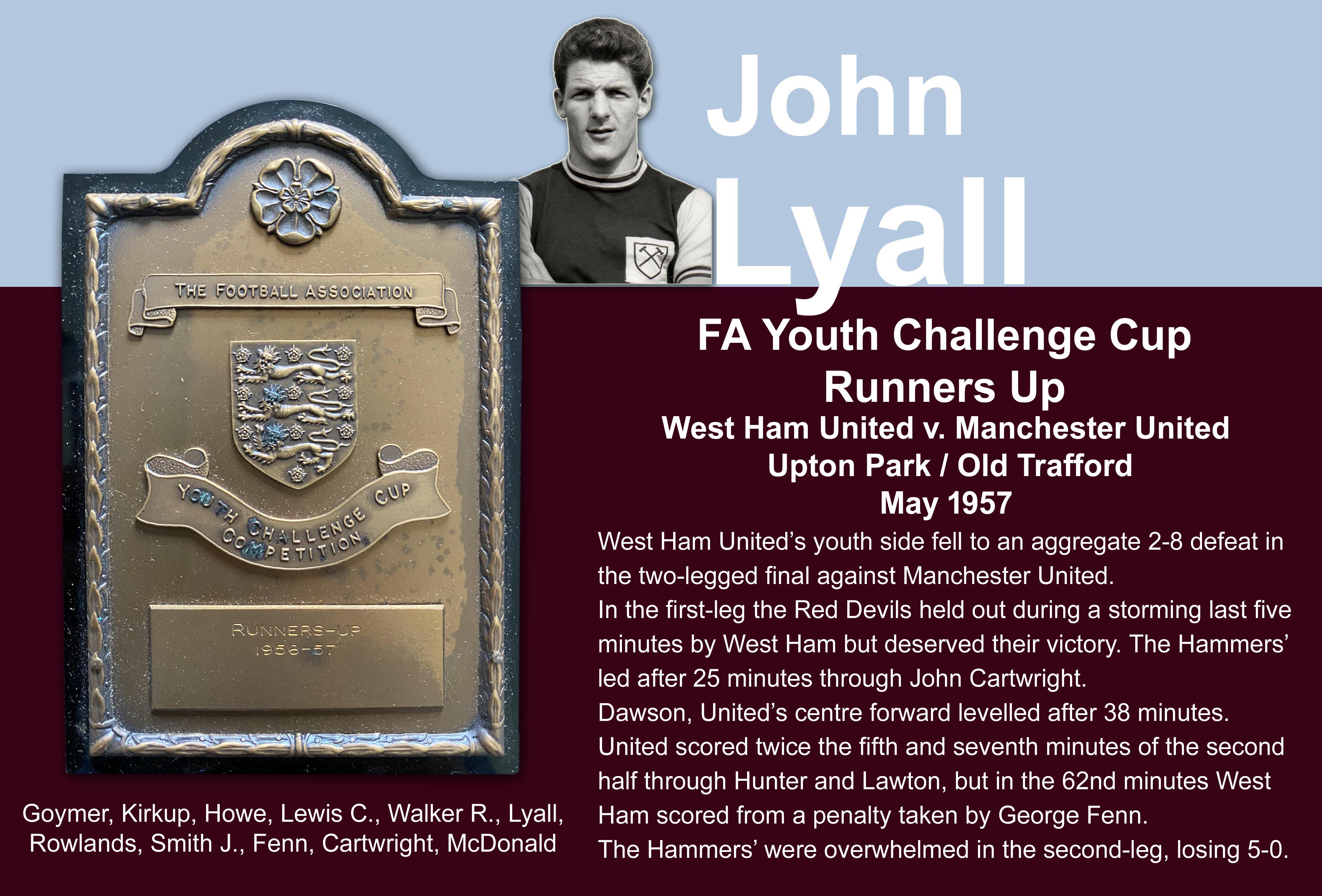 1957 John Lyalls West Ham Youth Cup Final Plaque: Attractive shield in original box engraved J Lyall. West Ham were runners up after losing the two legged final to Manchester United. Lyalls poor condition programme included.