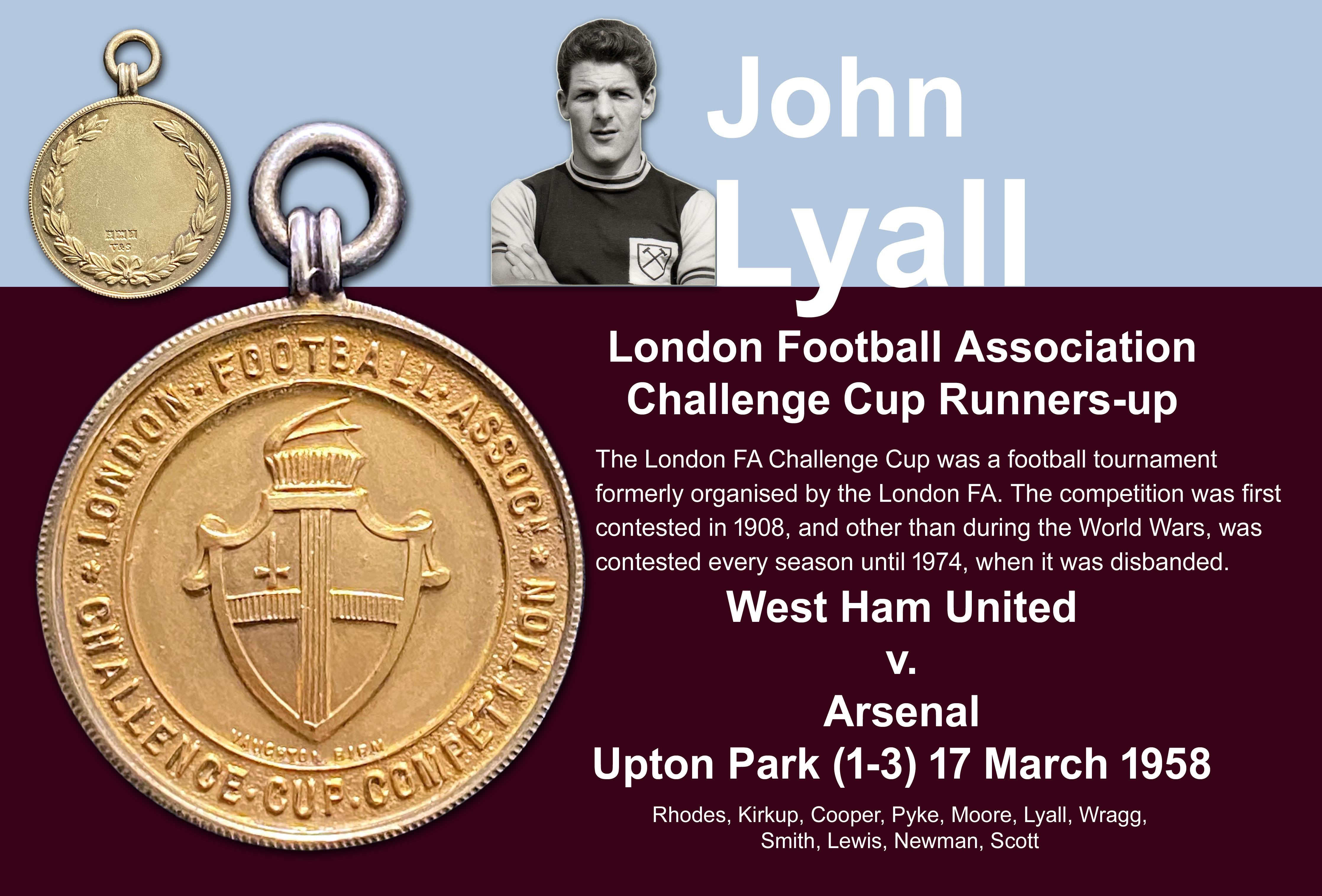 John Lyalls West Ham London FA Cup Football Medal: Quality silver gilt medal in original Vaughtons + Sons box. West Ham were runners up after being defeated by Arsenal on 17 3 1958 at Upton Park.