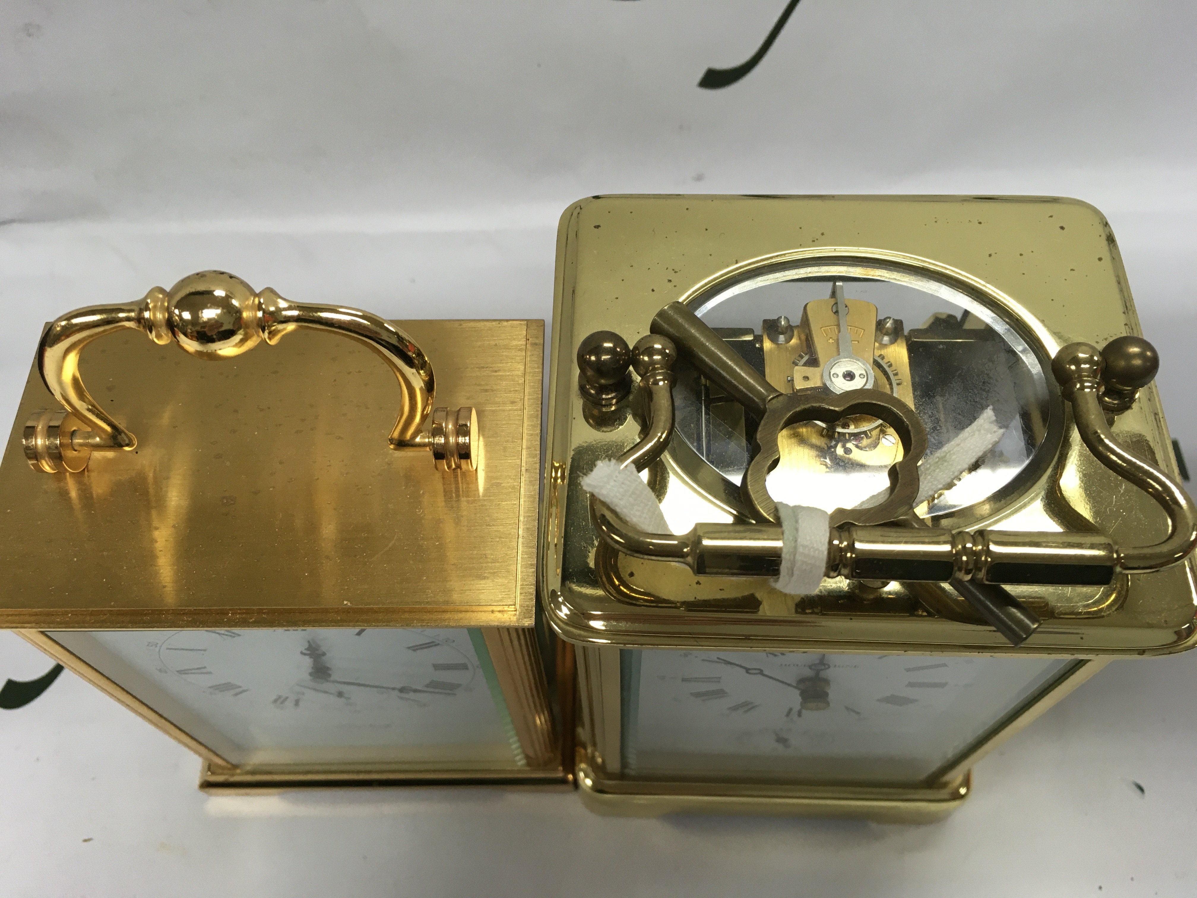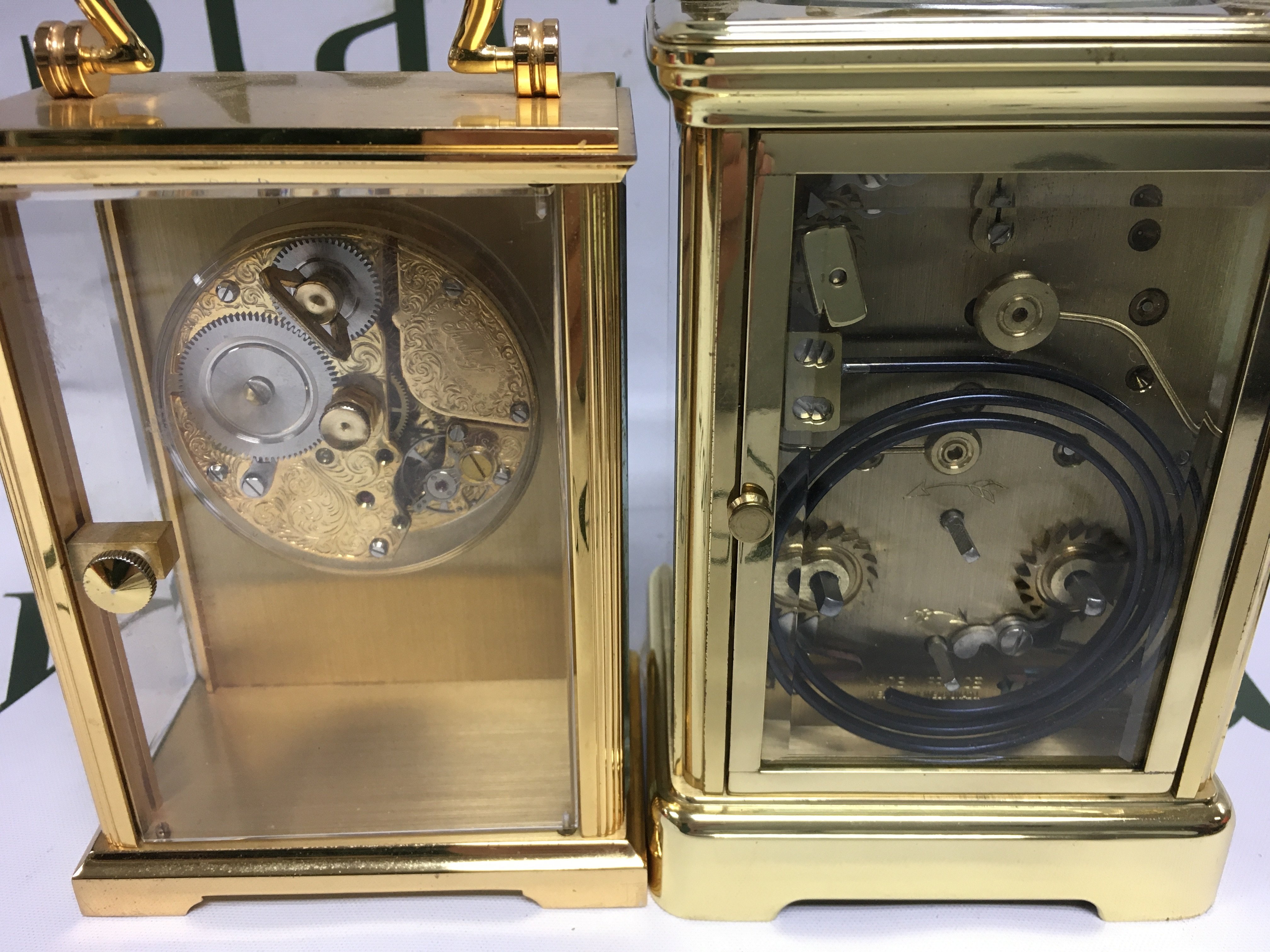 Two gilt carriage clock the dials with Roman numerals and second subsidiary dials one with strike repeat button.