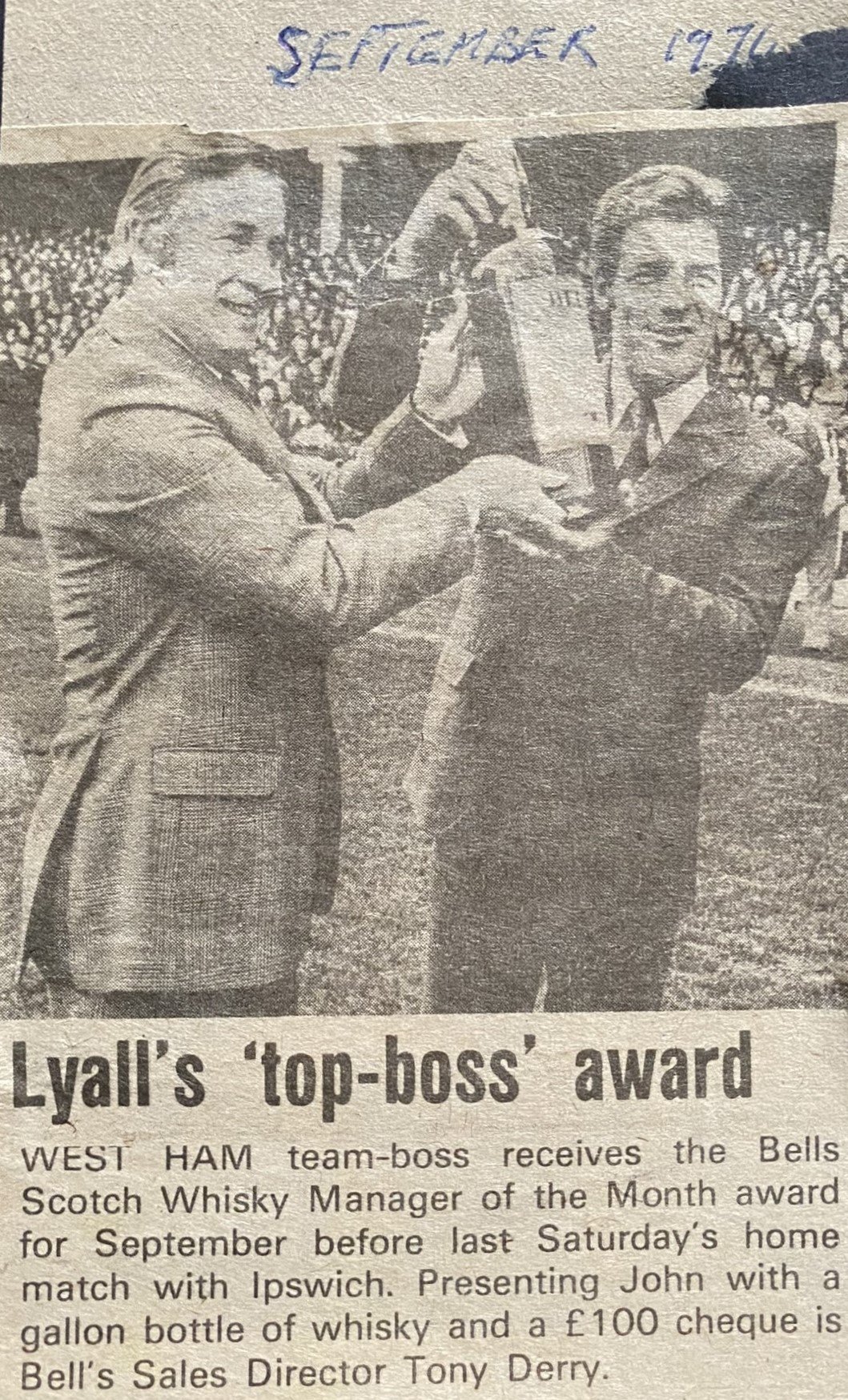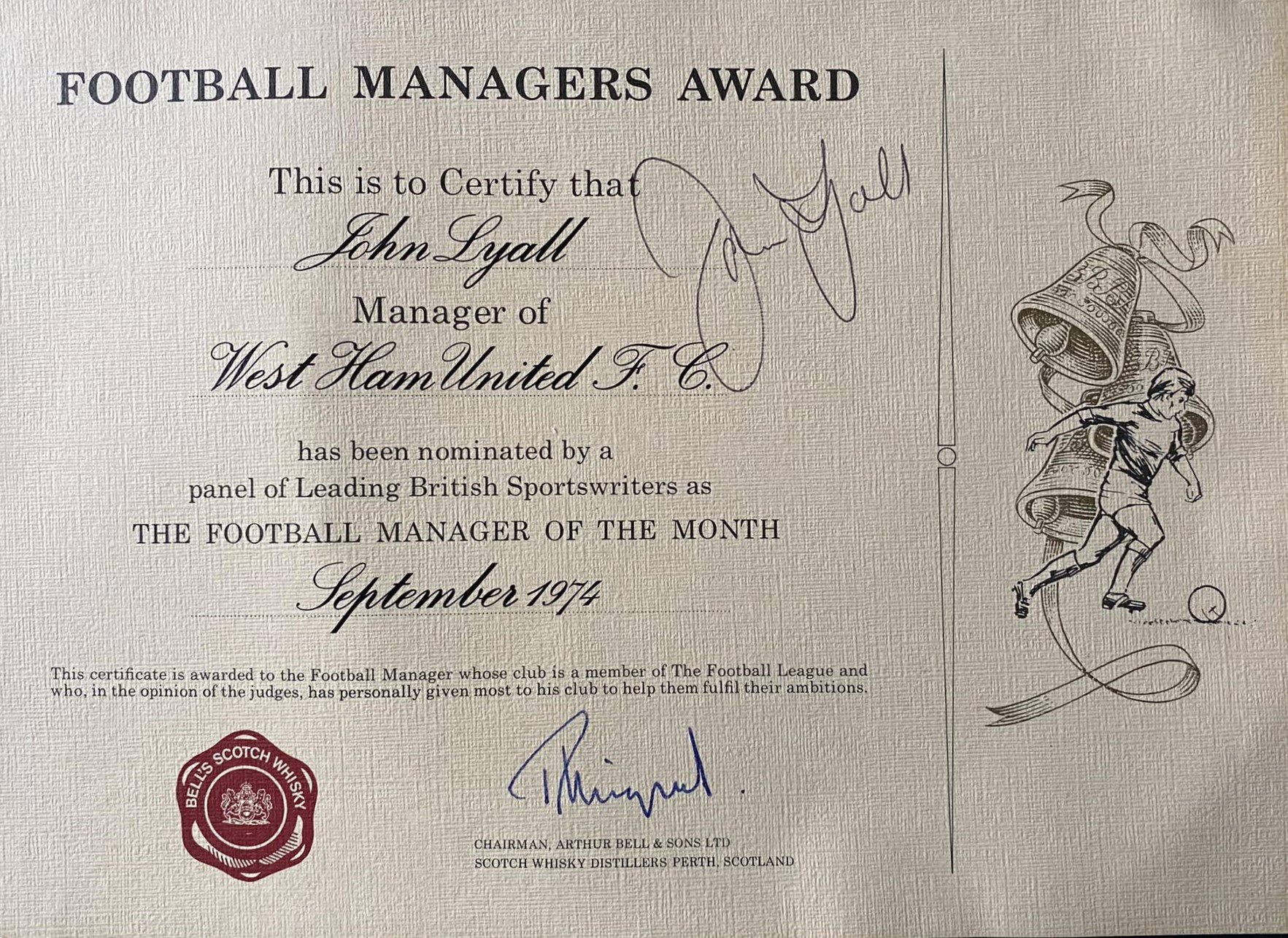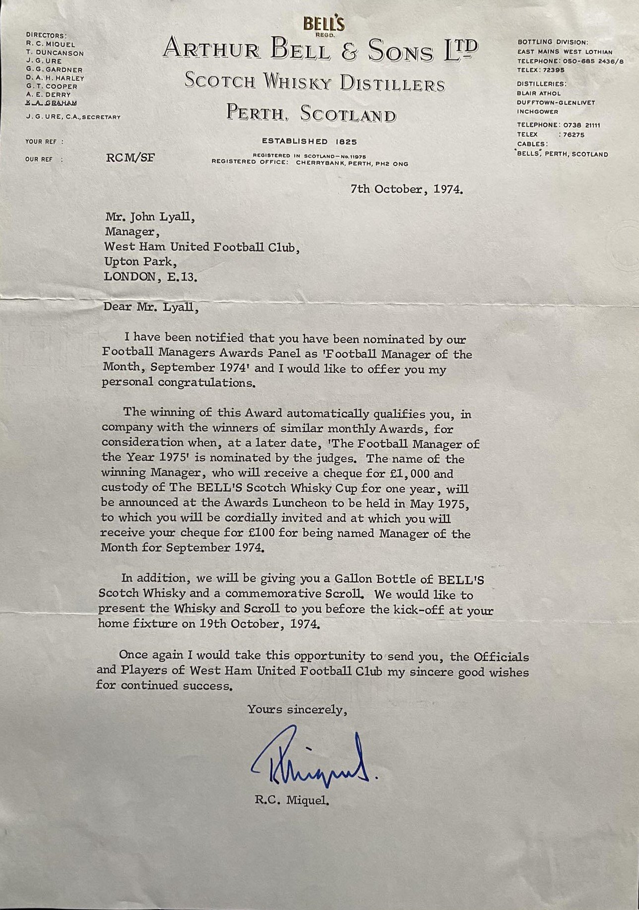 John Lyalls 1974 West Ham Manager Of The Month Award: Surely a one off sign of whats to come from West Hams greatest manager. Certificate letter and newspaper cutting for Lyalls first month in charge of West Ham in September 1974 when he was awarded this from Bells Scotch Whisky.