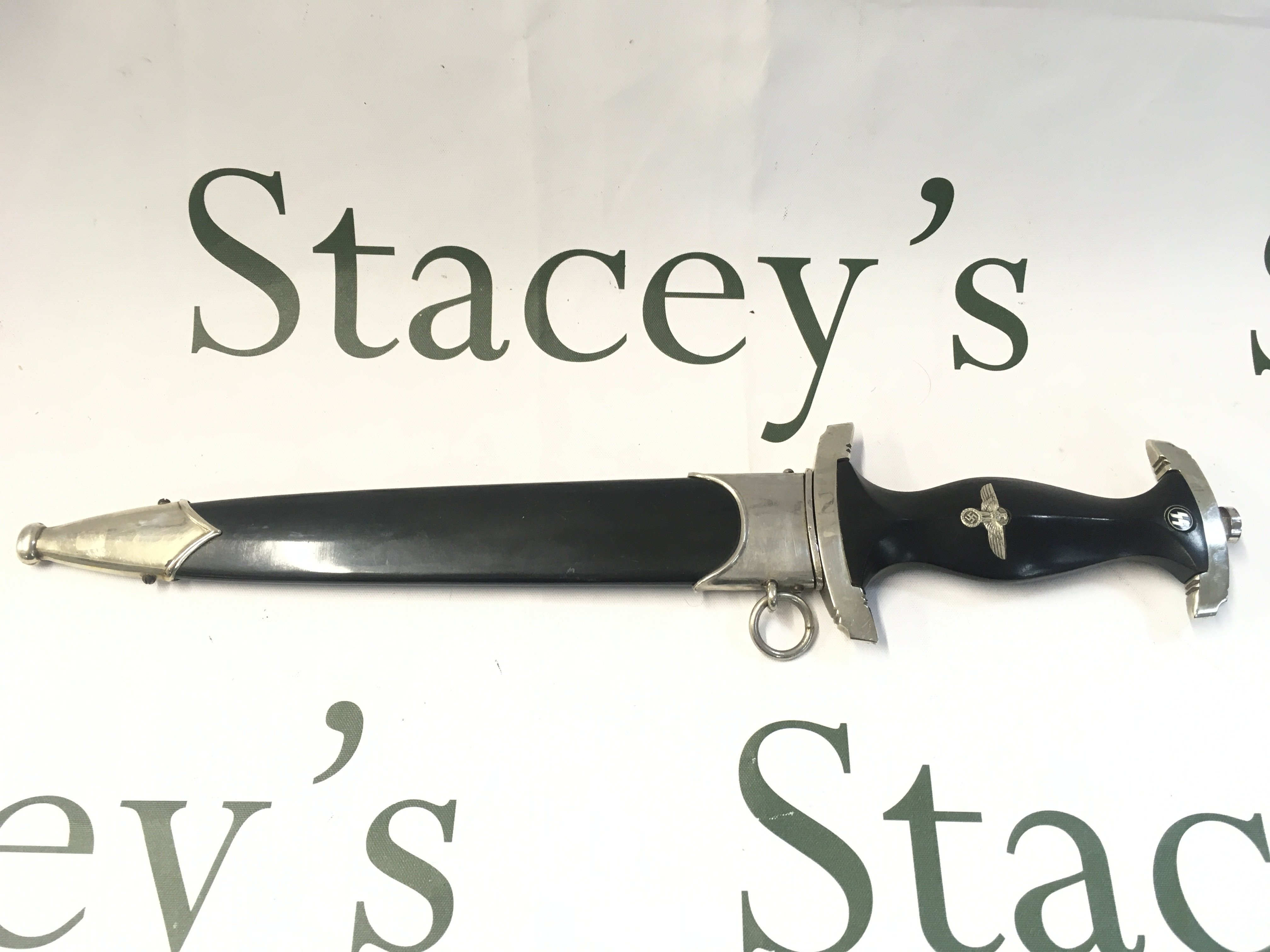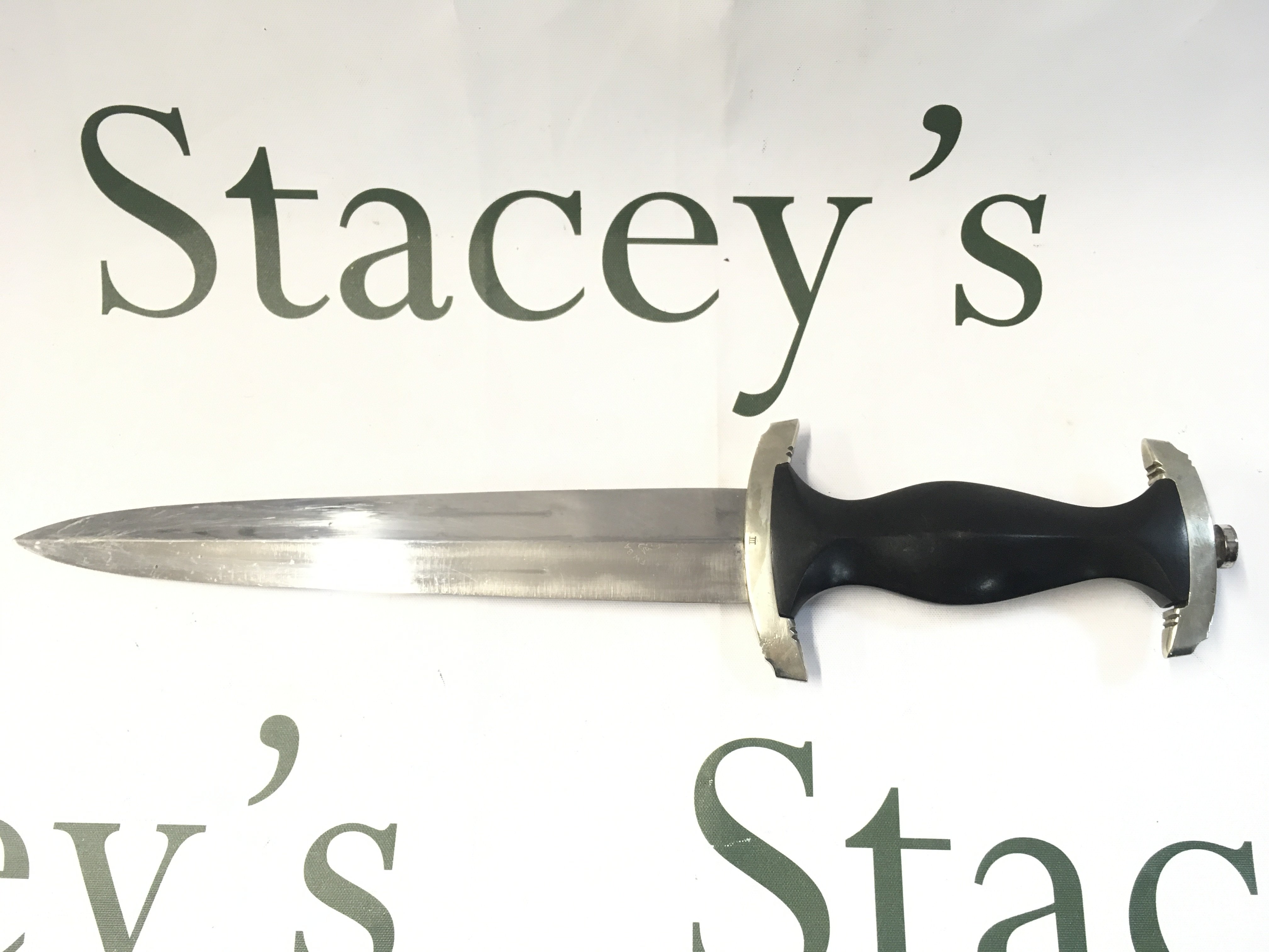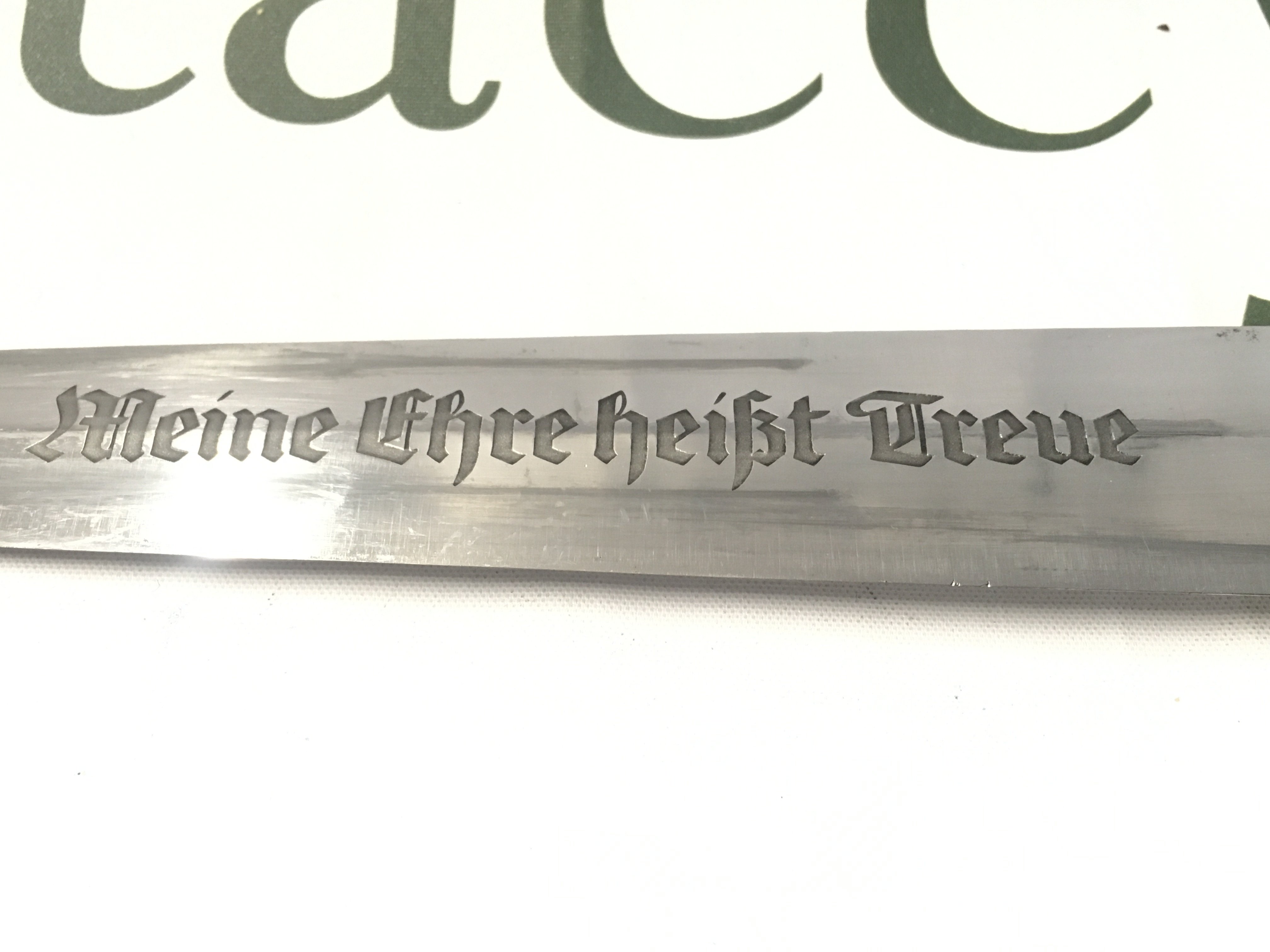 A very rare WW2 Third Reich SS dagger blade by F.W Backhaus with an original anodised scabbard, District III. blade 21.5cm long, total length 27.5cm long approximately.