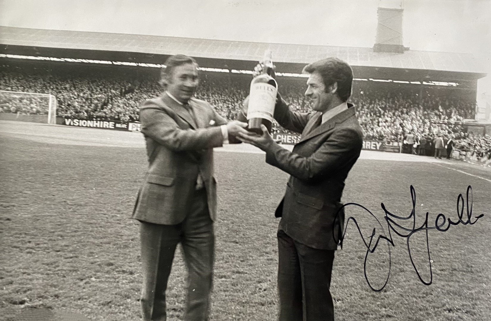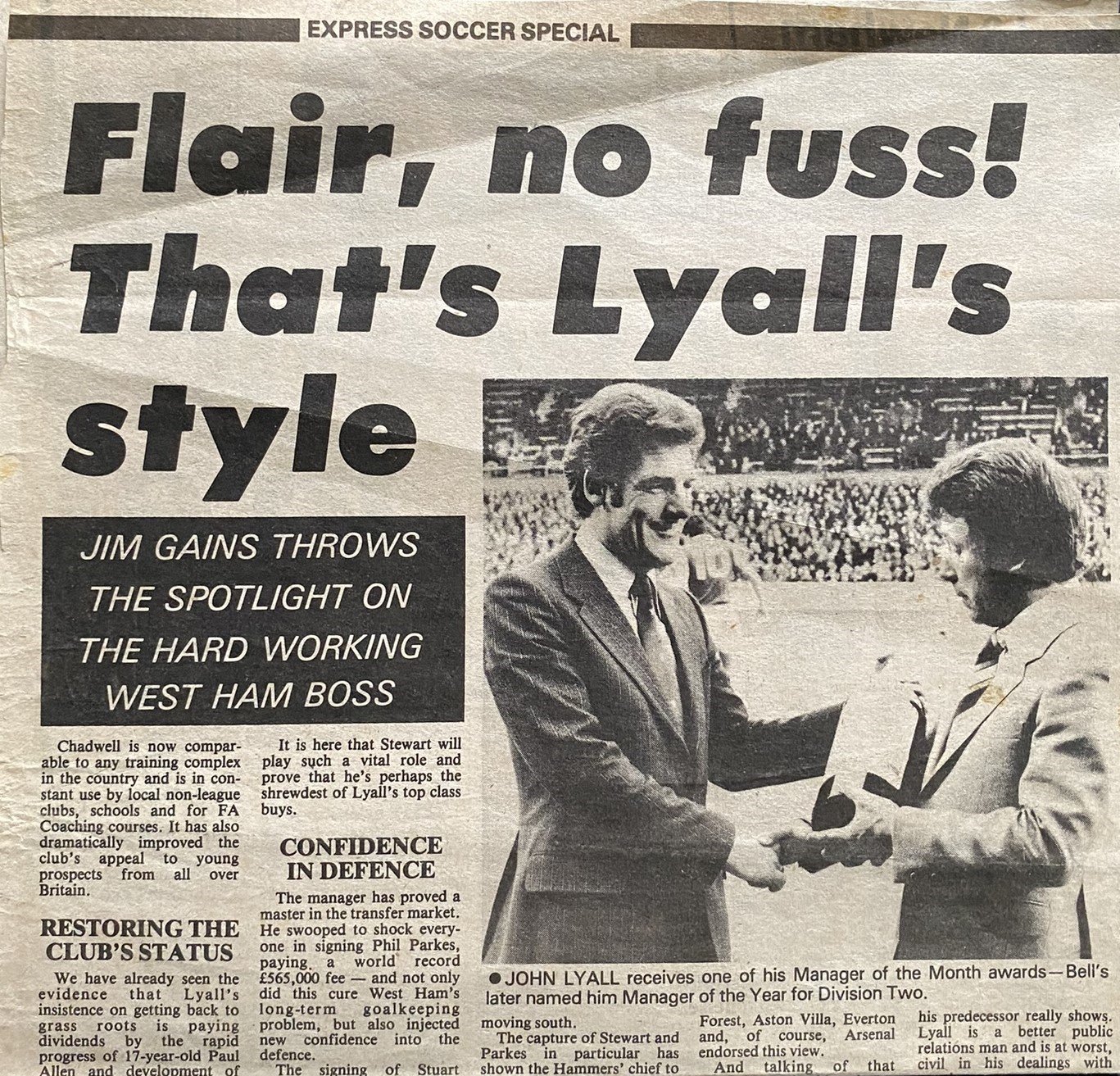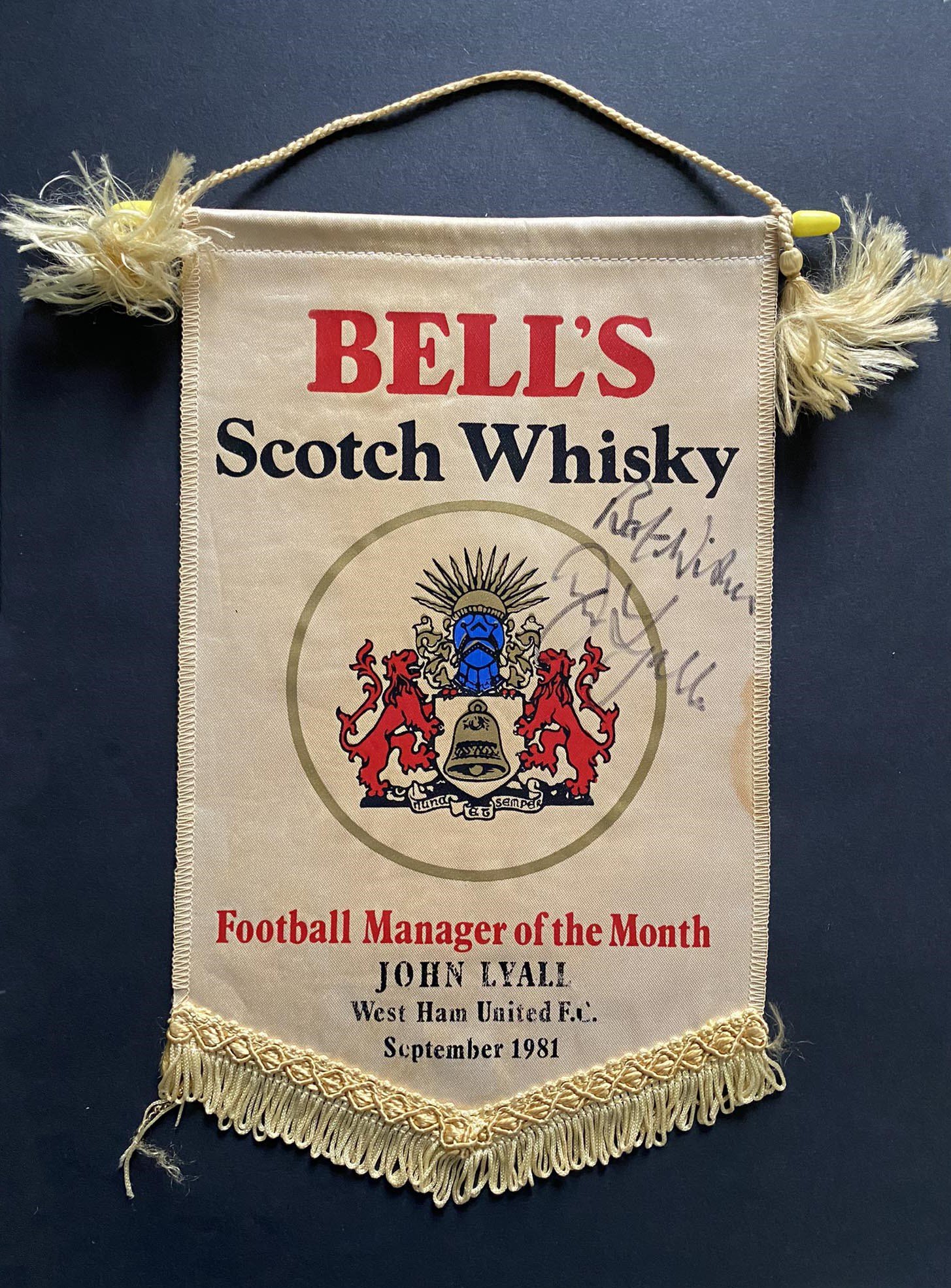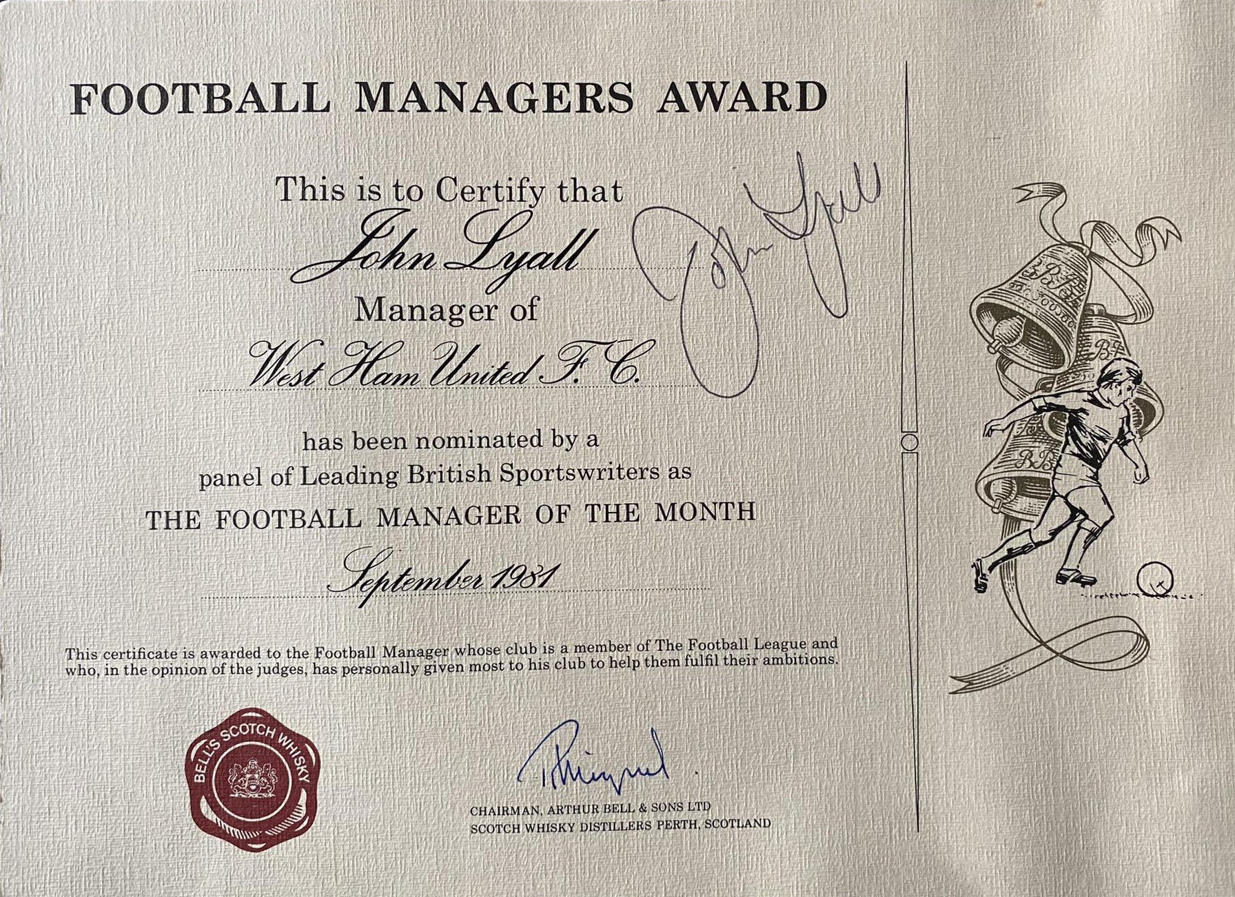 John Lyalls 1981 West Ham Manager Of The Month Award: Certificate, pennant and photo all of which are signed by Lyall. C/W newspaper cutting from September 1981 where he was awarded this from Bells Scotch Whisky.