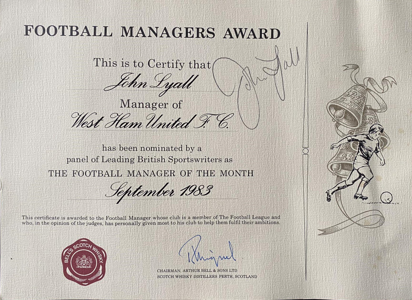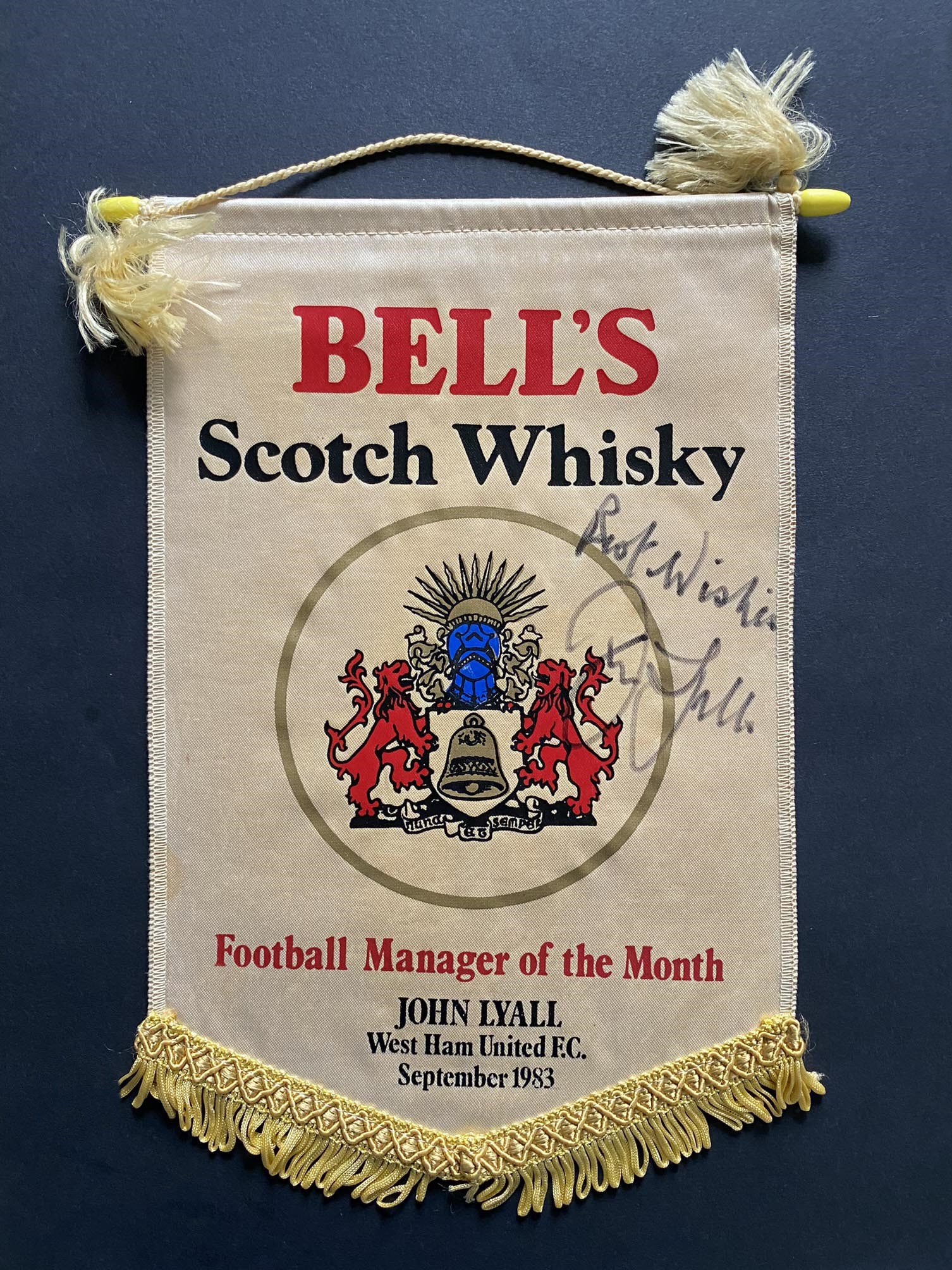John Lyalls 1983 West Ham Manager Of The Month Award: Pennant signed by Lyall. C/W certificate which is also signed from September 1983 when he was awarded this from Bells Scotch Whisky.