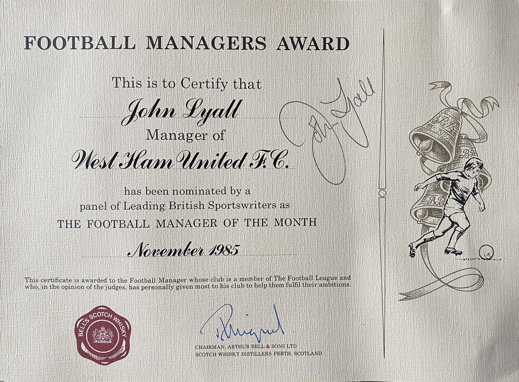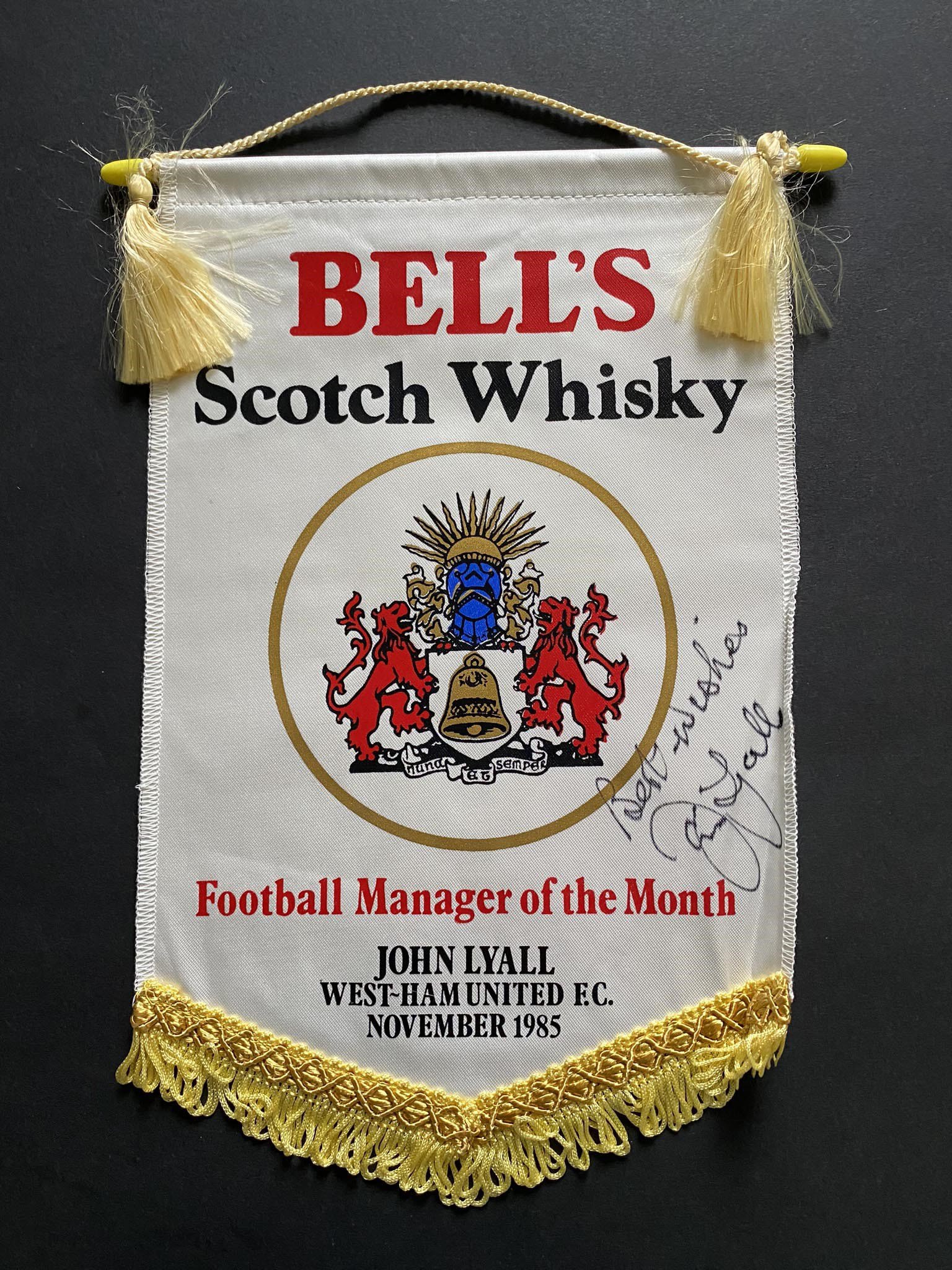 John Lyalls 1985 West Ham Manager Of The Month Award: Pennant signed by Lyall. C/W signed certificate from November 1985 when he was awarded this from Bells Scotch Whisky.
