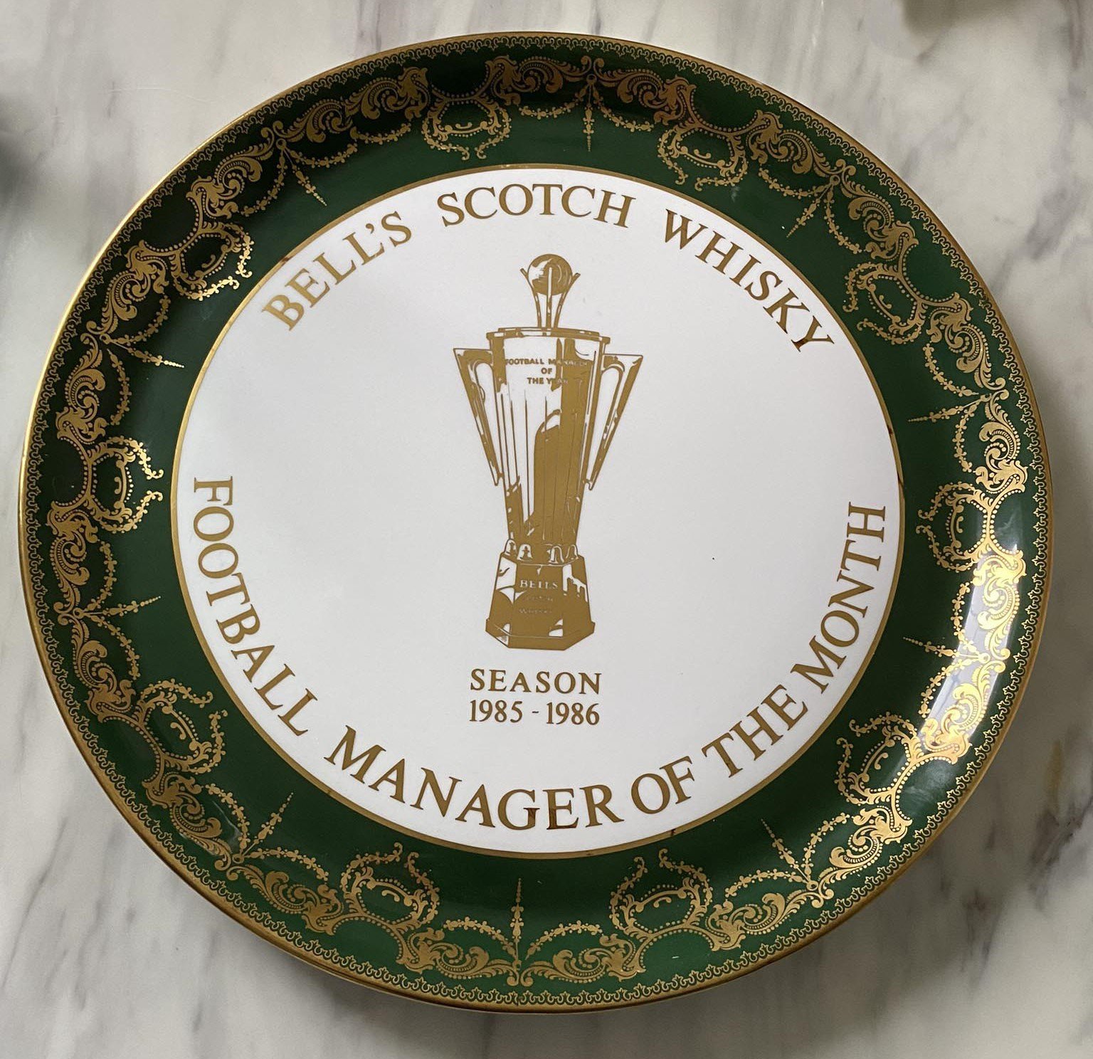 John Lyalls 85/86 West Ham Manager Of The Month Award: Large ceramic plate by Aynsley China from the famous 3rd placed 85/86 season when he was awarded this from Bells Scotch Whisky.