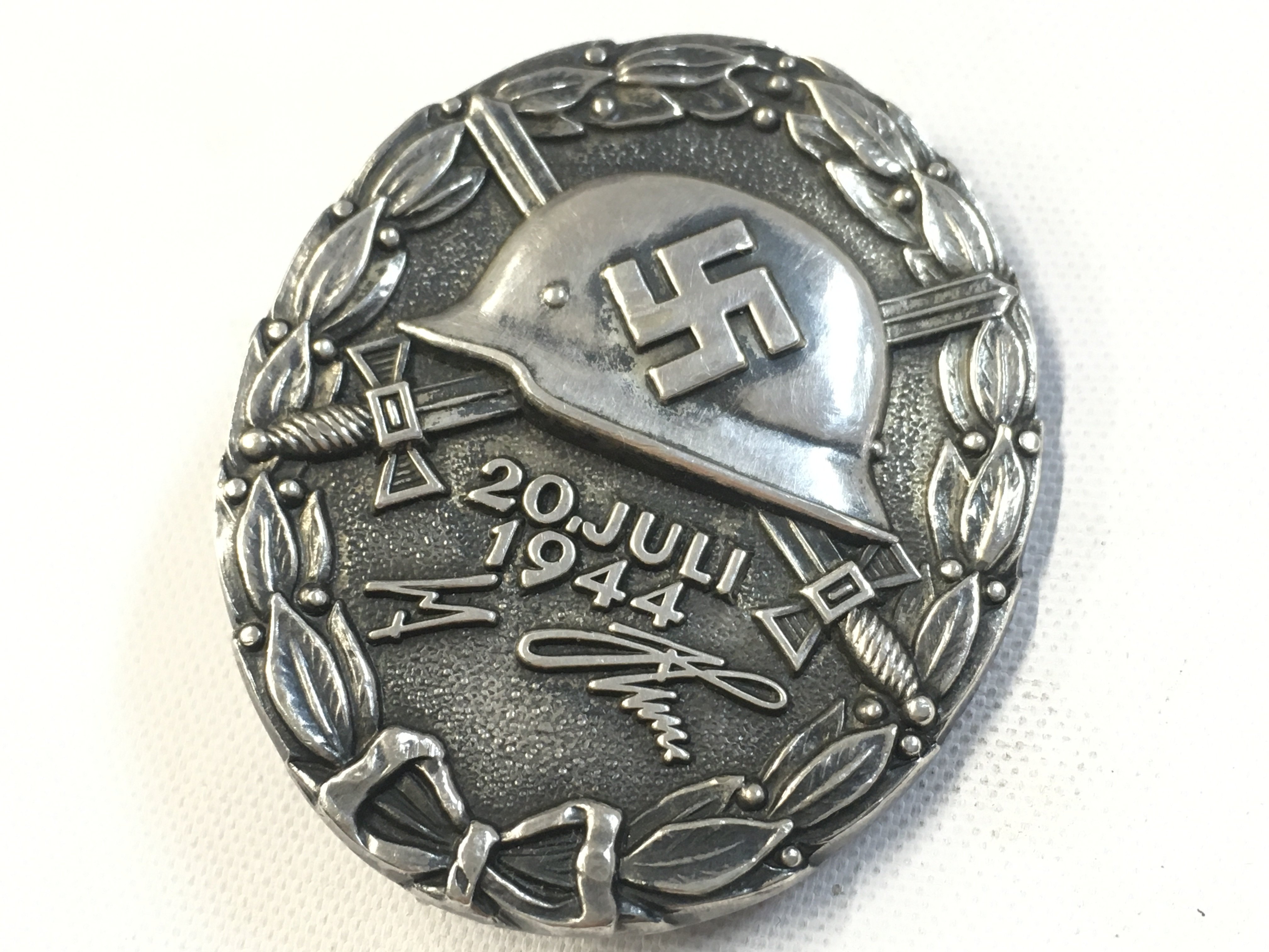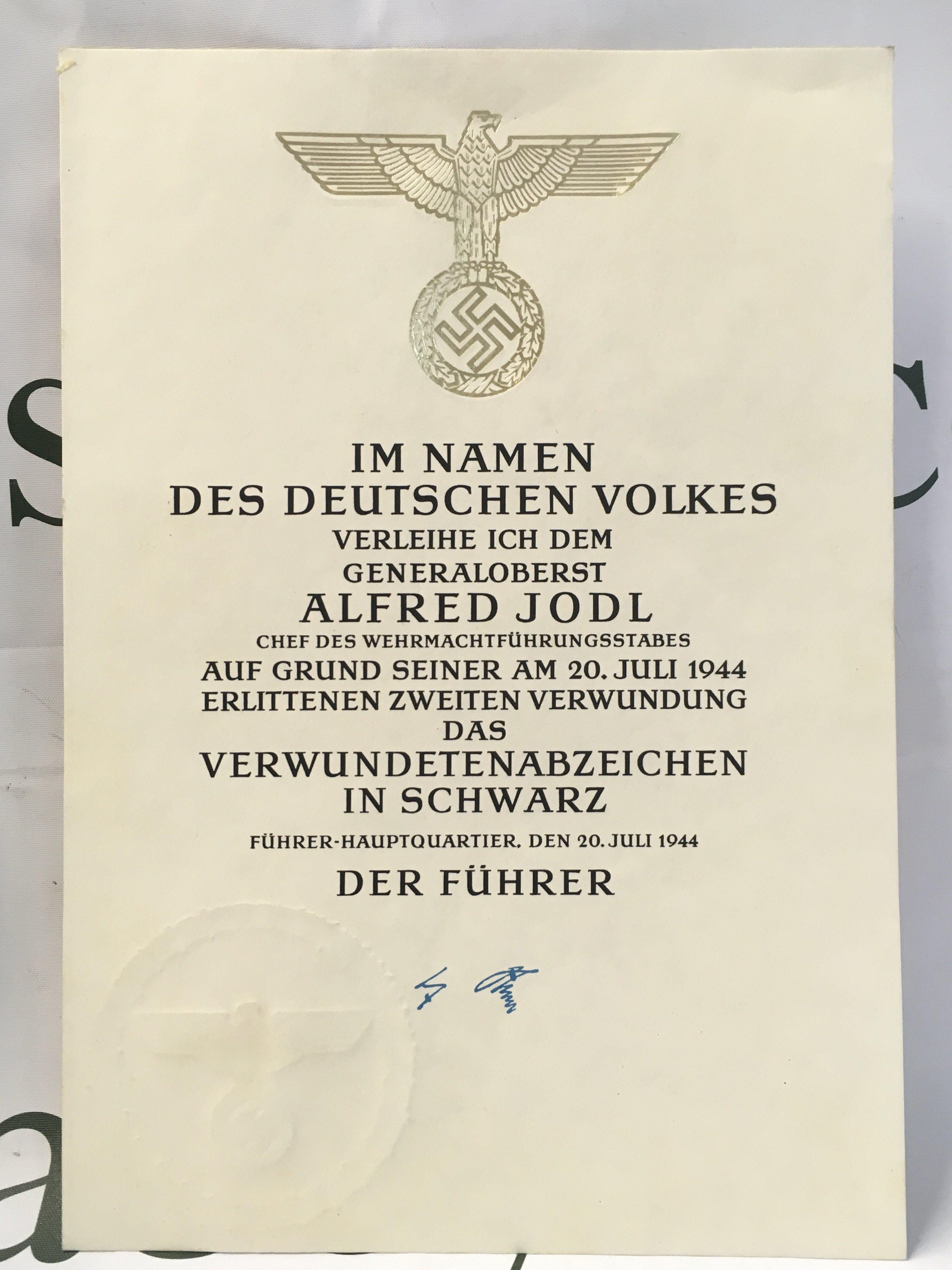 A WW2 Third Reich Rare 20th July 1944 Wound Badge , silver issue. The reverse stamped (800 2) with rare certificate awarded to Alfred Jodi for the Award of the medal . Postage category A