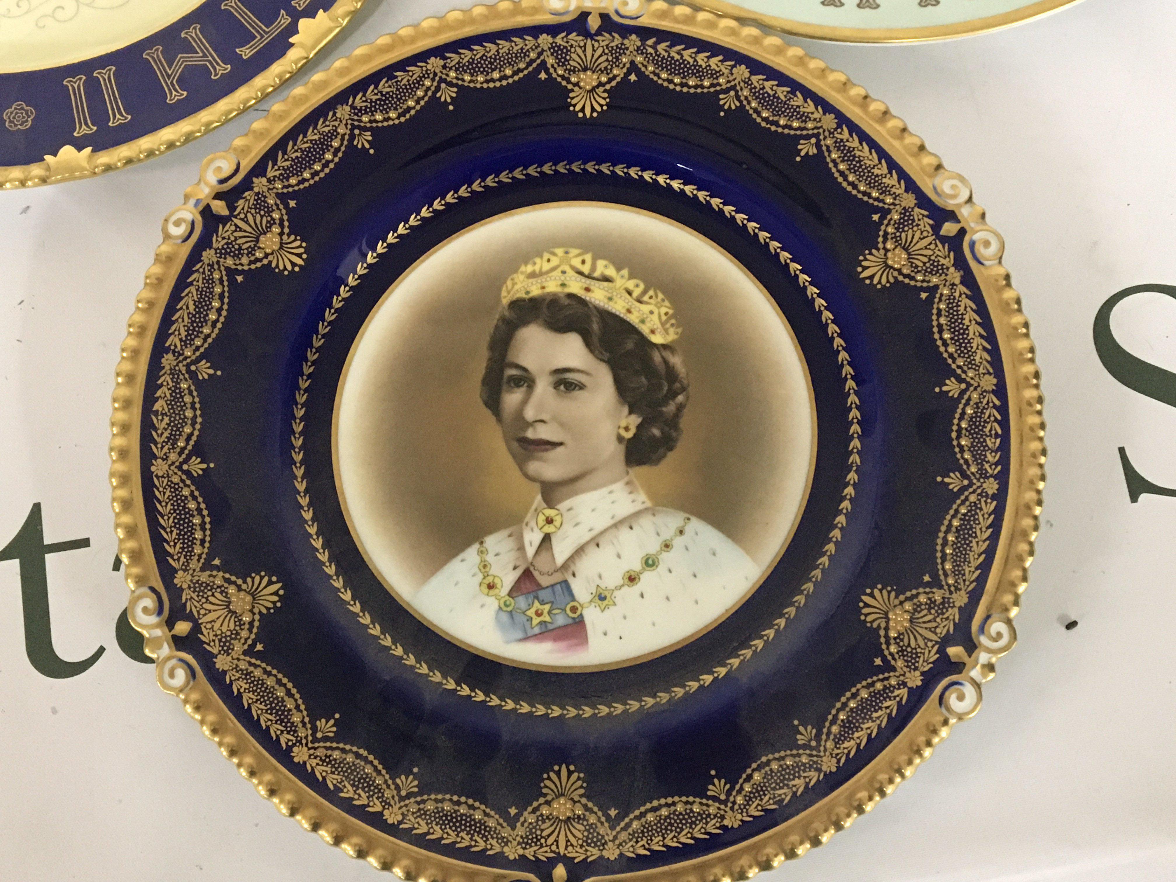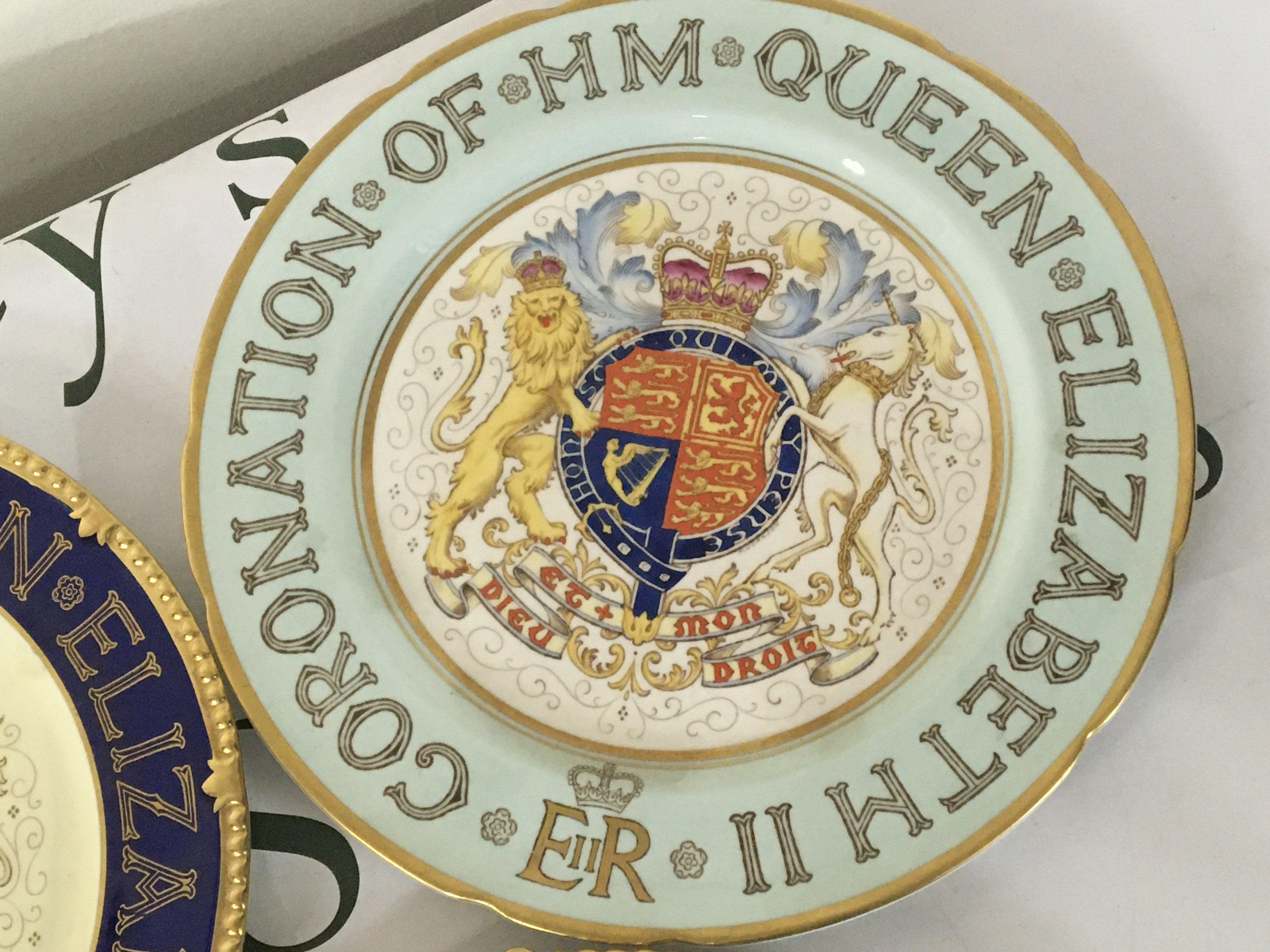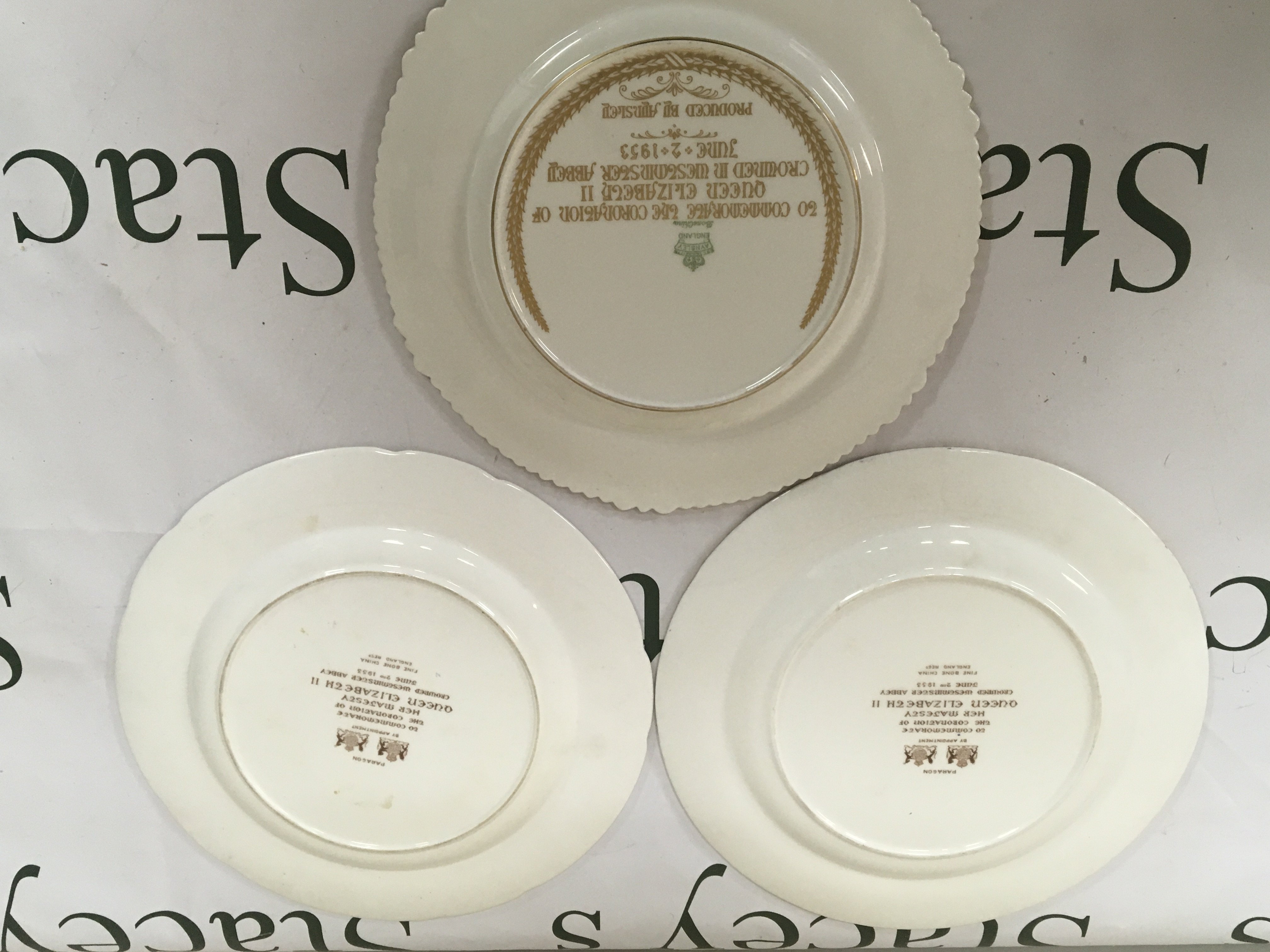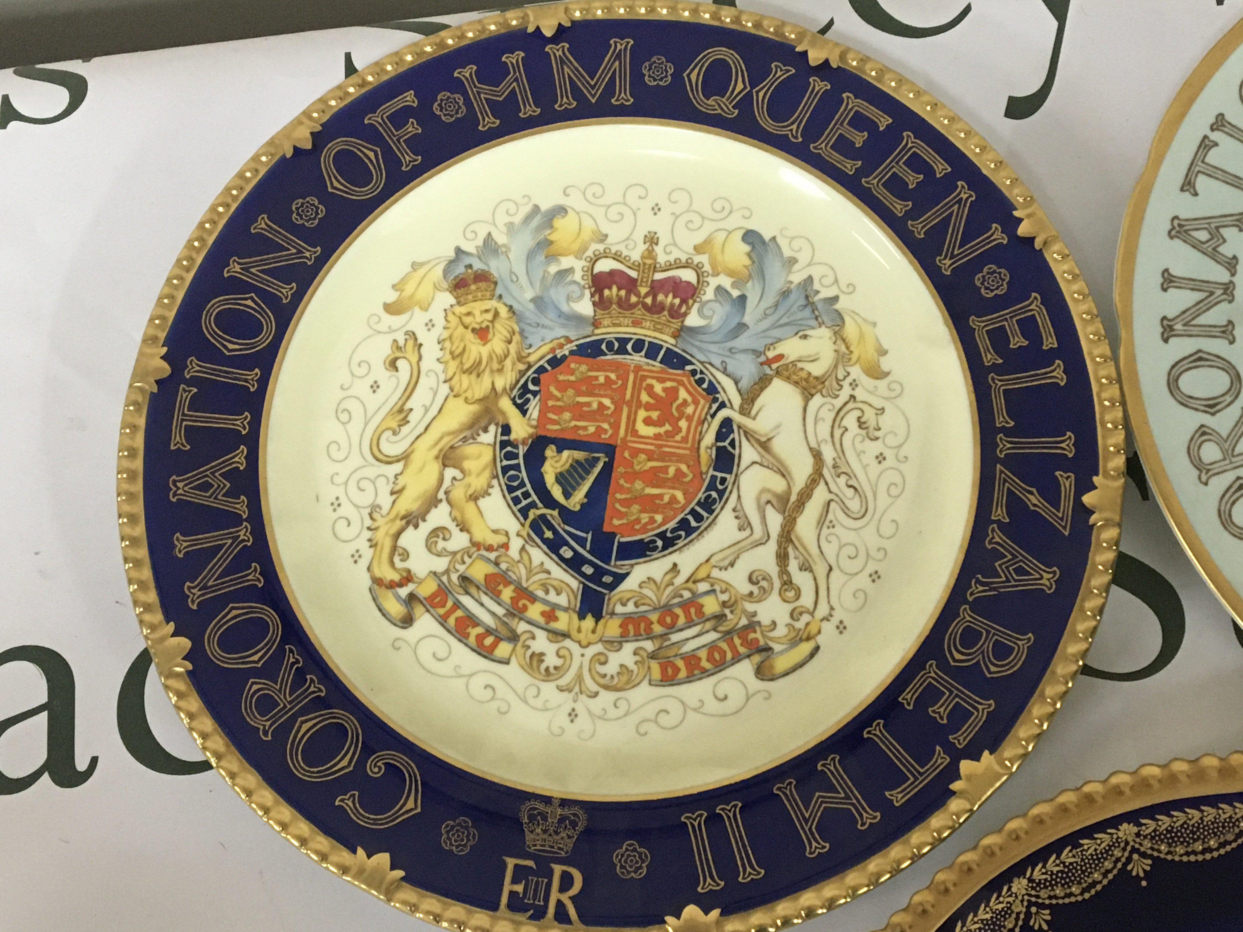 Three quality fine bone china Paagon and Aynsley porcelain plates. The 1953 Coronation of Elizabeth II two with Royal coat of arms and a portrait of the queen all with applied gilt decoration commemorative text in gilt to the reverse no obvious damage. NO RESERVE.