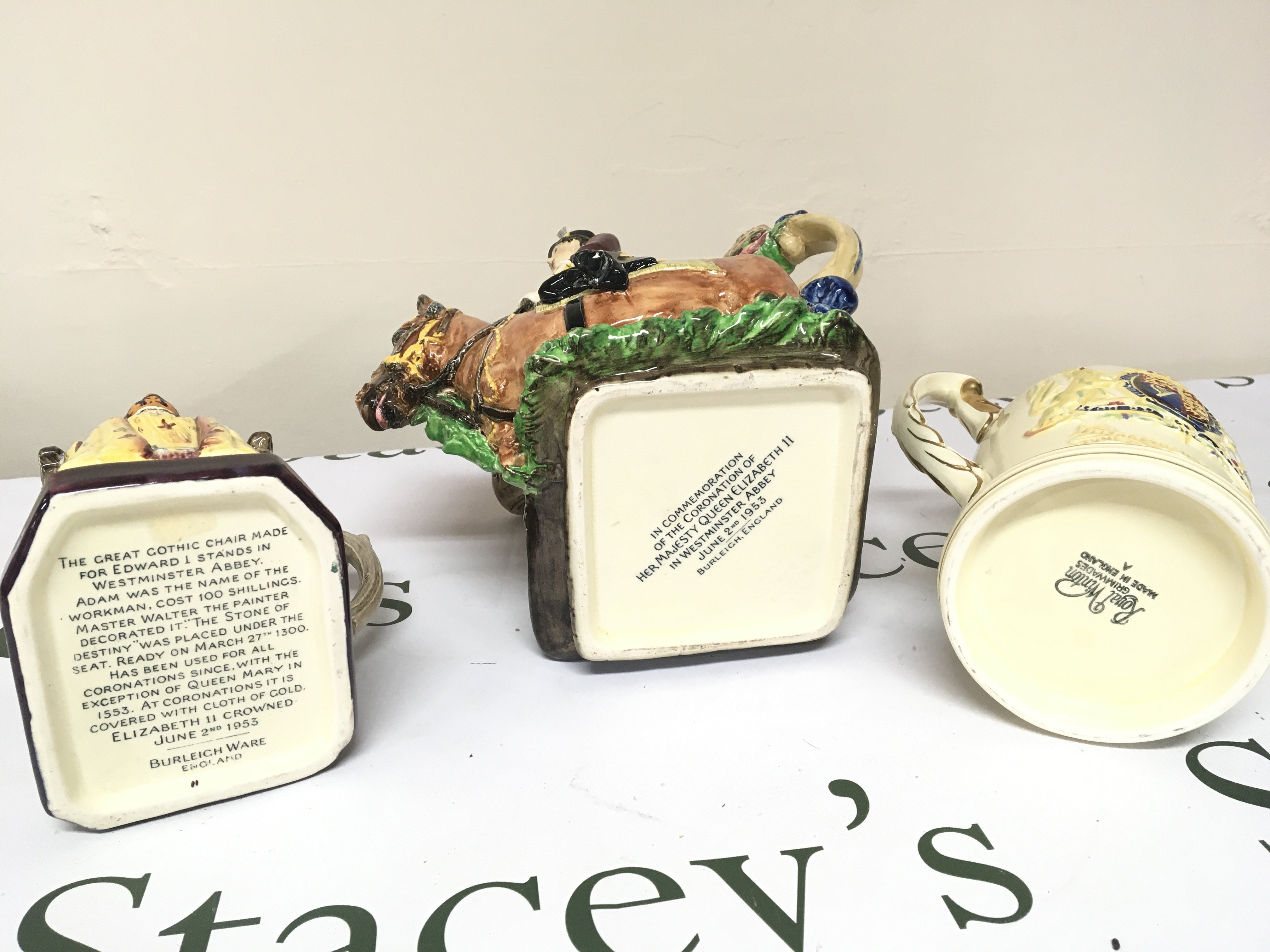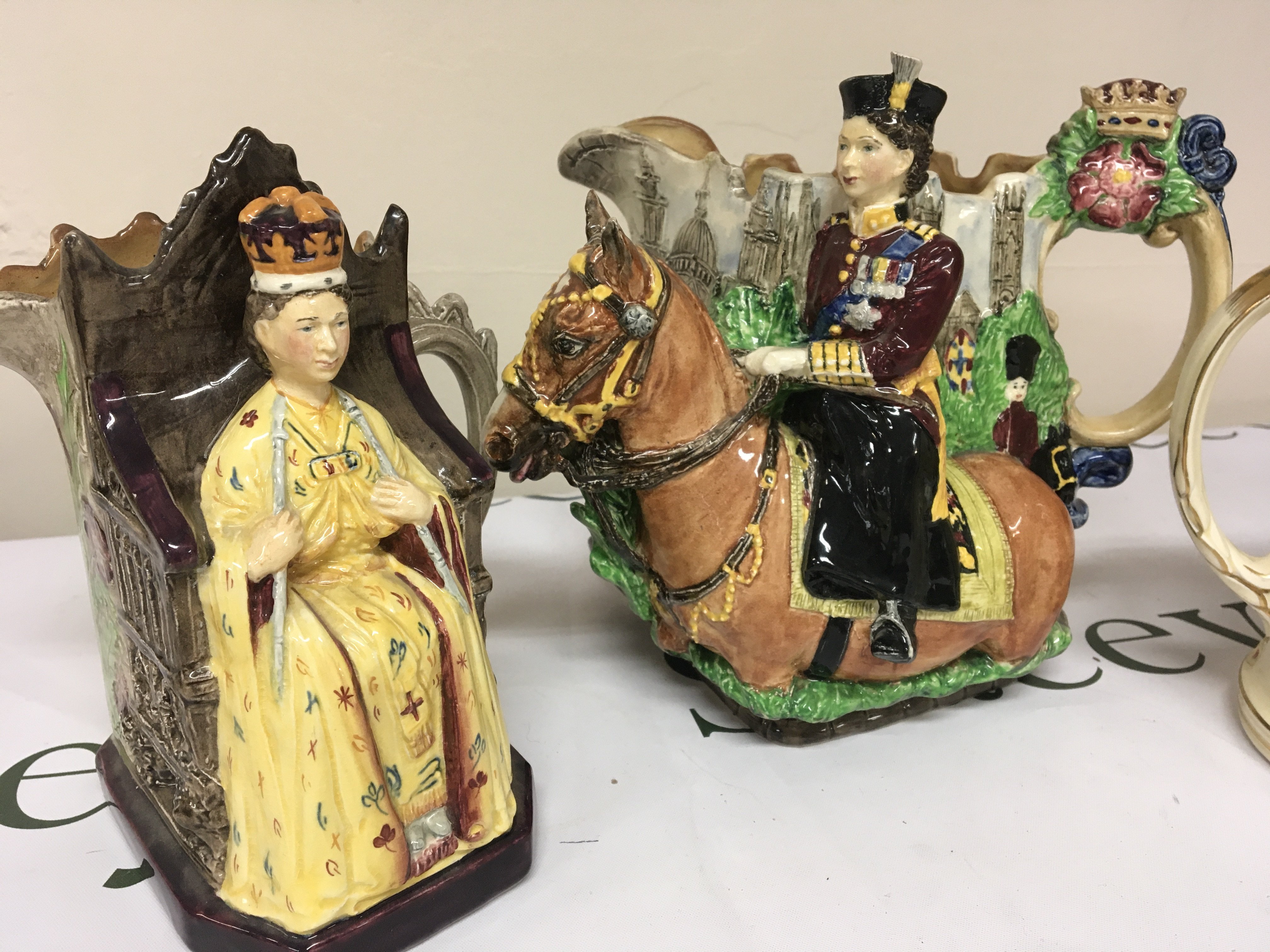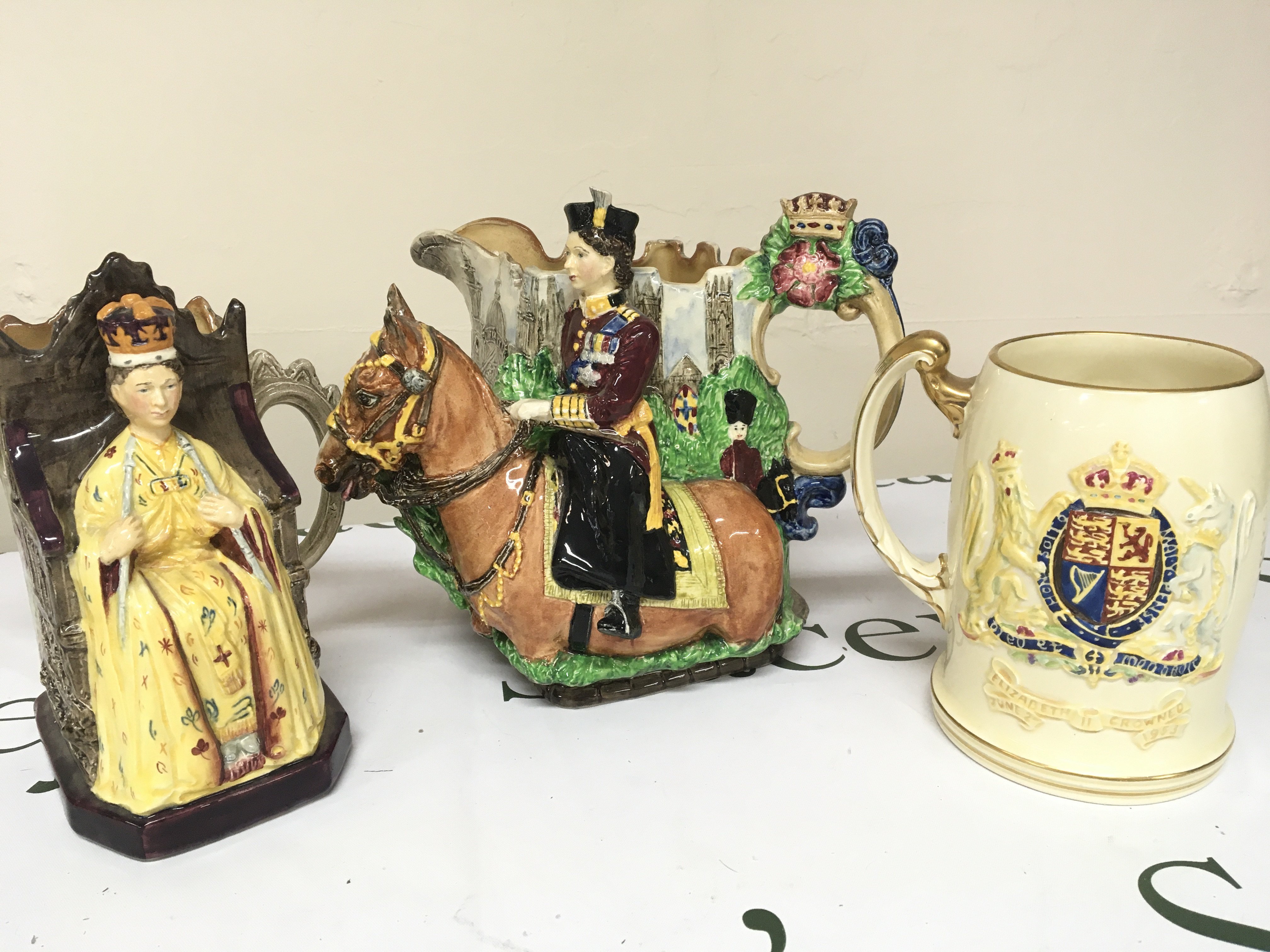 Two rare Burleigh Ware Elizabeth II commemorative jugs with raised profiles of Elizabeth II and a Royal Winton mug no obvious damage NO Reserve (3)