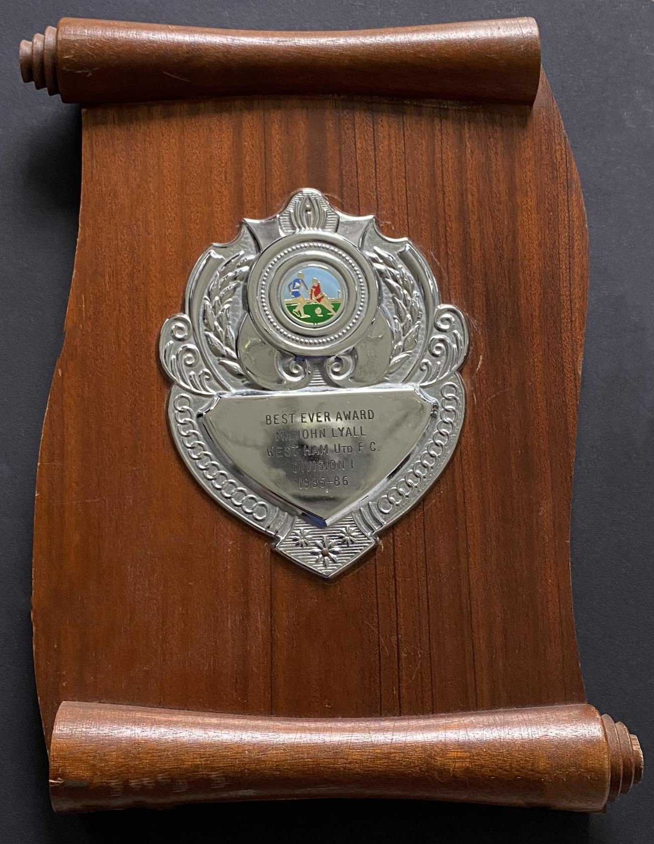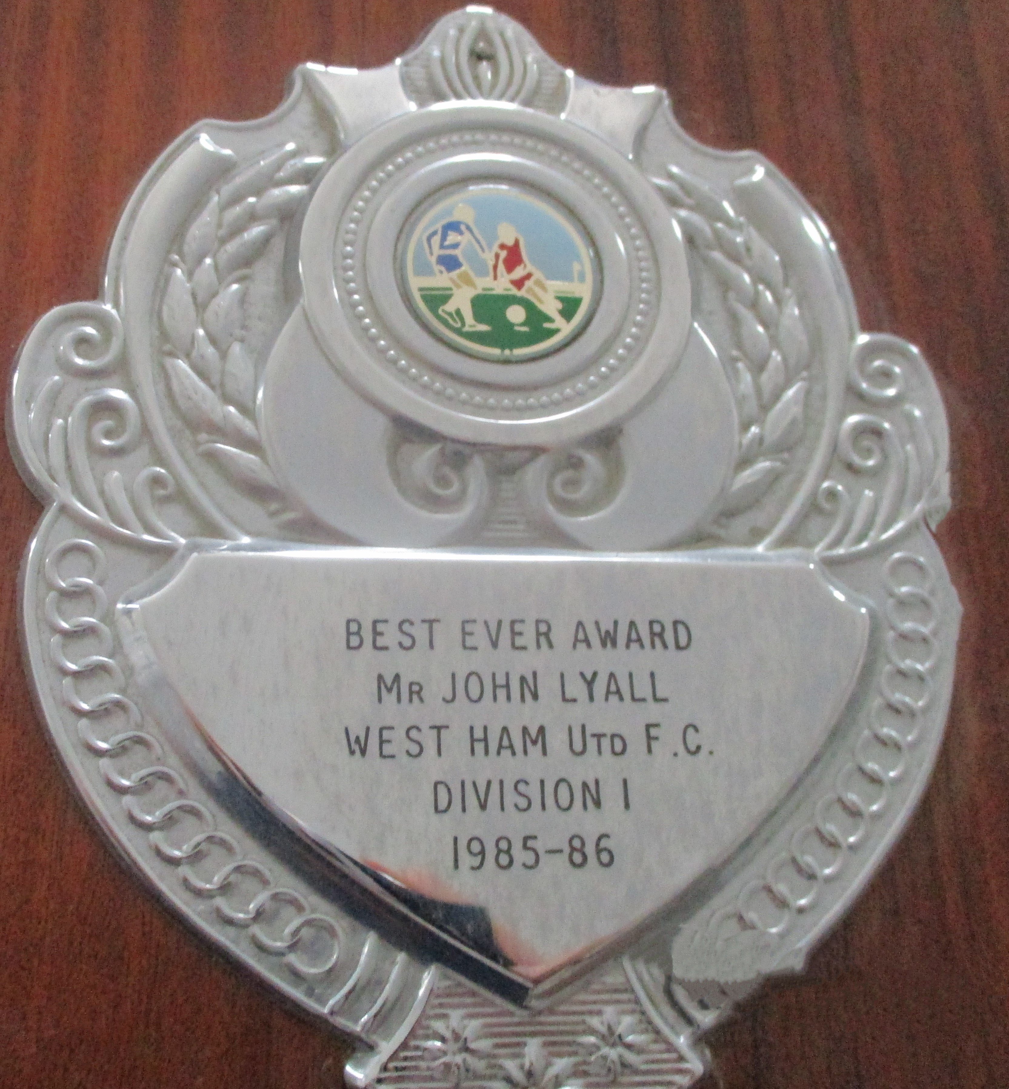 John Lyalls West Ham 85/86 Best Ever Award From Directors: This season West Ham achieved their best ever 3rd place and won 26 of their 42 matches with 84 points. The board who had fought hard to keep Lyall after interest from Ipswich.