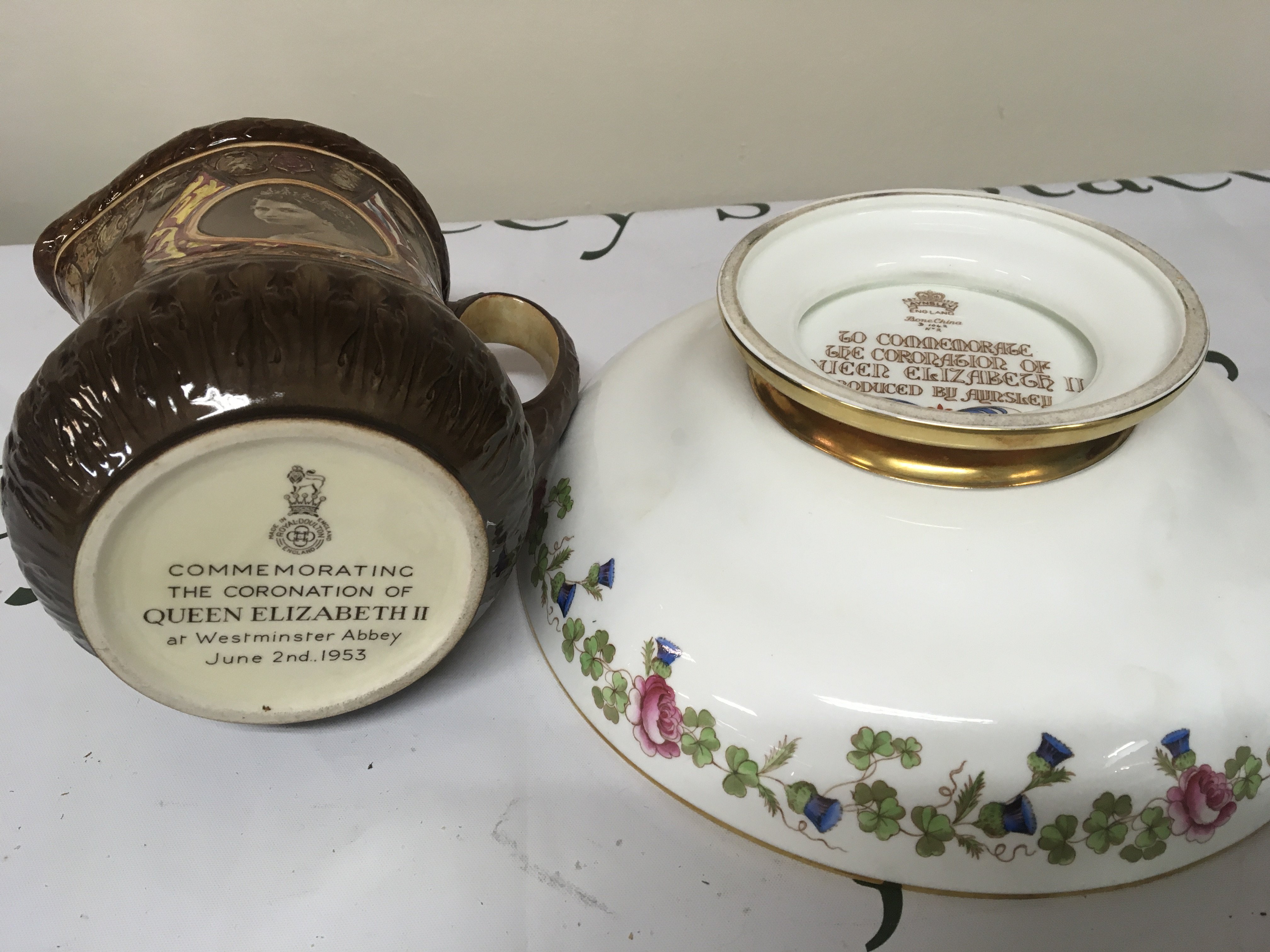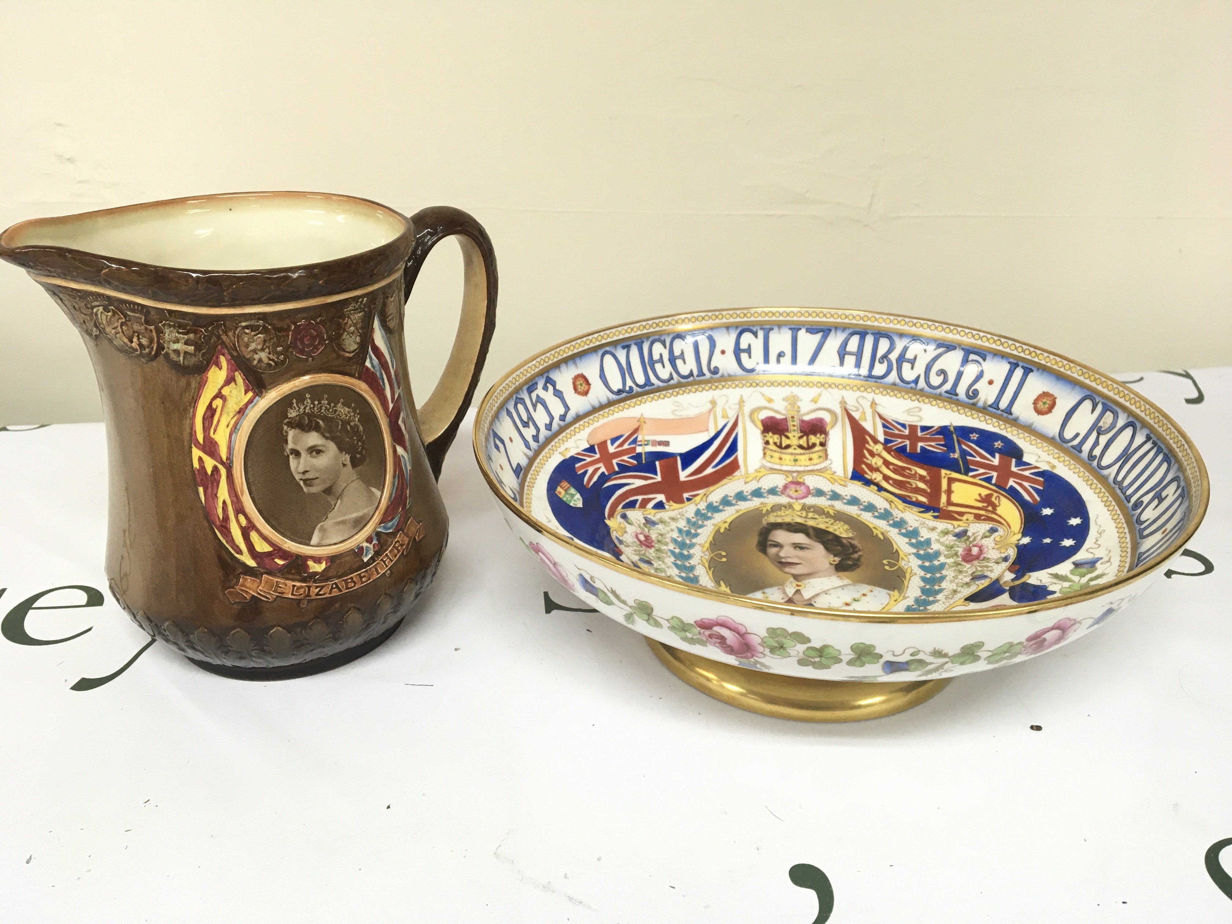 A Royal Doulton Commemorative Queen Elizabeth II 1953 jug and an Aynsley bone china bowl with elaborate decoration. no obvious damage NO RESERVE.