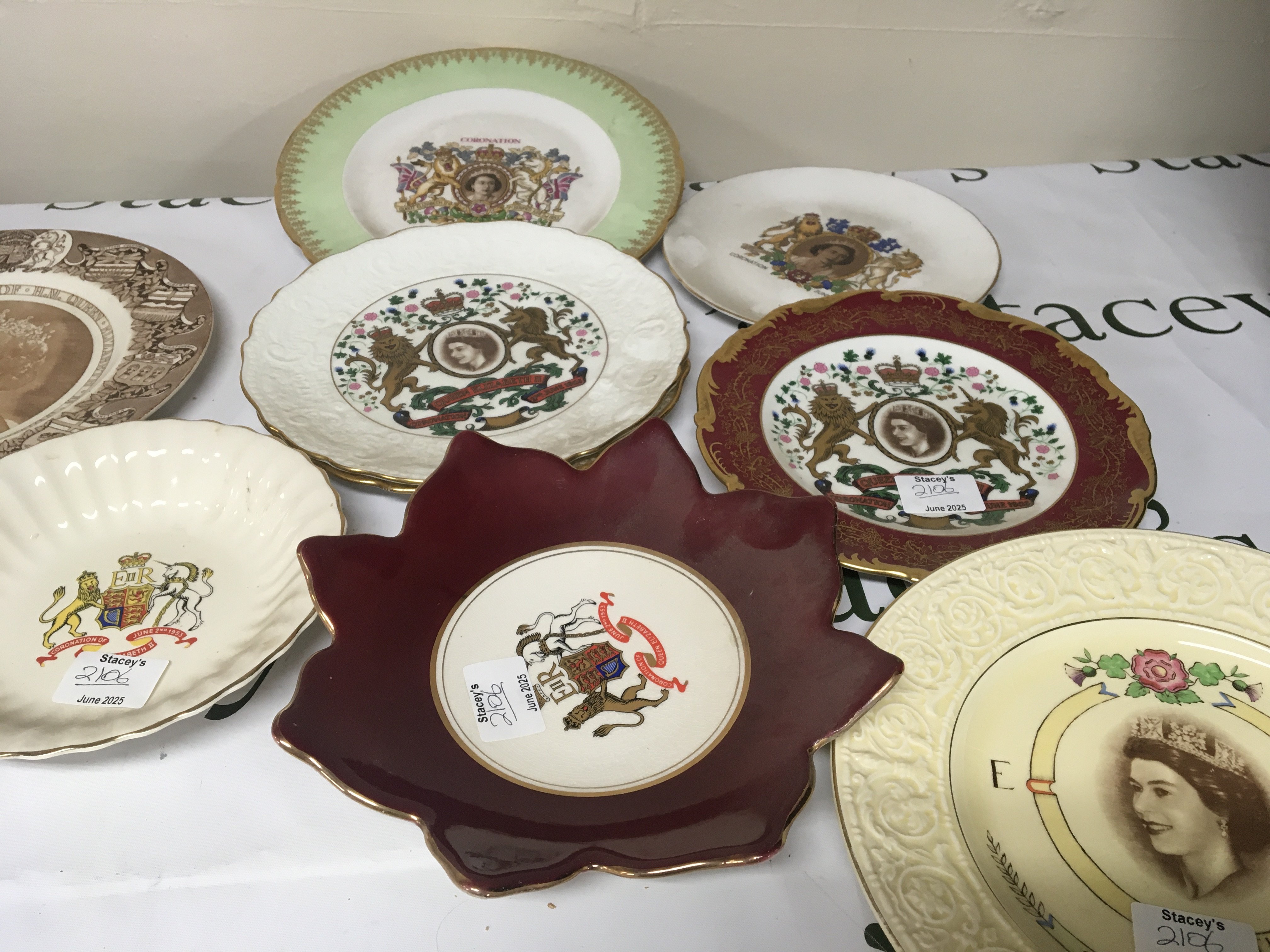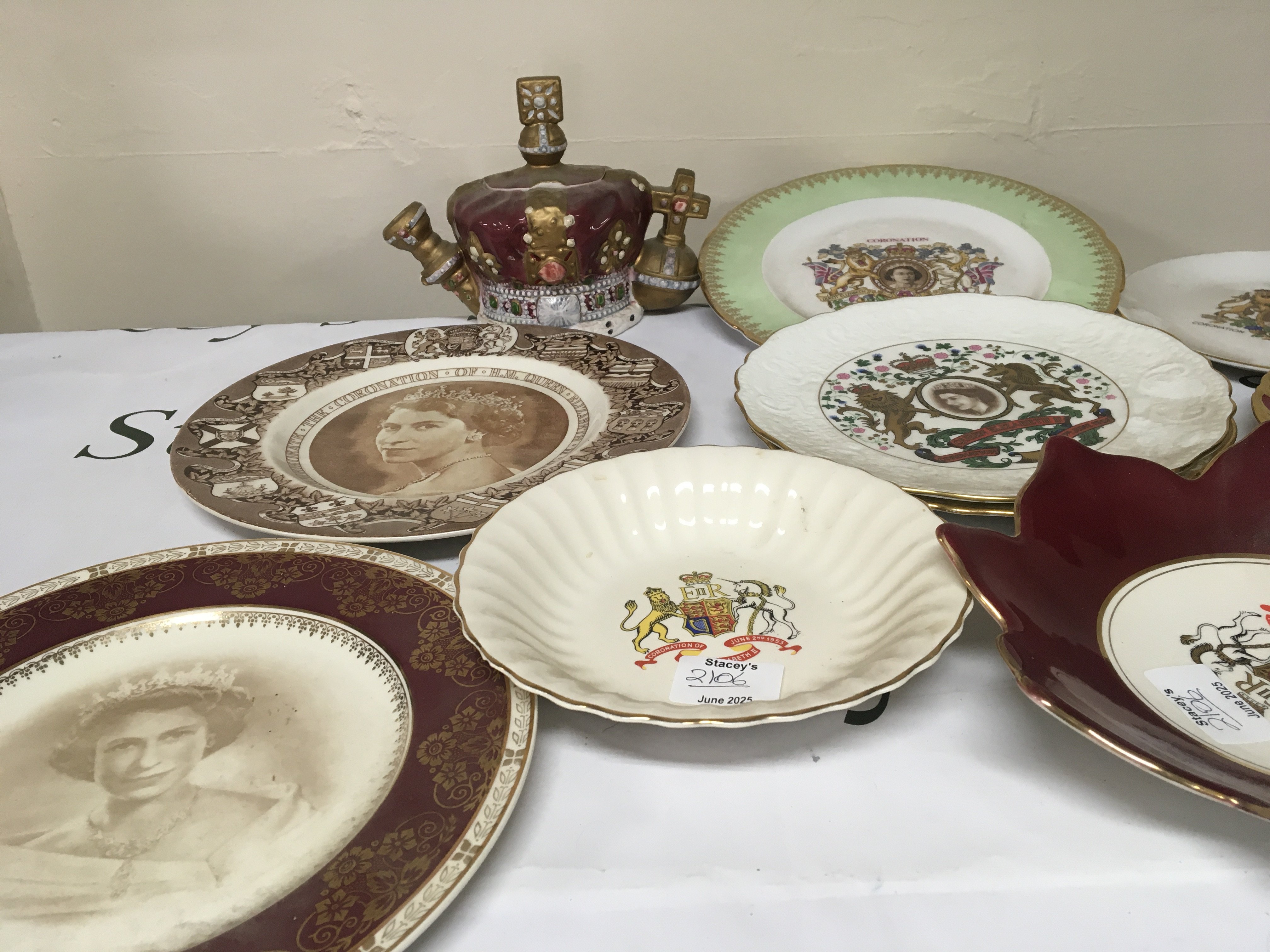 A collection of Royal commemorative Elizabeth II coronation plates and a crown tea pot. NO RESERVE.
