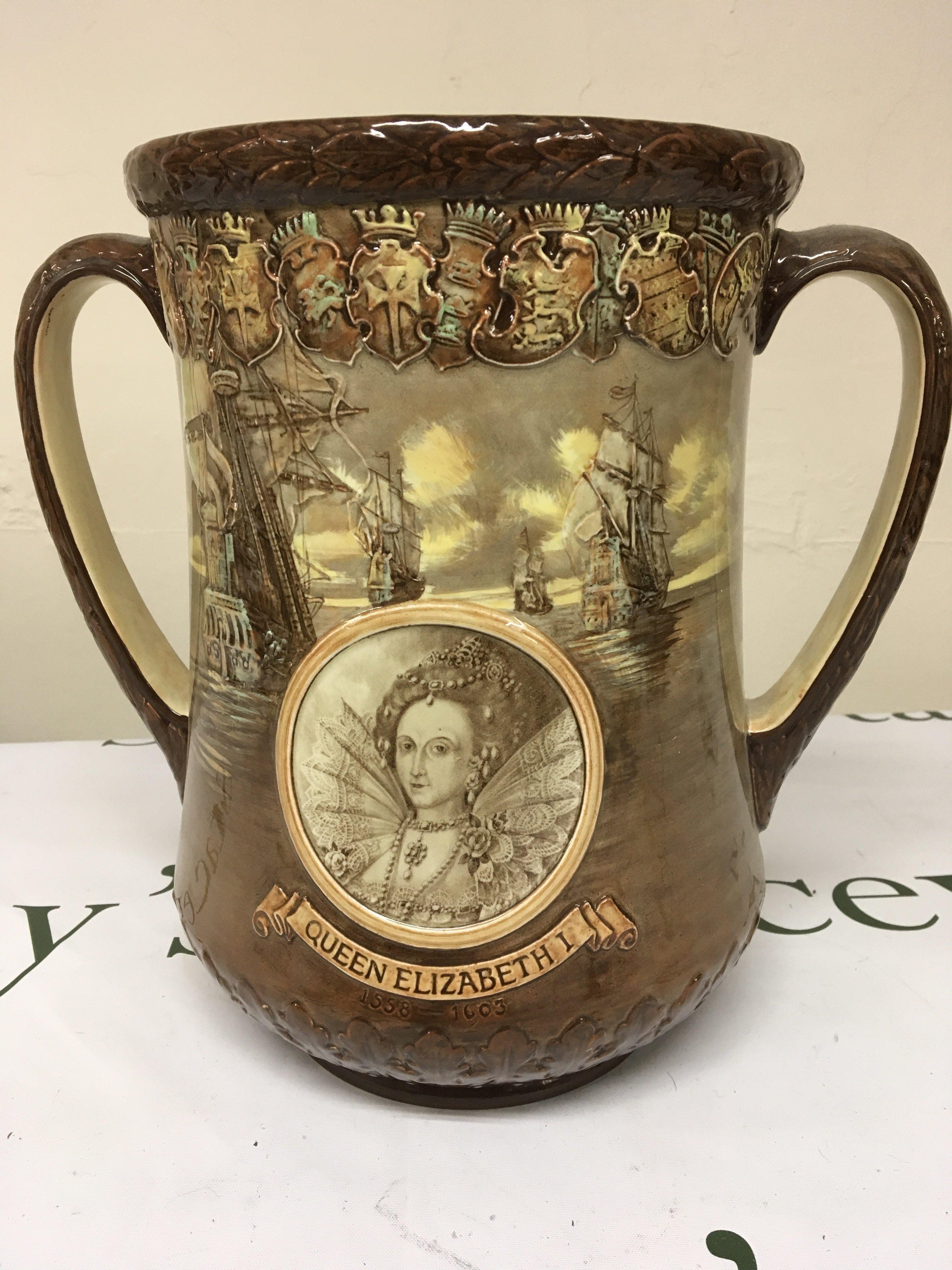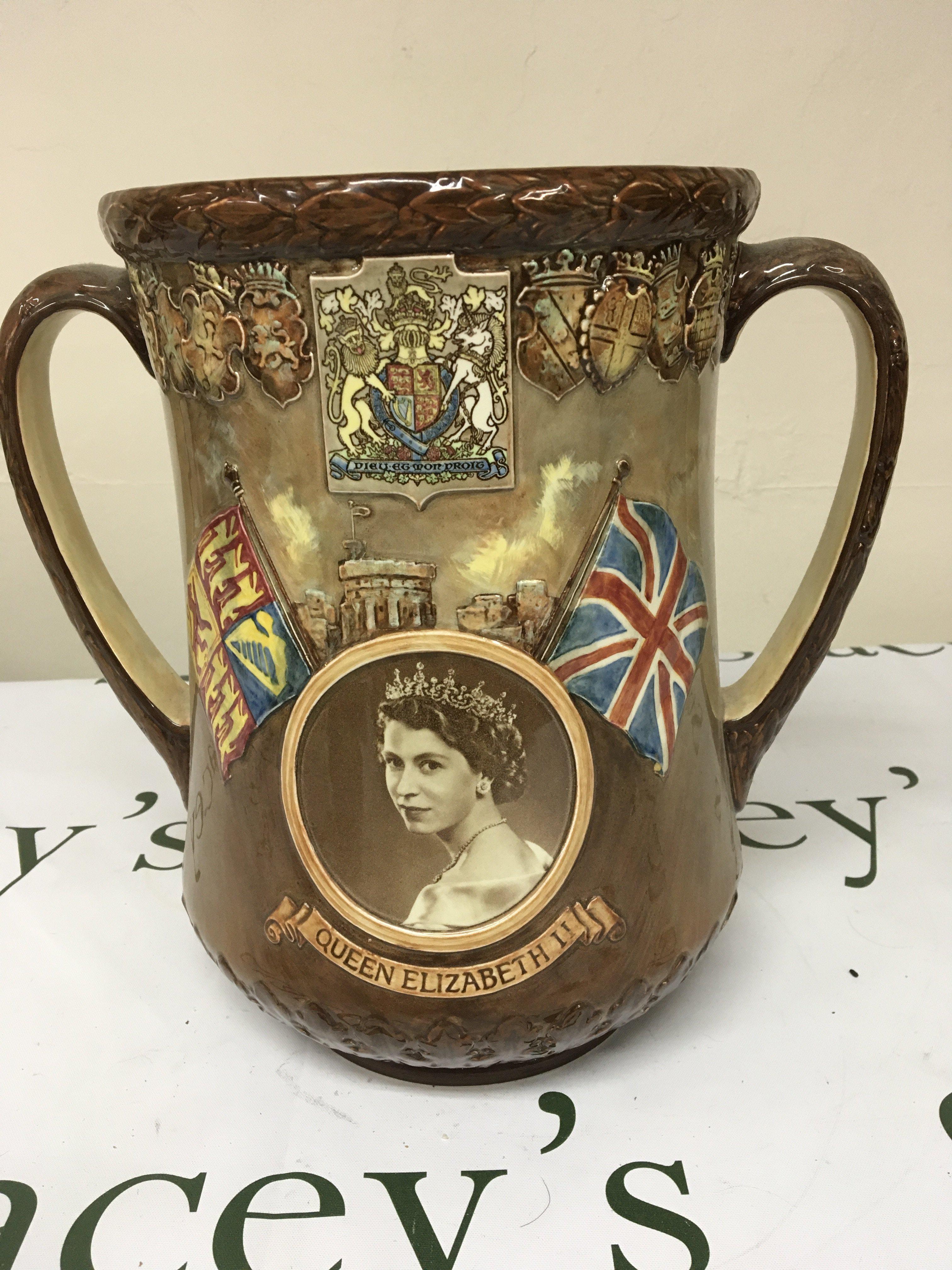 A limited edition large size Royal Doulton commemorative loving cup The coronation of Elizabeth II with a portrait of the queen and Windsor Castle and the reverse with Elizabeth I. Limited edition number 375/100 height 27cm no obvious damage or restoration. NO RESERVE.