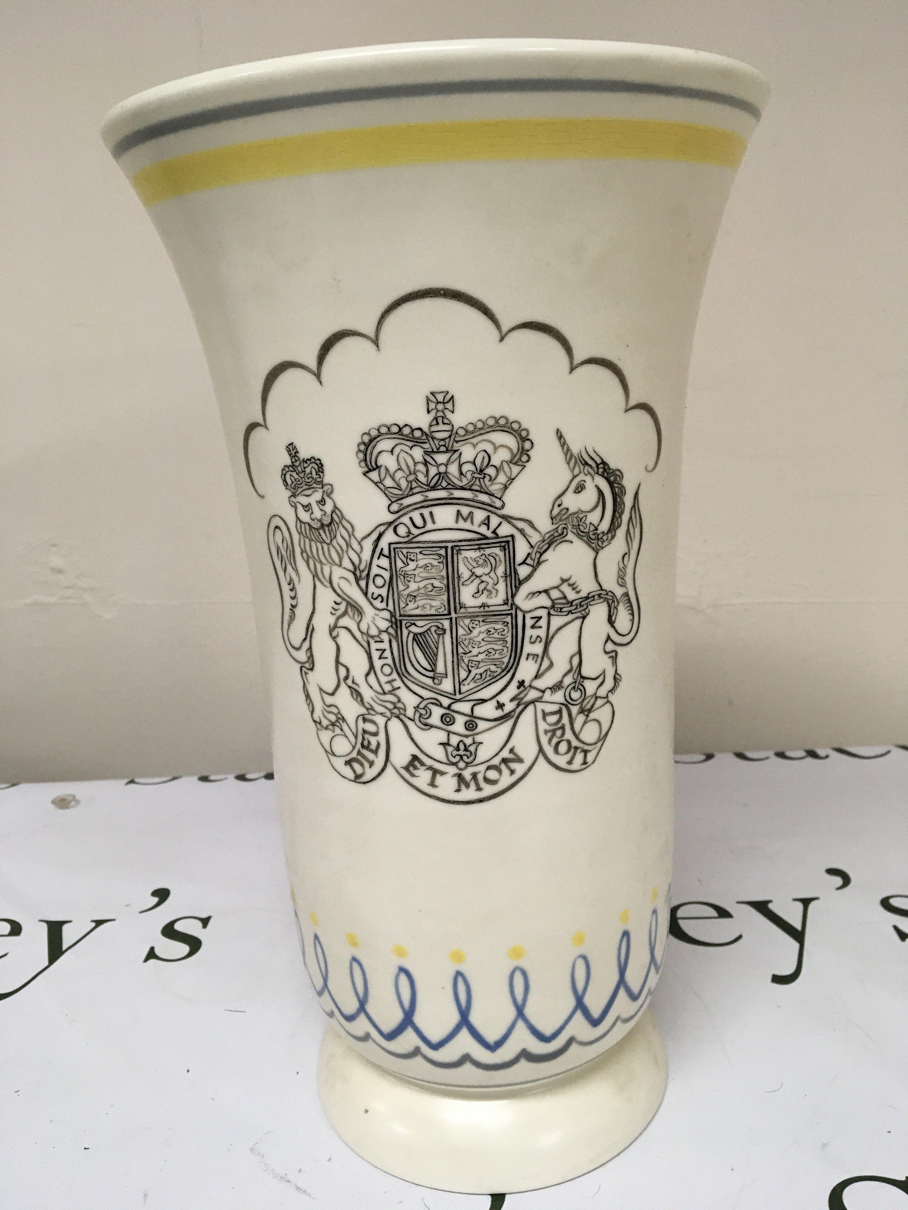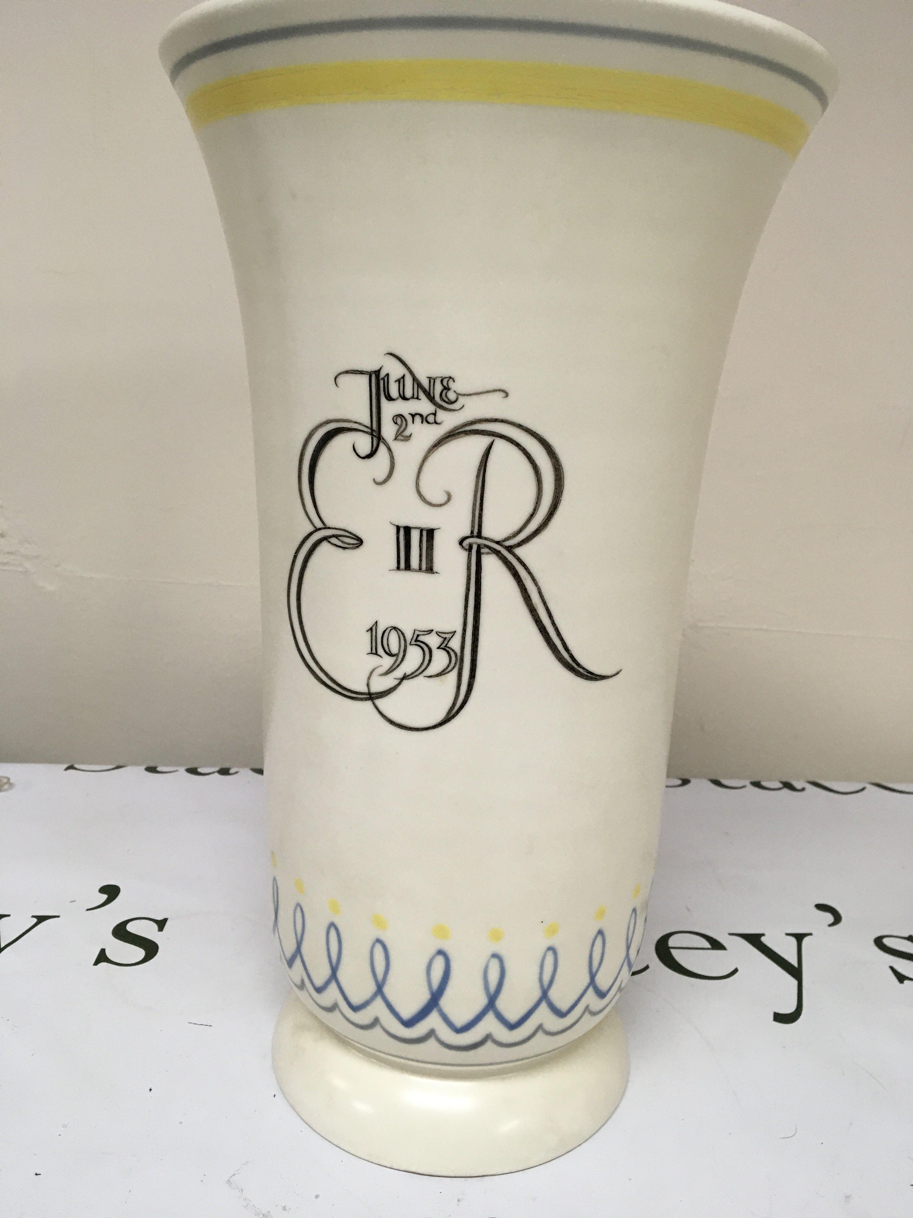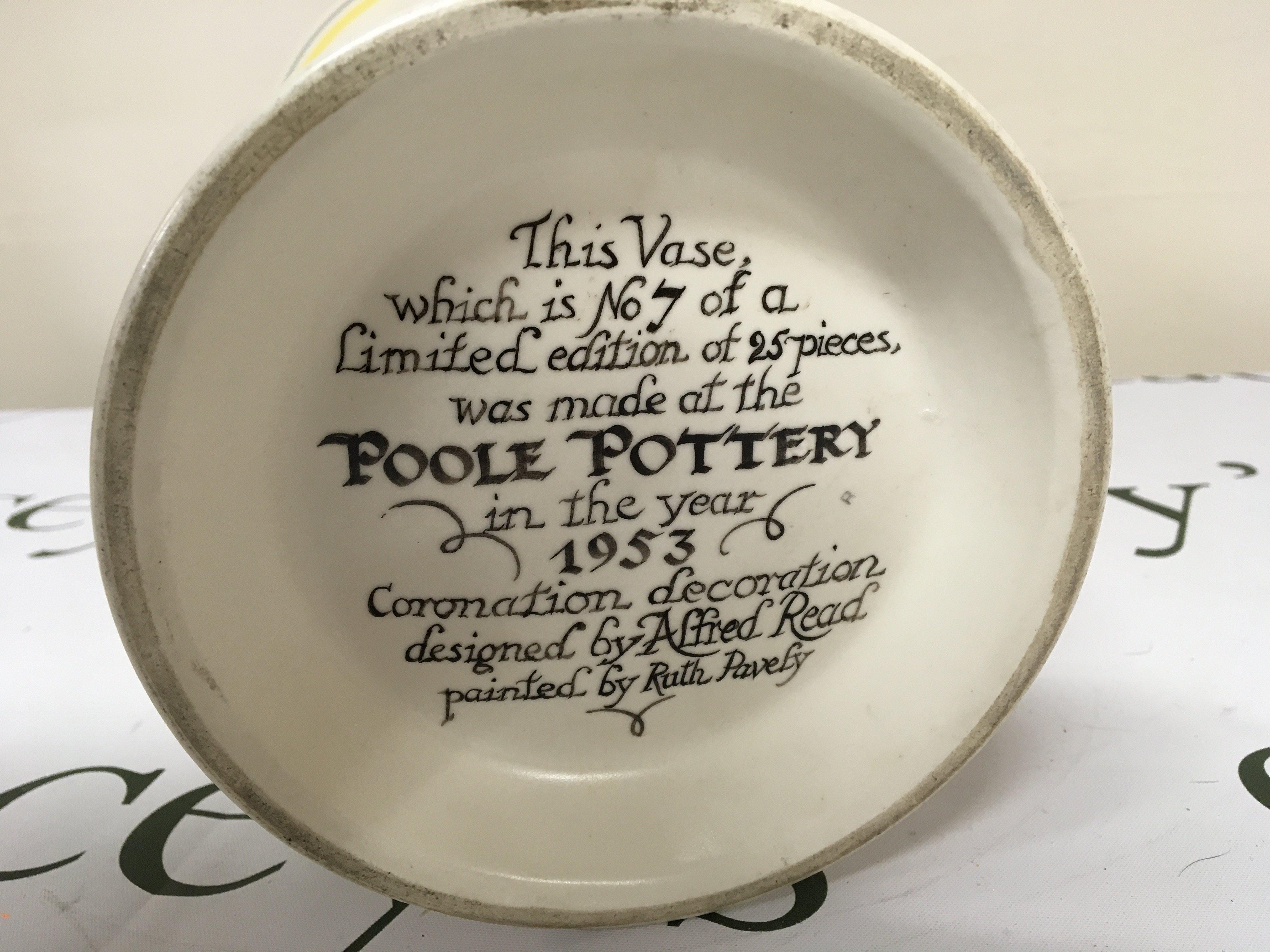 A limited Edition Poole pottery vase made to commemorate the coronation of Elizabeth II 1953 a limited number of just 25. 7/25. The large vase design by Alfred Read and painted by Ruth Pavely. Height 36cm no obvious damage.