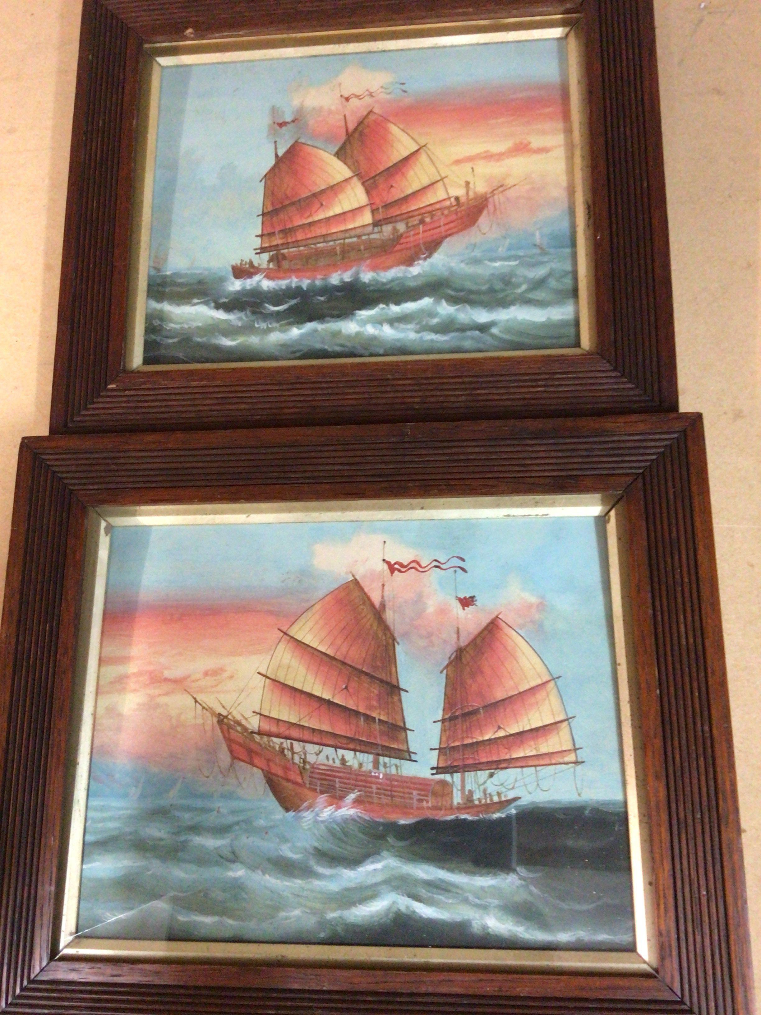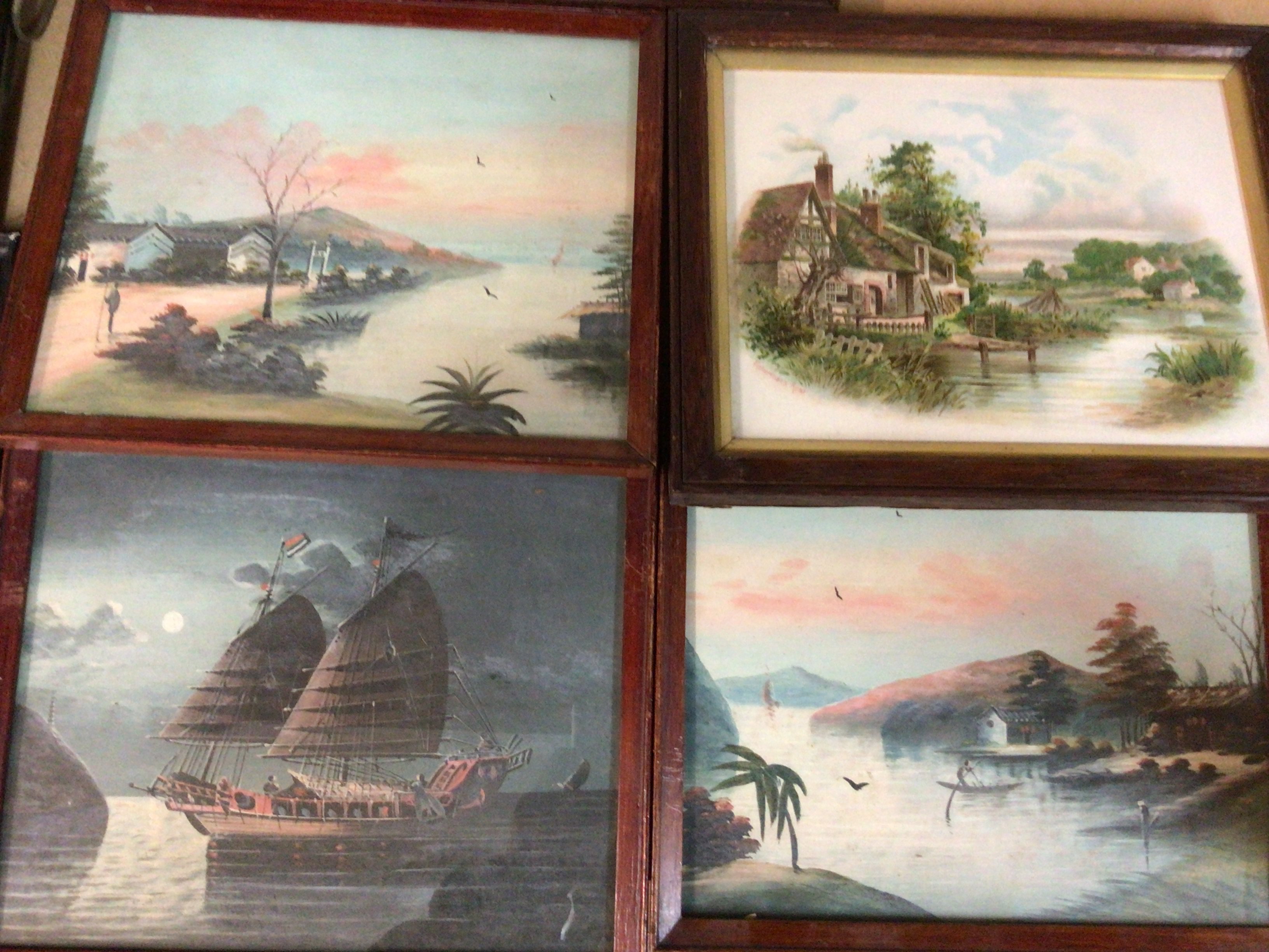 A collection of various oriental style Gouache pictures including sea views. Various size frames including 32 x 31 cm and 33cm x 40cm