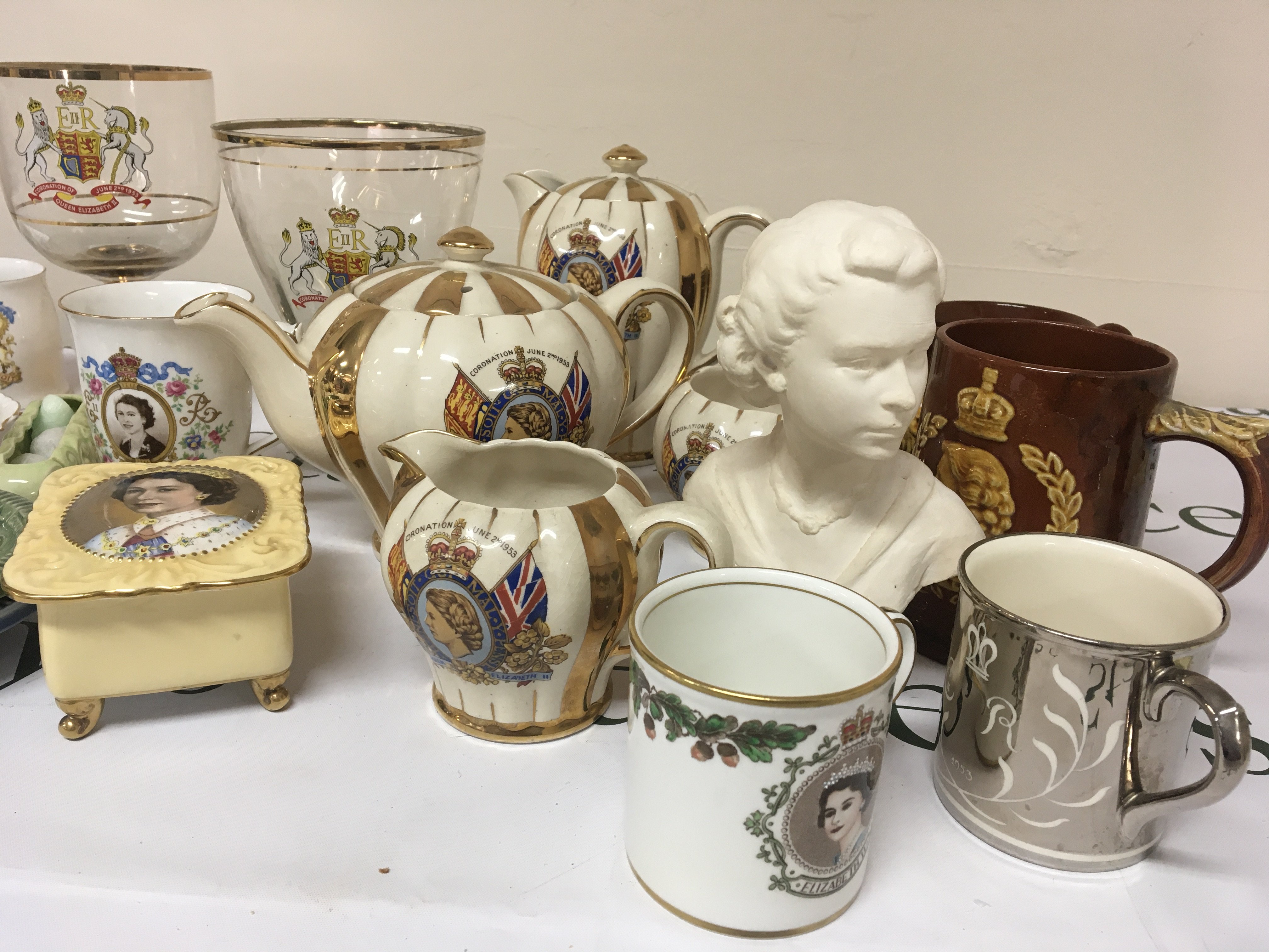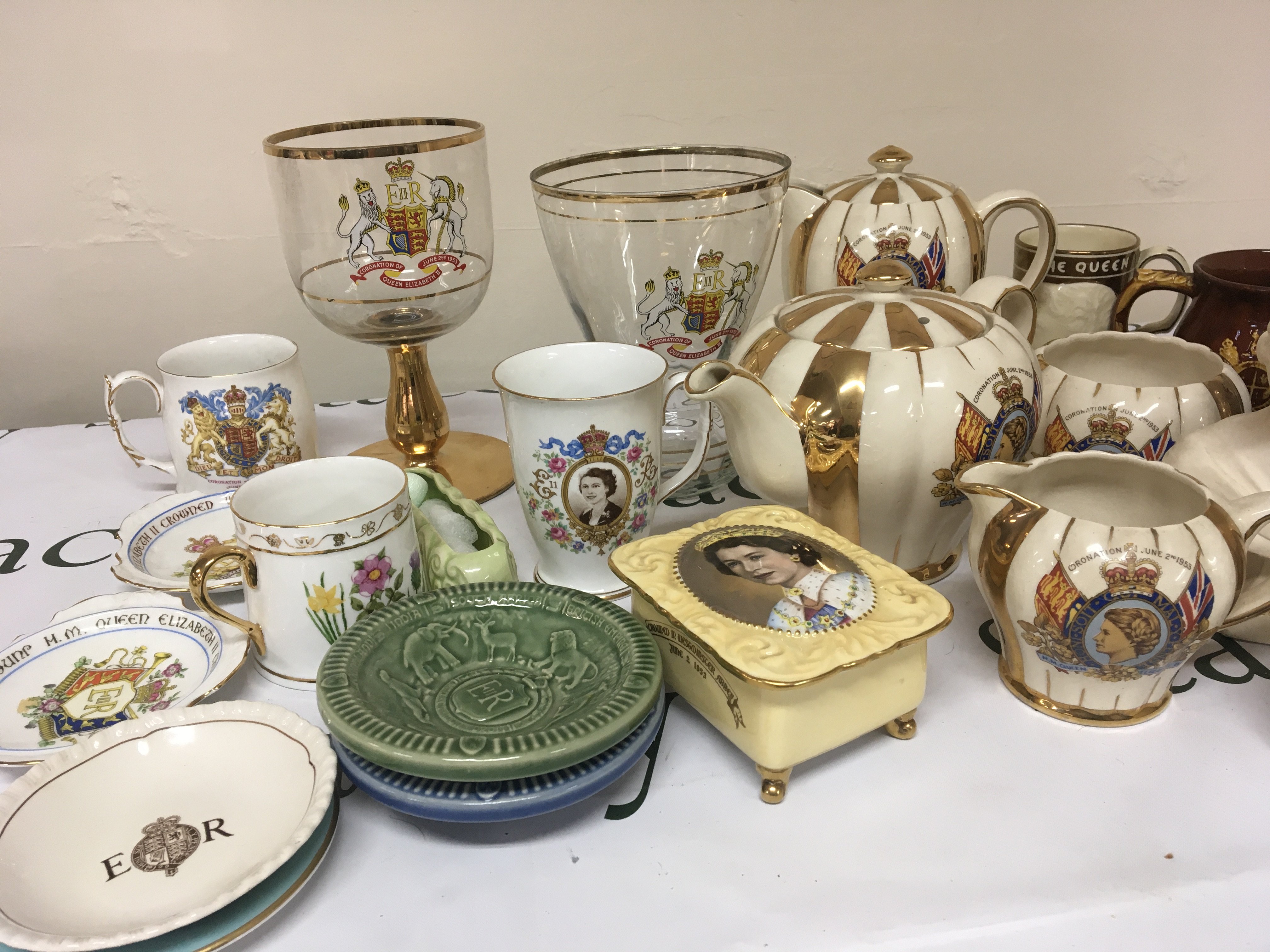 A collection of Elizabeth II Royal Commemorative ceramics including a tea set gilded glass Royal Albert and other conforming ceramics. NO Reserve.