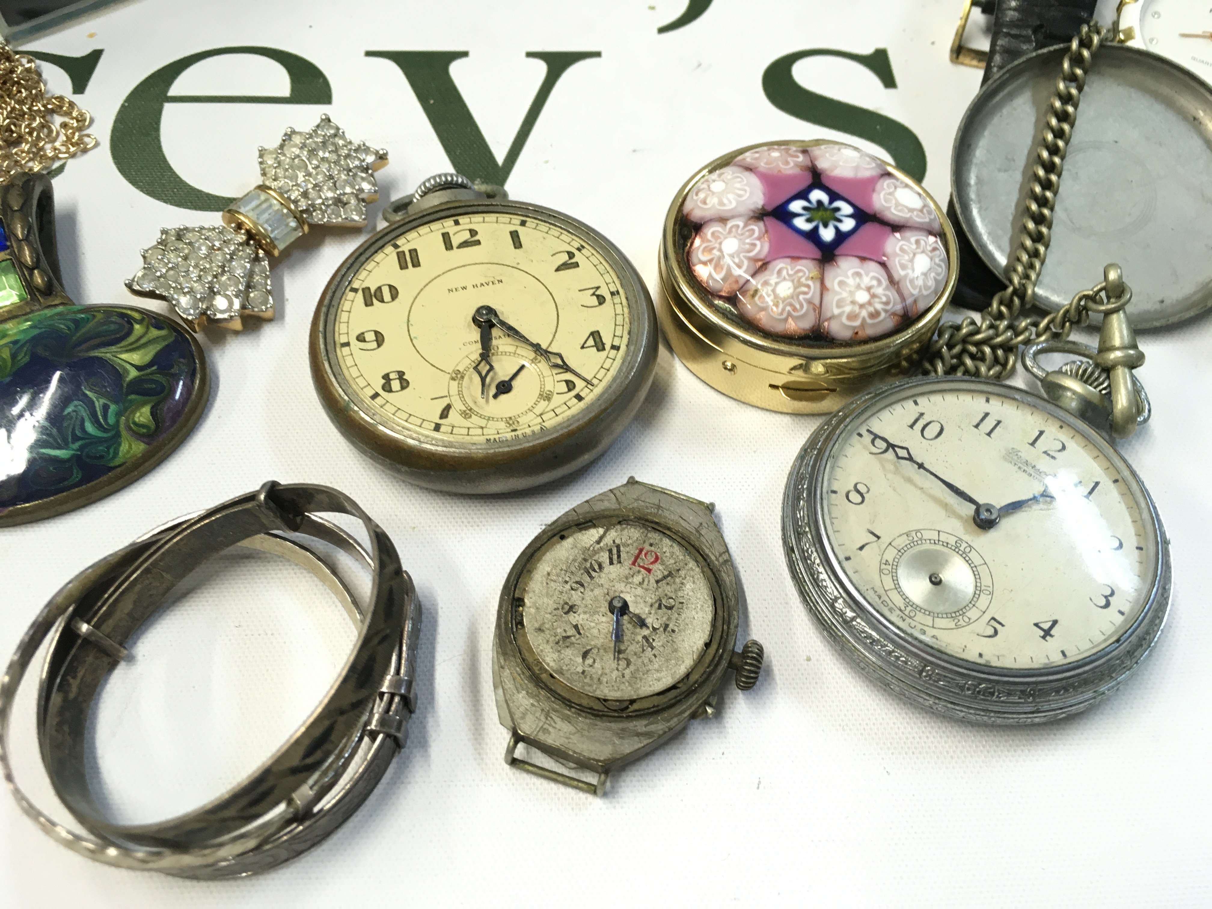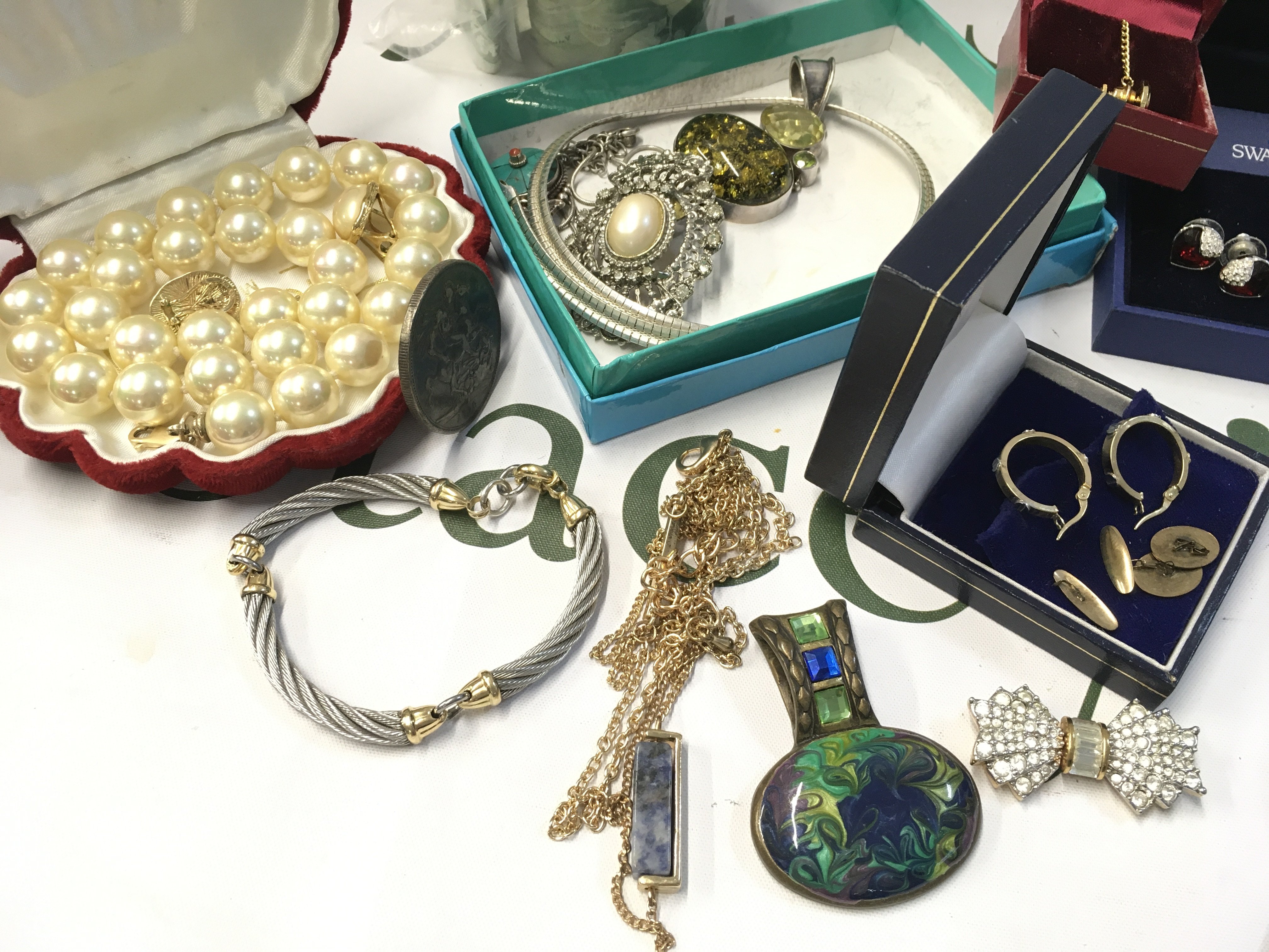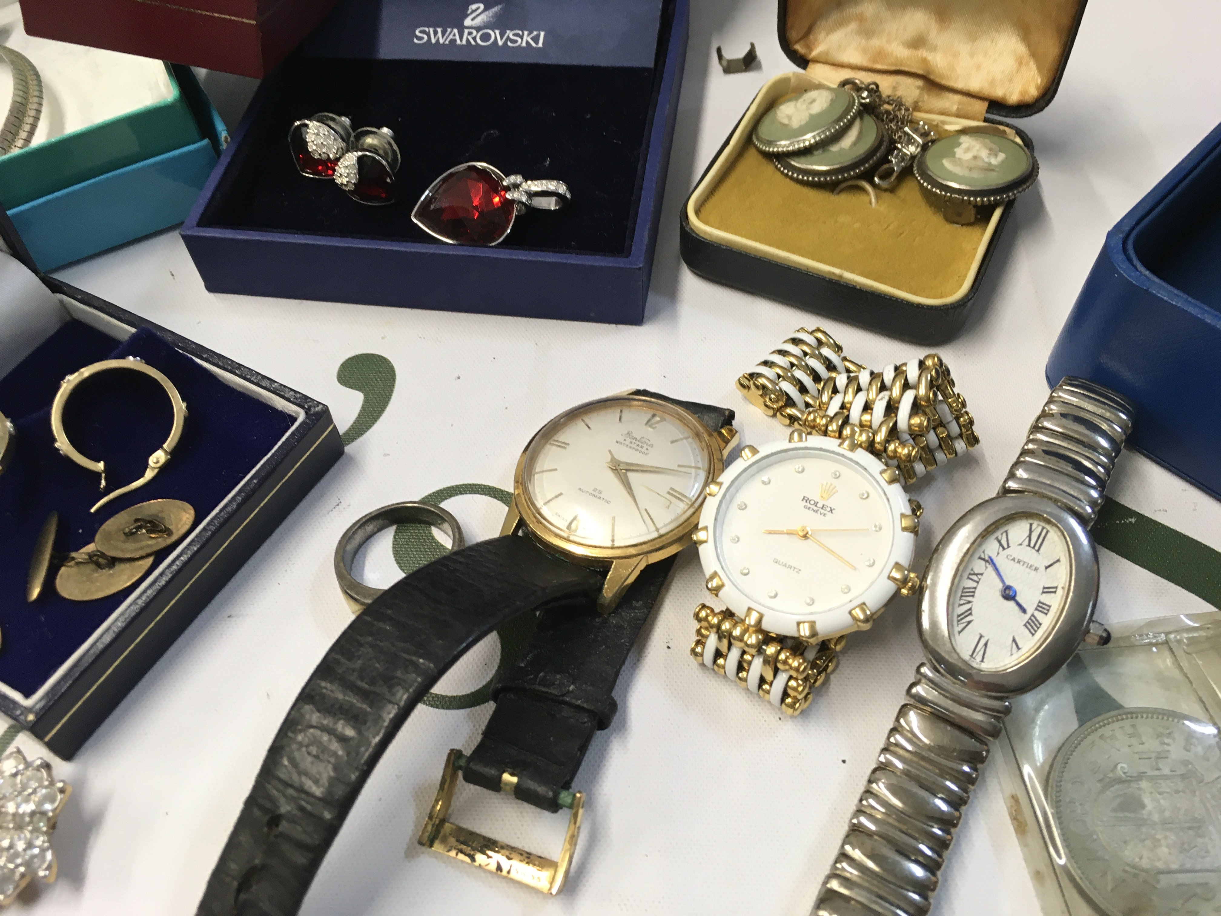 Jewellery including watches, necklaces, brooches, One pound notes, 9ct gold cufflinks and earrings etc