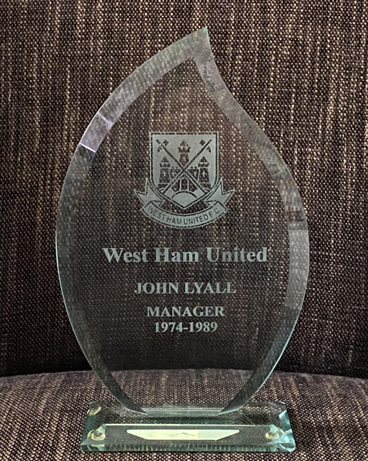 John Lyall West Ham Manager 1974 - 1989 Football Award: Quality glass plaque with old West Ham crest above the words West Ham United John Lyall Manager 1974 - 1989. Issuer unknown.