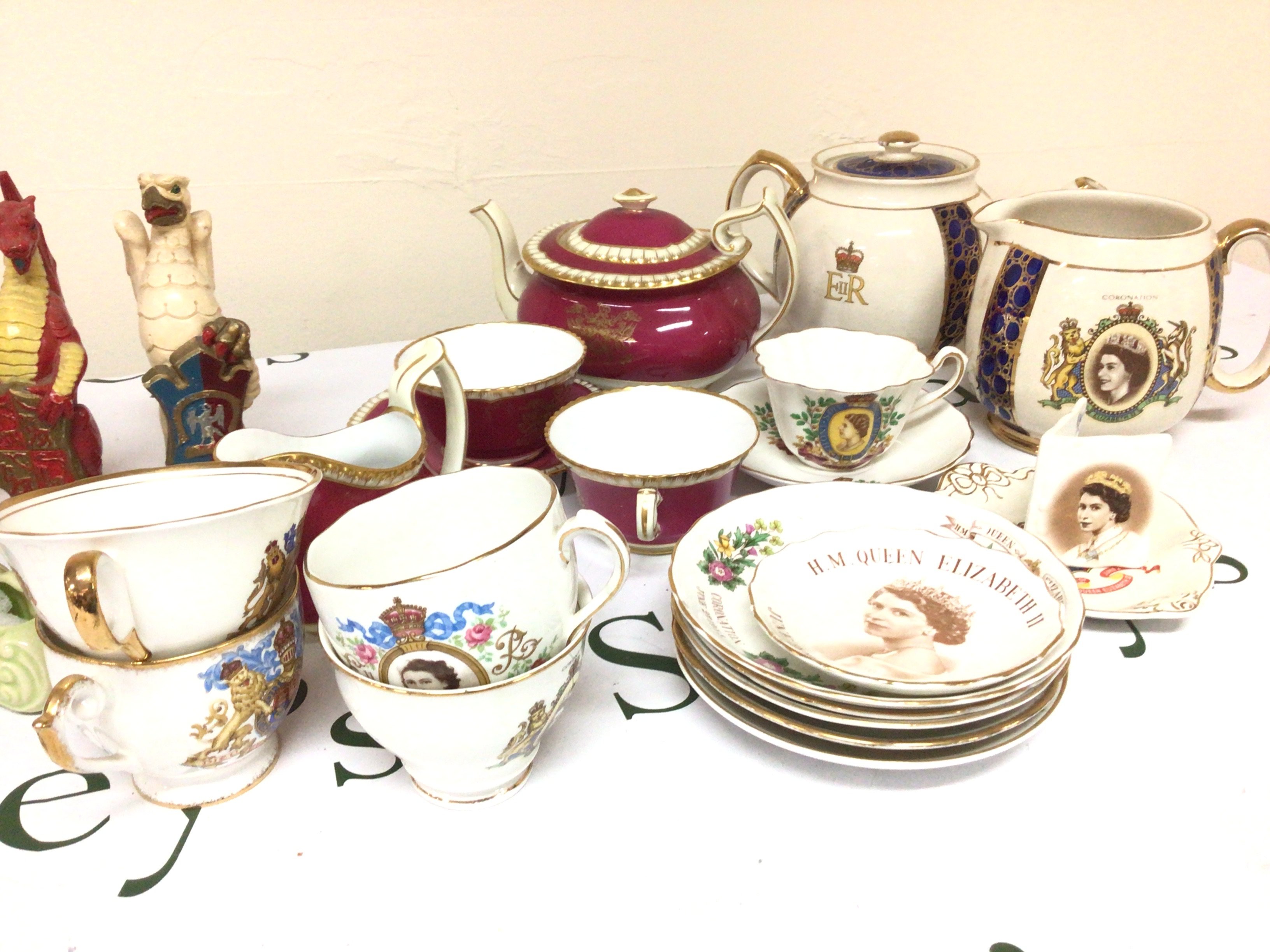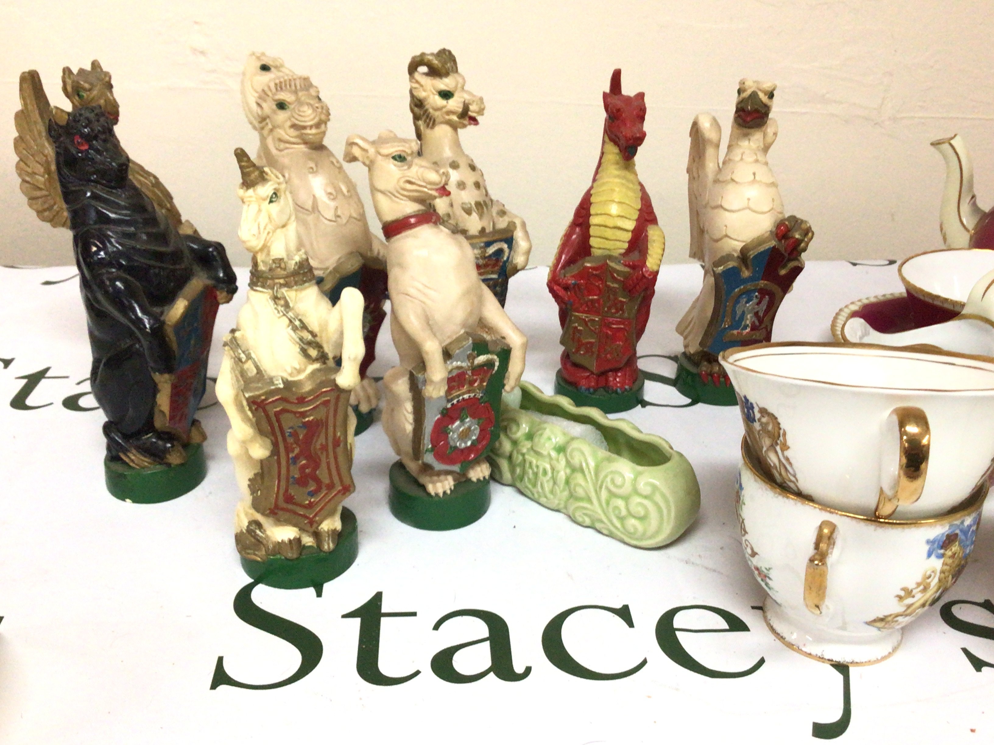 A collection of plaster Dragons and other mythology animals bearing coats of arms. A Spode tea set and a collection of Elizabeth II Royal commemorative coronation cups and saucers.